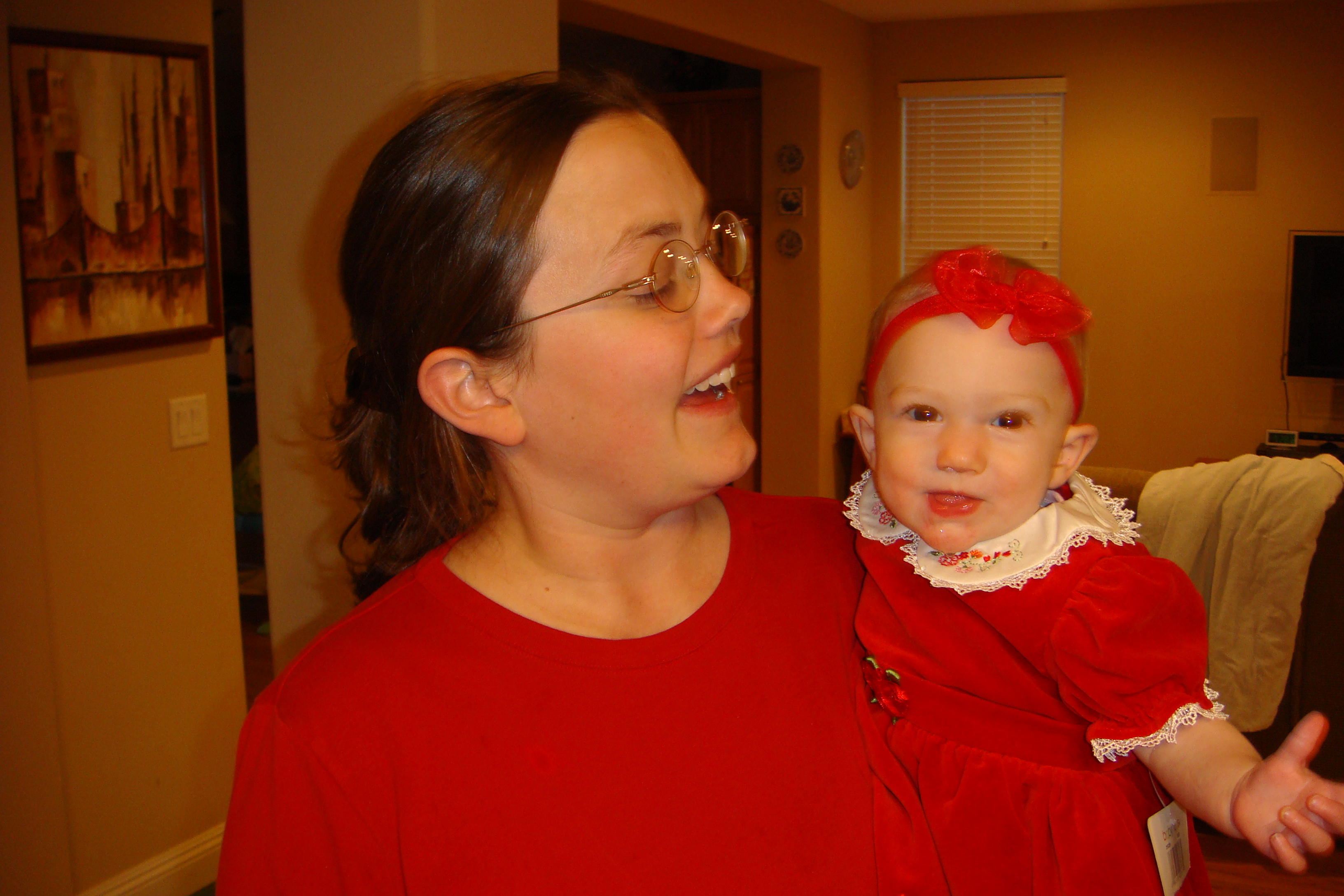I got in the mood again for dressing up Savannah in different outfits. Here are some pictures. Notice the tag is still on this dress. It's like, the snazziest dress she has, so I thought I'd put it on her and take a few pictures. Red isn't really her best color, but it's a really cute dress with the embroidered flowers on the collar. Another motivation I had was that I want to get a nice portrait-looking picture of her to frame up in the stairway.