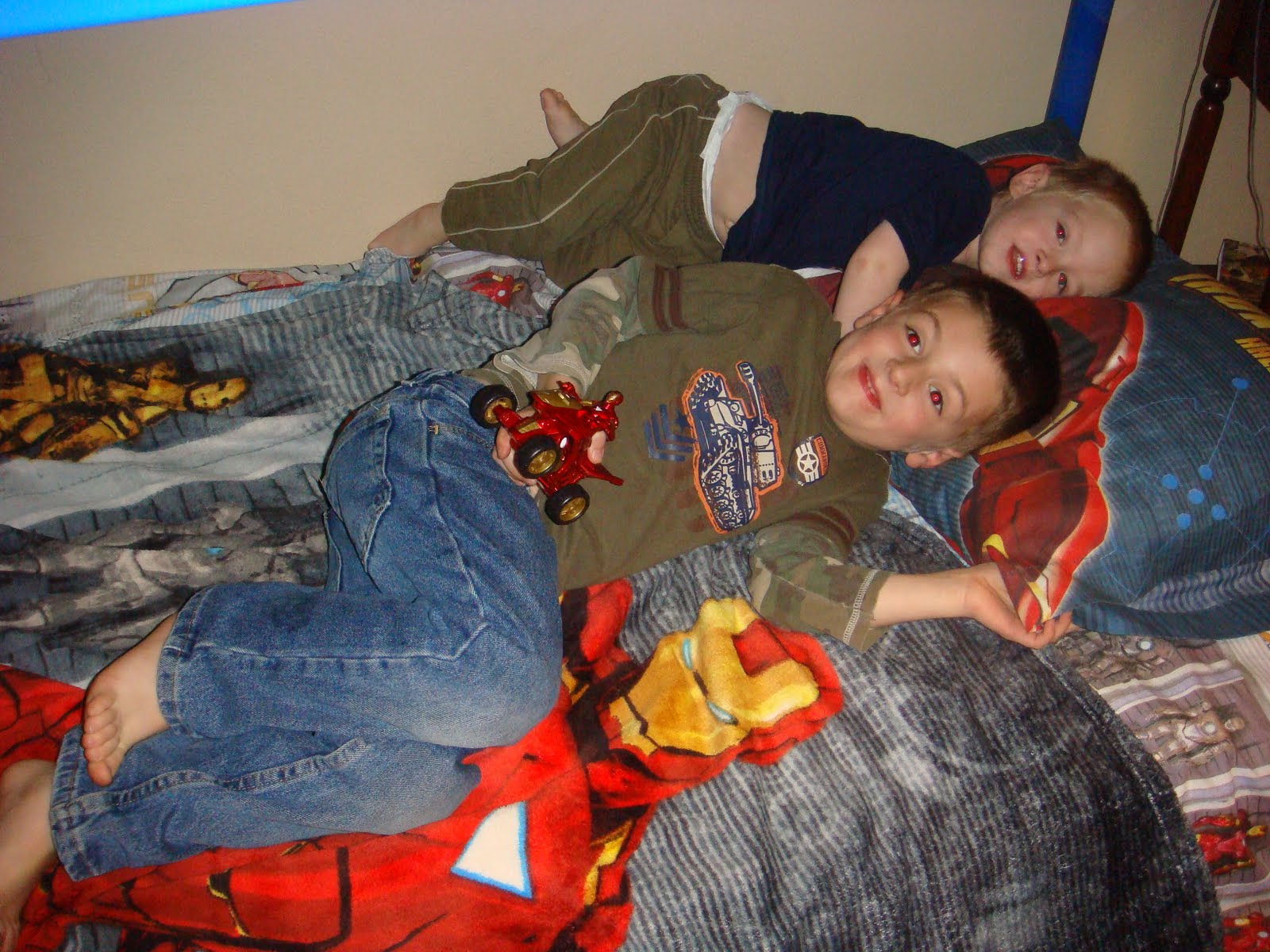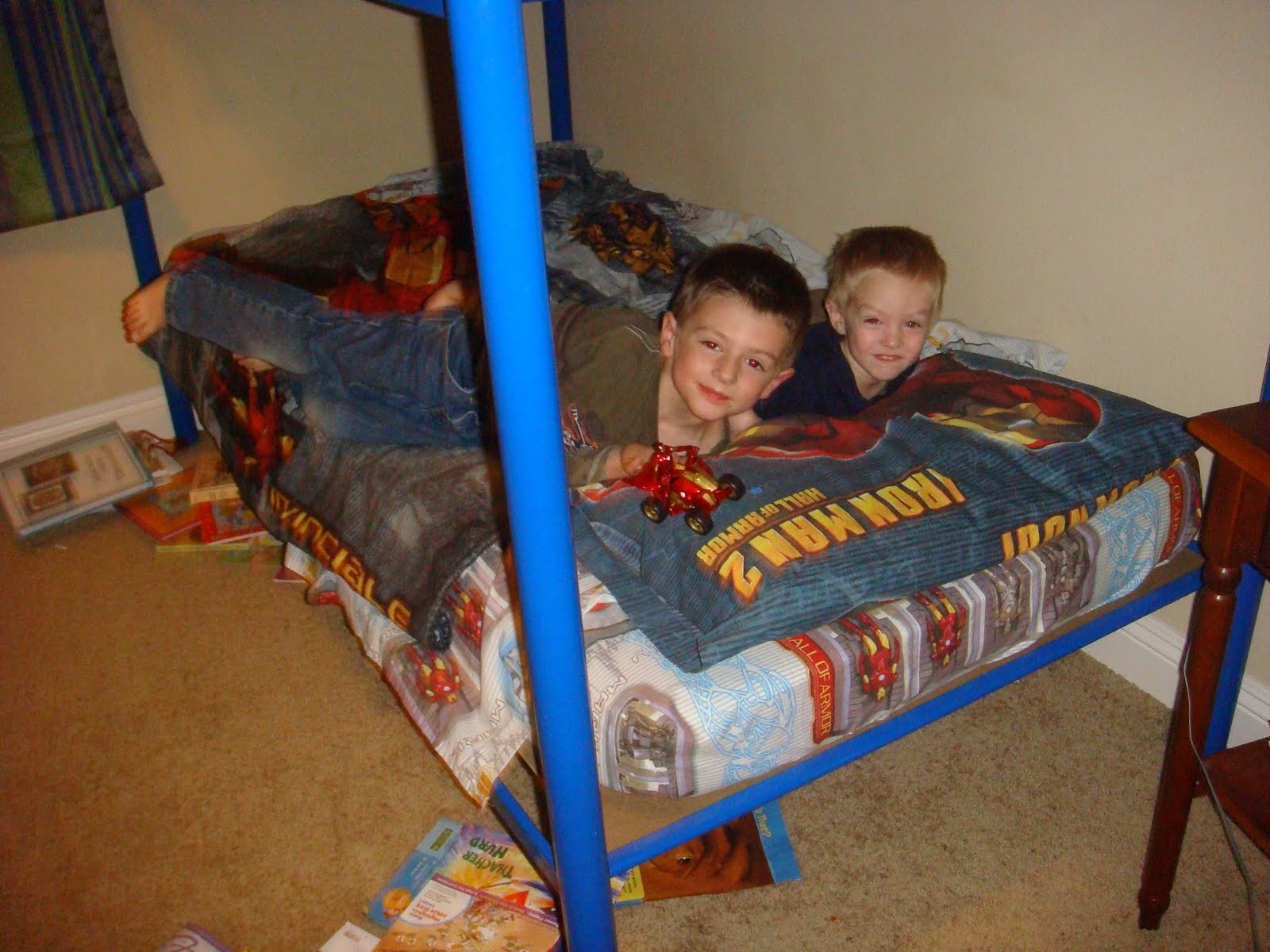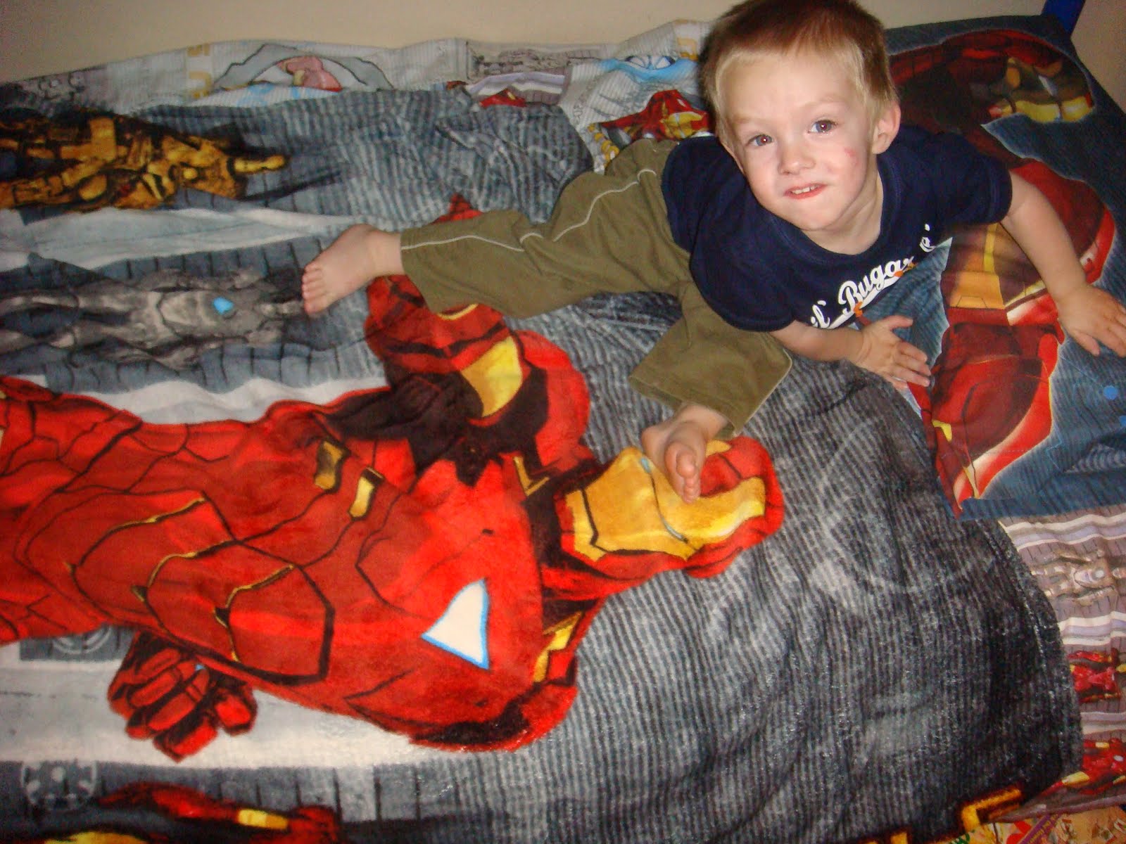 Here are the new ironman bed sheets and blanket on Carson's bed. When Carson opened up his presents and saw the Ironman toy, he gasped and said, 'Whoa, I've been wanting one of these for a long time!' Thanks for the birthday presents, Grandma Bea and Grandpa Gene!