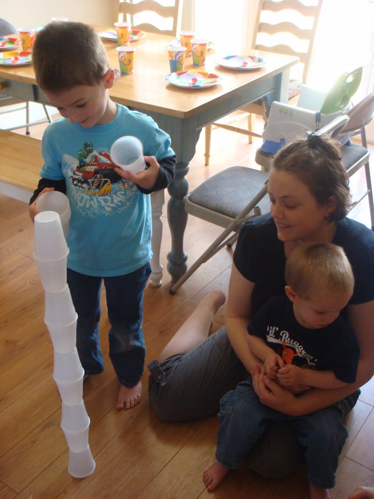 We played with baloons as friends arrived, and later played a cup-stacking game.