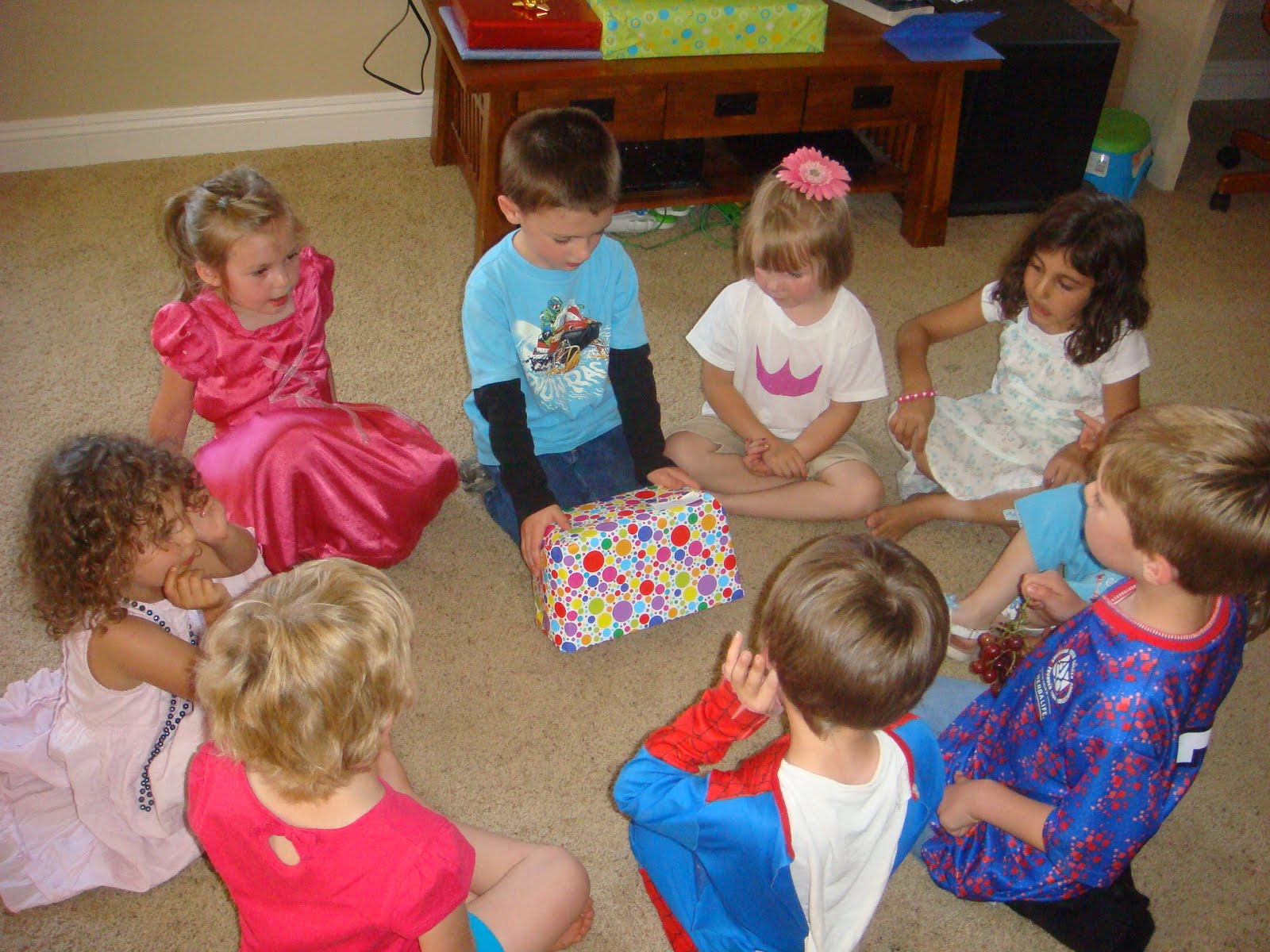 Carson sits next to his presents while his friends play outside. He couldn't wait to open them!