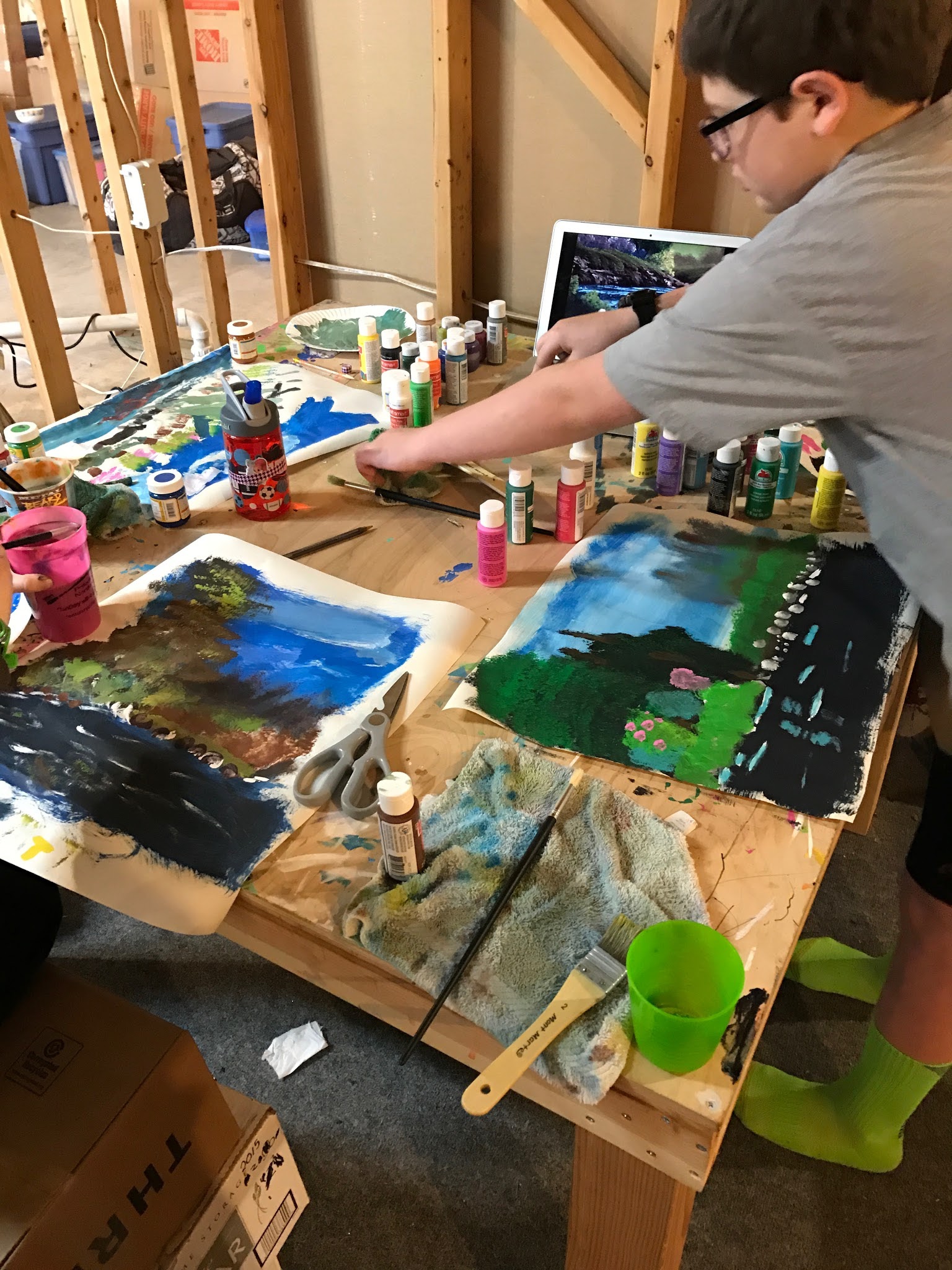 The kids have done two Bob Ross 'classes' so far. We have this craft table in the basement, so the kids watched a Bob Ross episode and painted along with him.