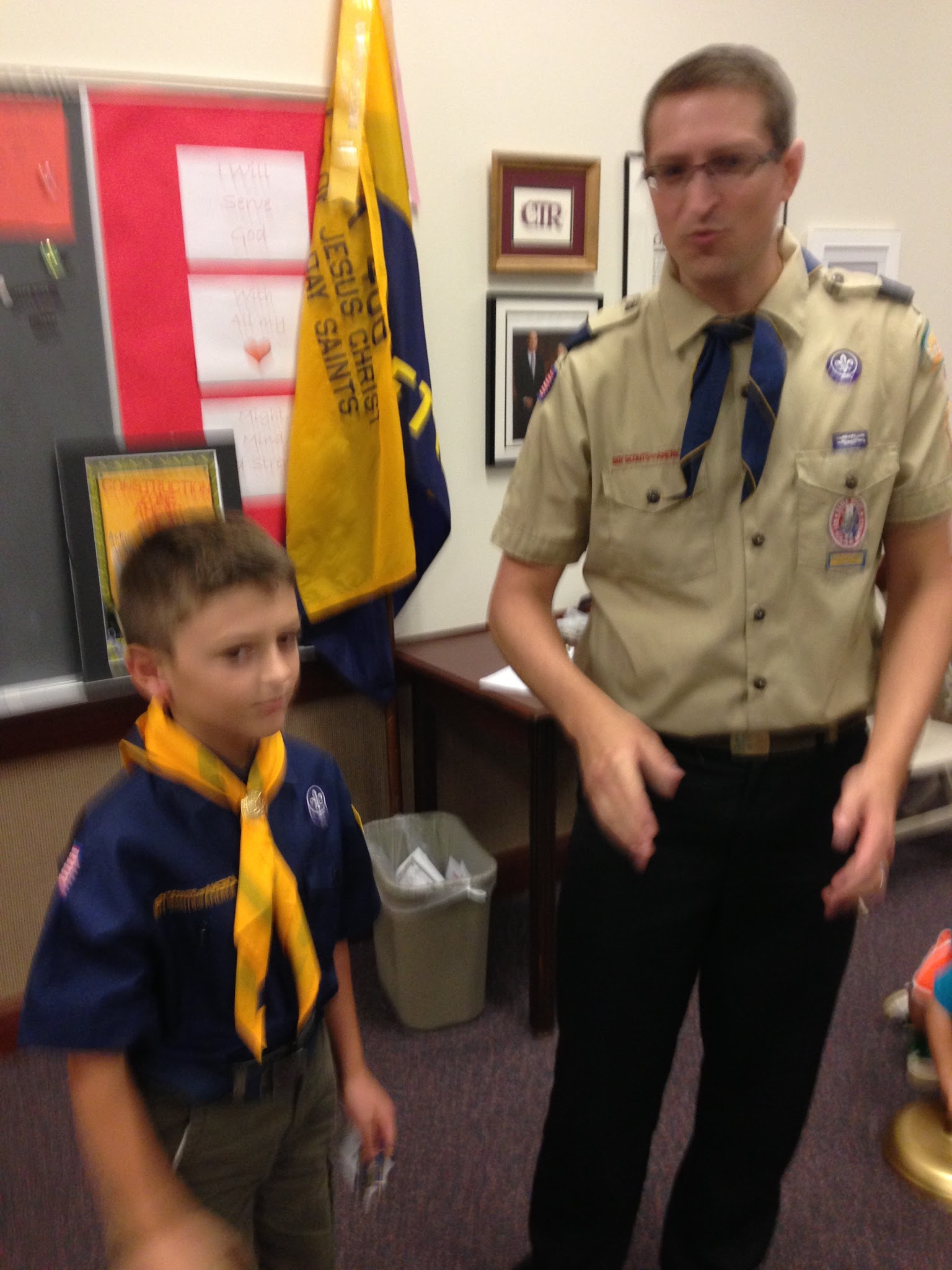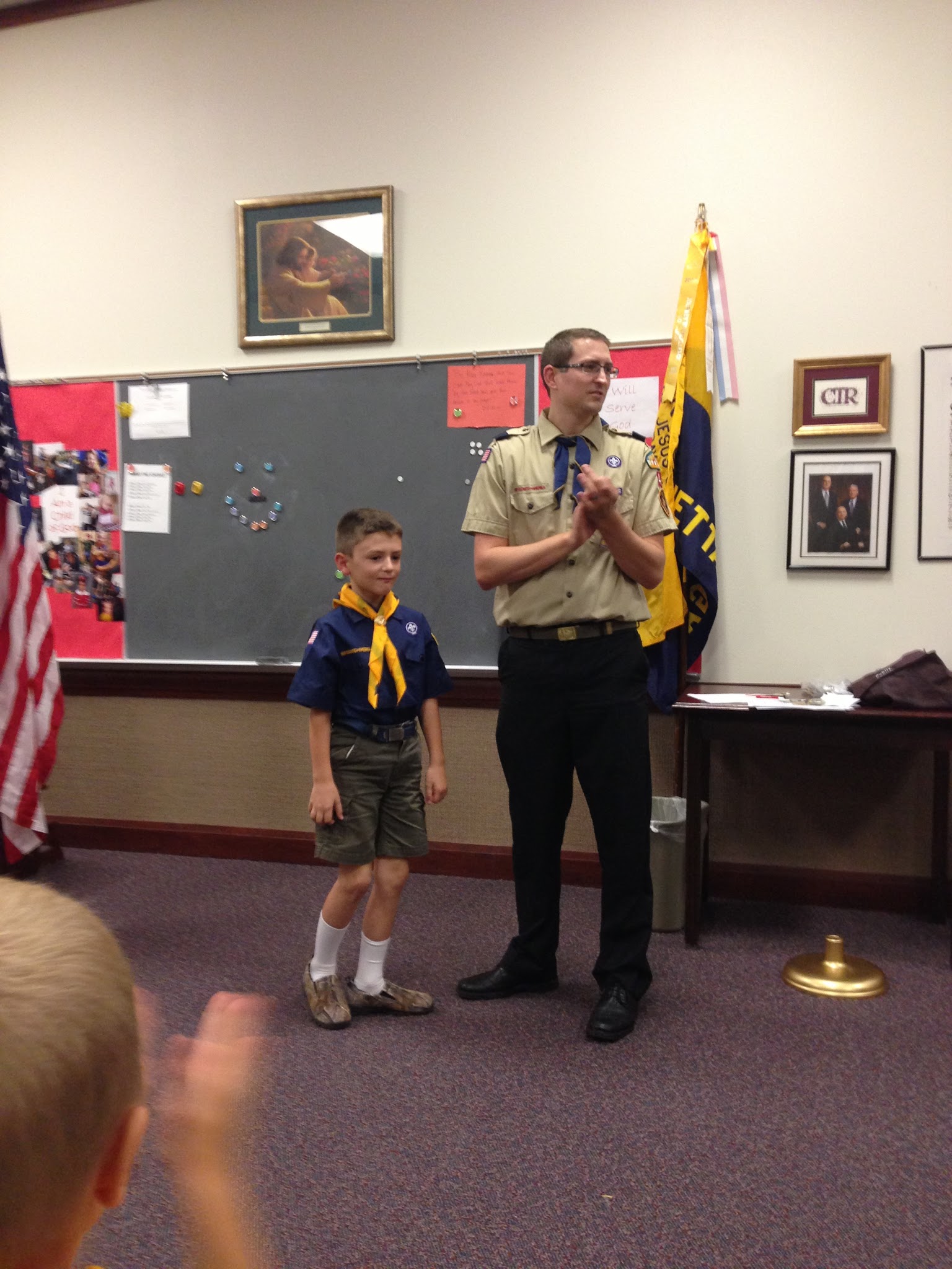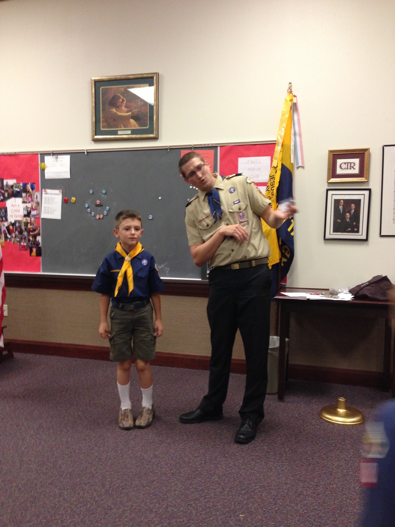 This is Carson at his pack meeting last Tuesday, standing with the Scout Master.