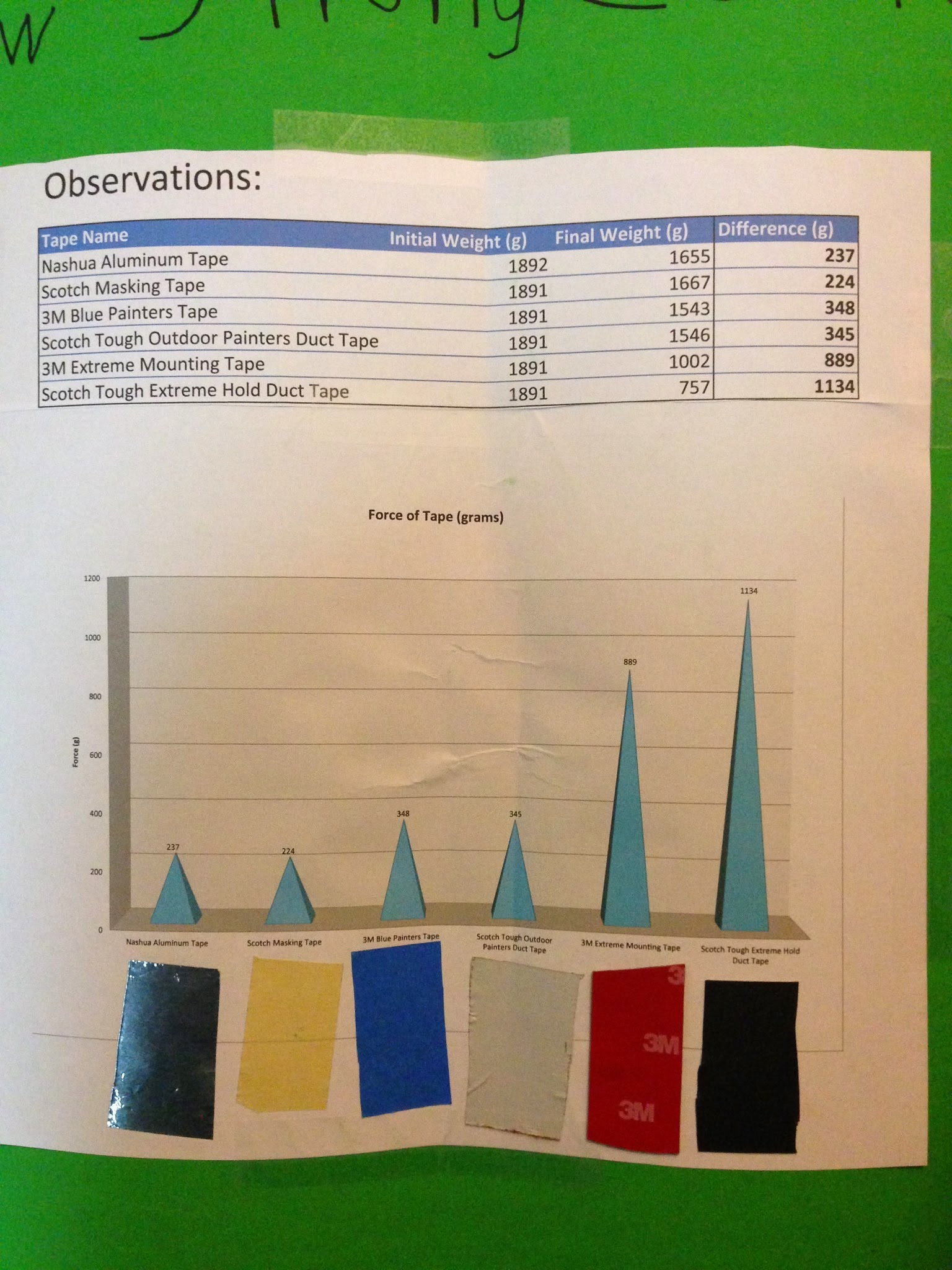 So we choose to measure the strength of the different types of tape we had in the garage. We taped a loop of fishing line to a cooking scale with a 1" square piece of the tape. Then placed a weight on the scale and measured the difference between the starting weight and the weight at the moment the tape pulled off of the scale.