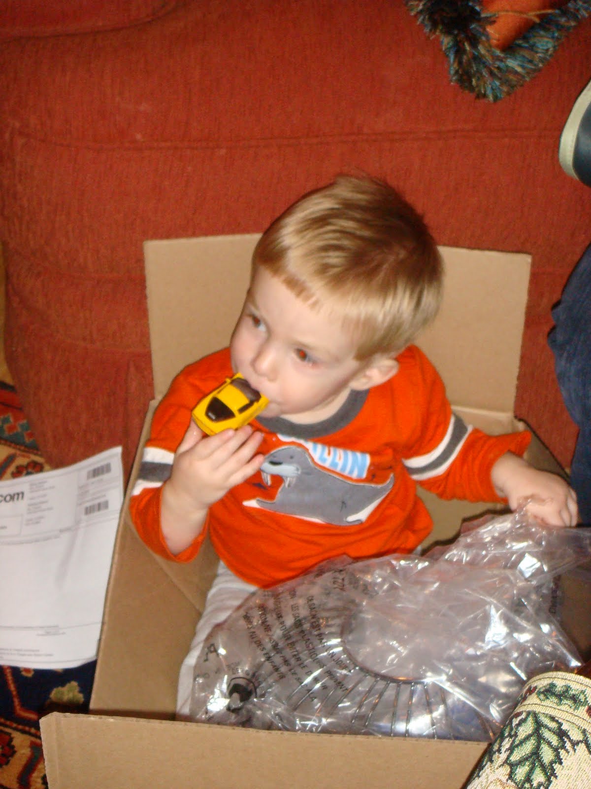 Tucker enjoying the packaging after opening presents.