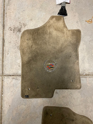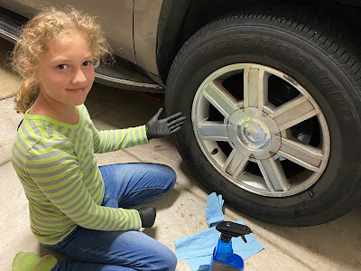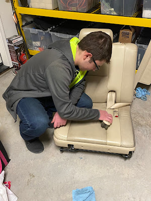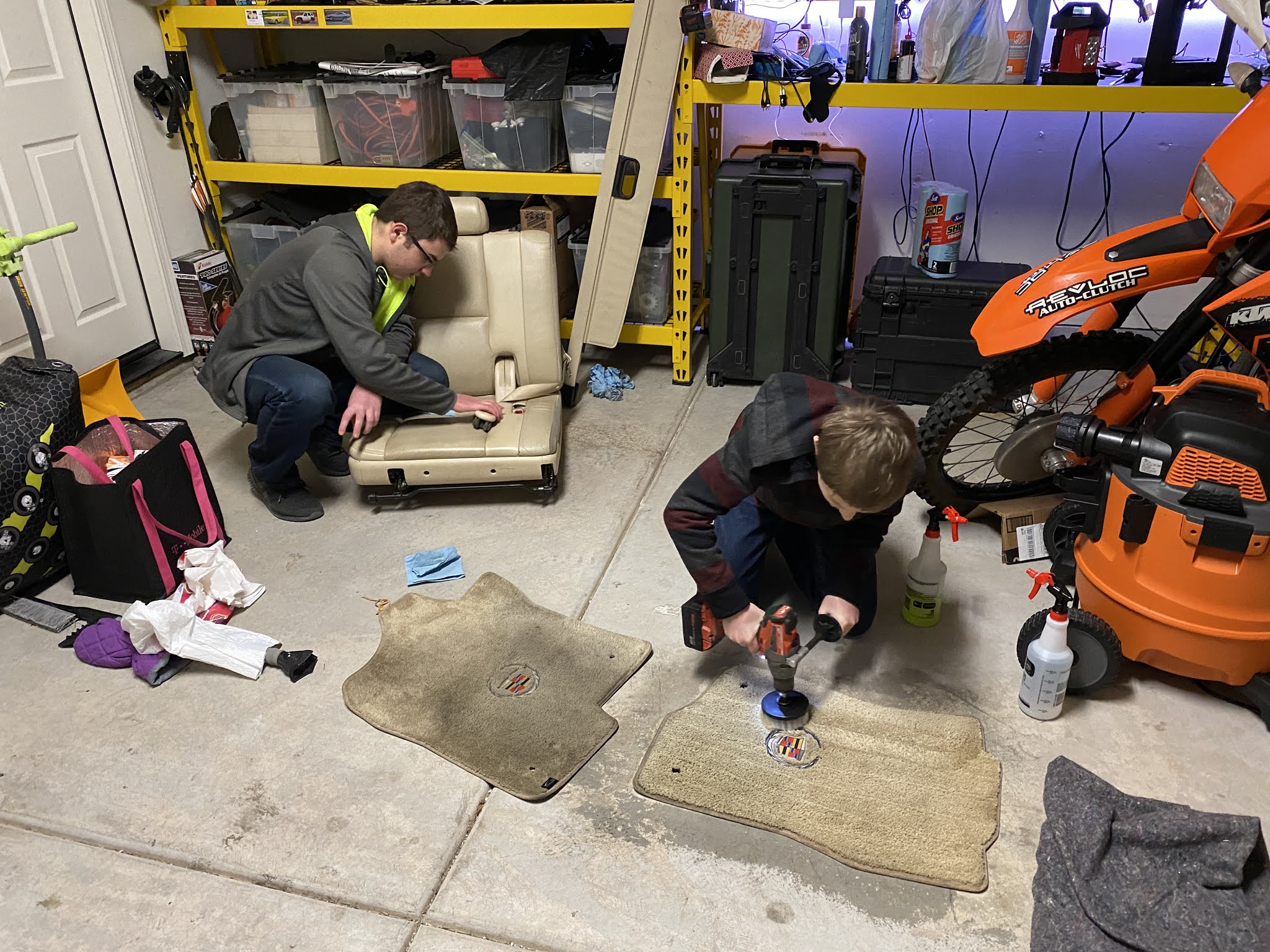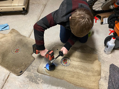 Keith and the kids finally decided to take on the task of giving the Escalade a deep clean. You can see Tucker is using a special brush attached to a drill, and he's using that to work the special soap into the carpet. It took many hours and many applications of soap and water to get most of the dirt out.