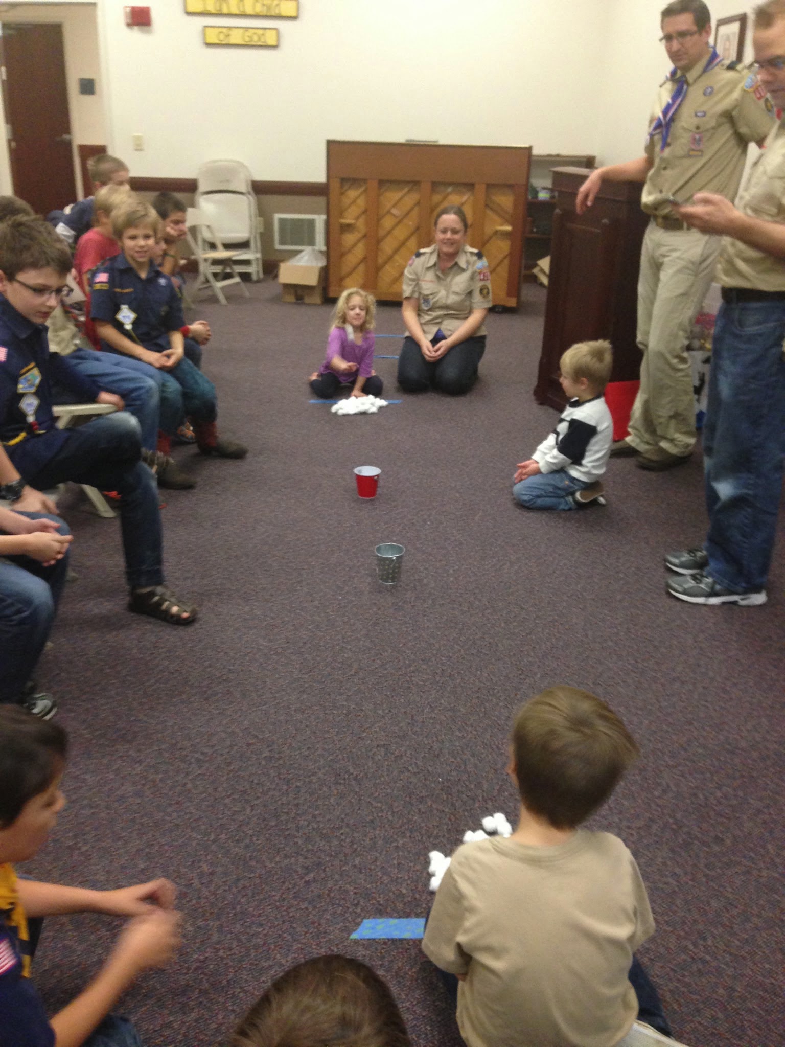 Savannah was in the cotton ball toss and she actually landed a few in the cup.