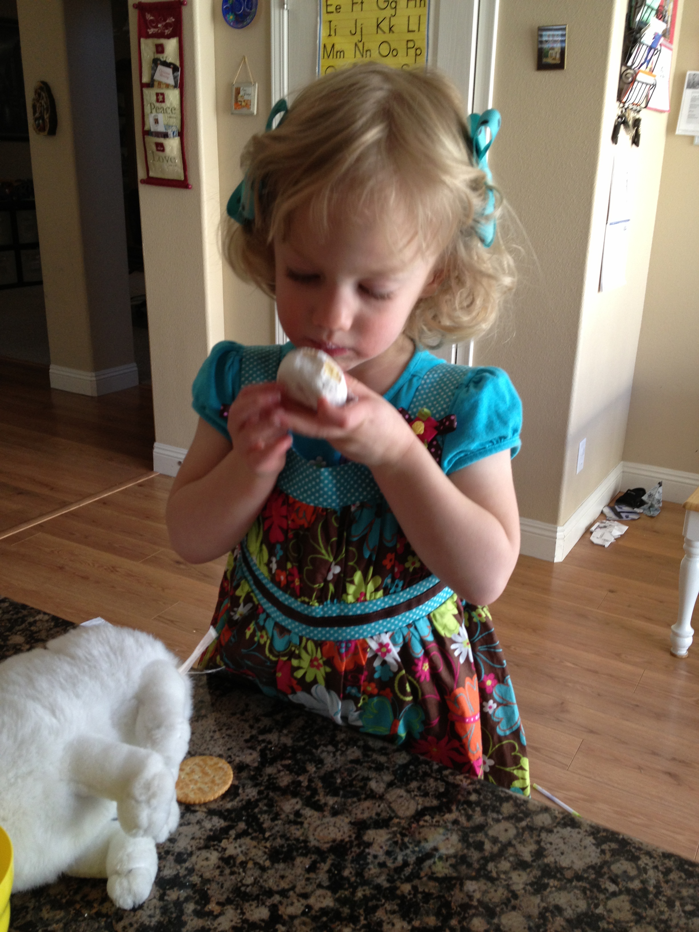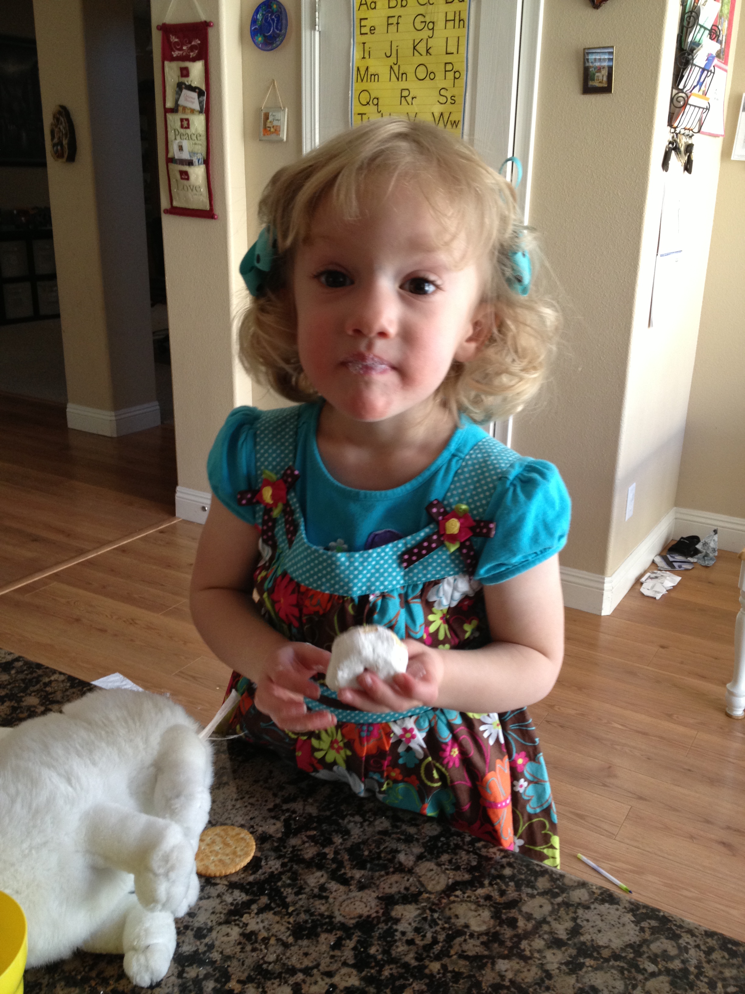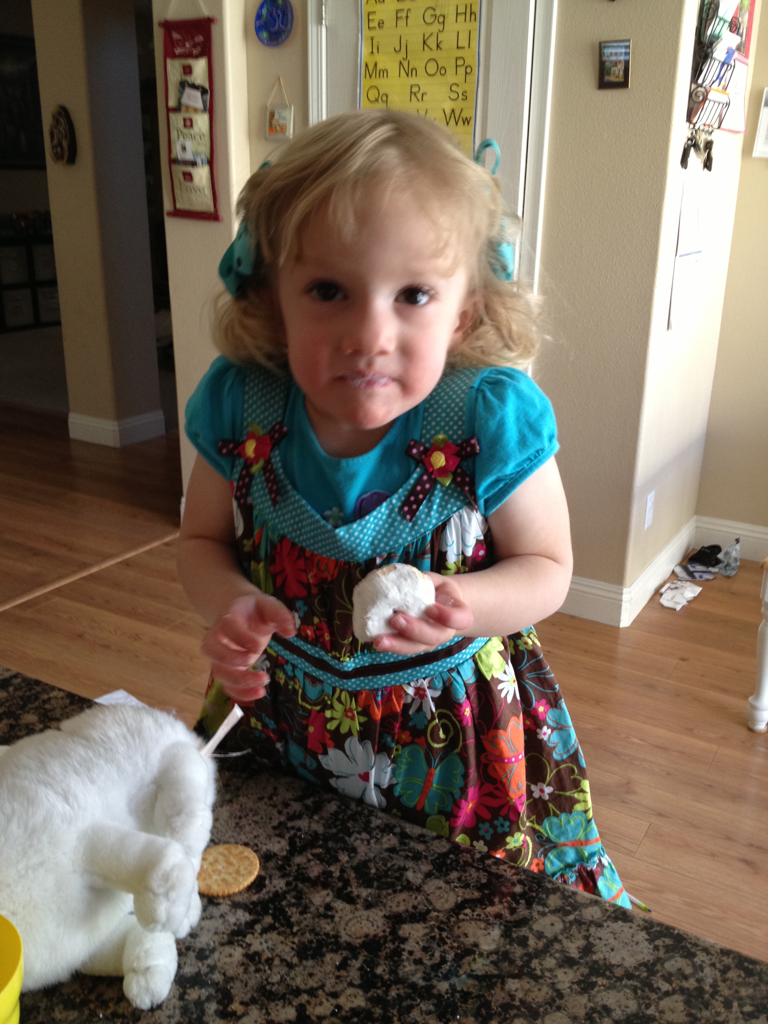 Savannah in a new dress, eating a powdered donut.
