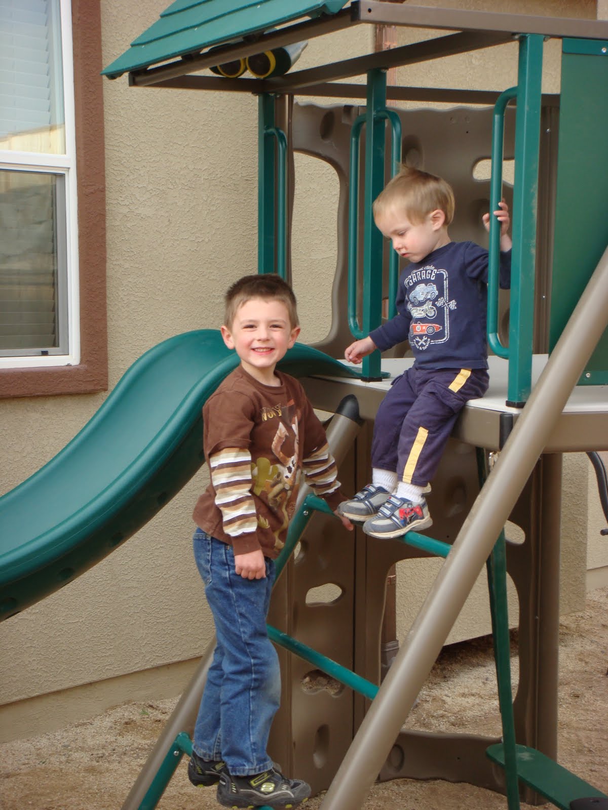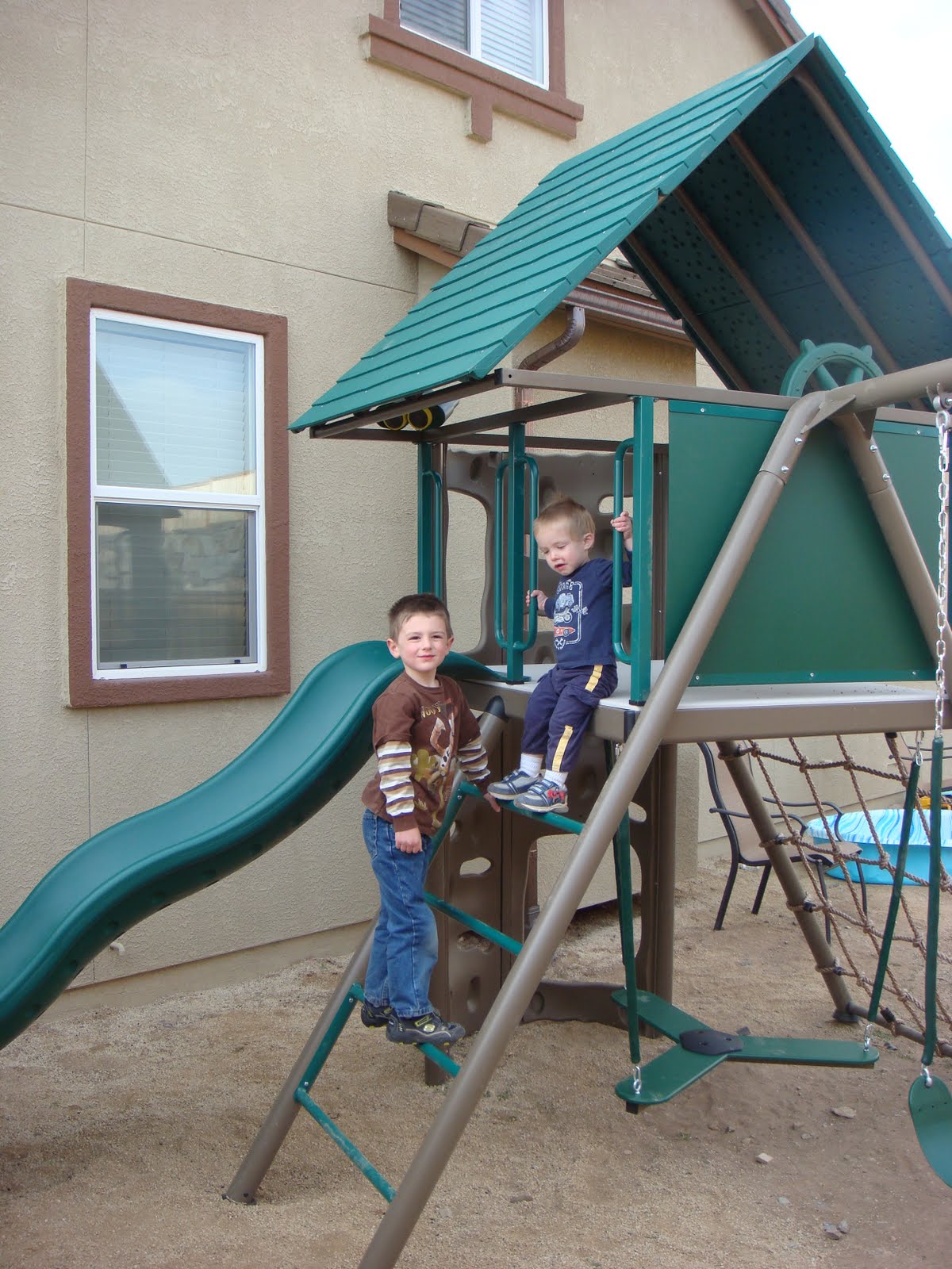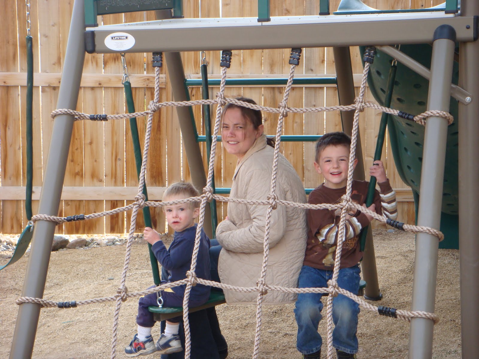 Here are some shots of our new swingset - it's done! The thing we're all sitting on under there is this cool three-sided swing thing that's nice and low for Tucker to sit on.