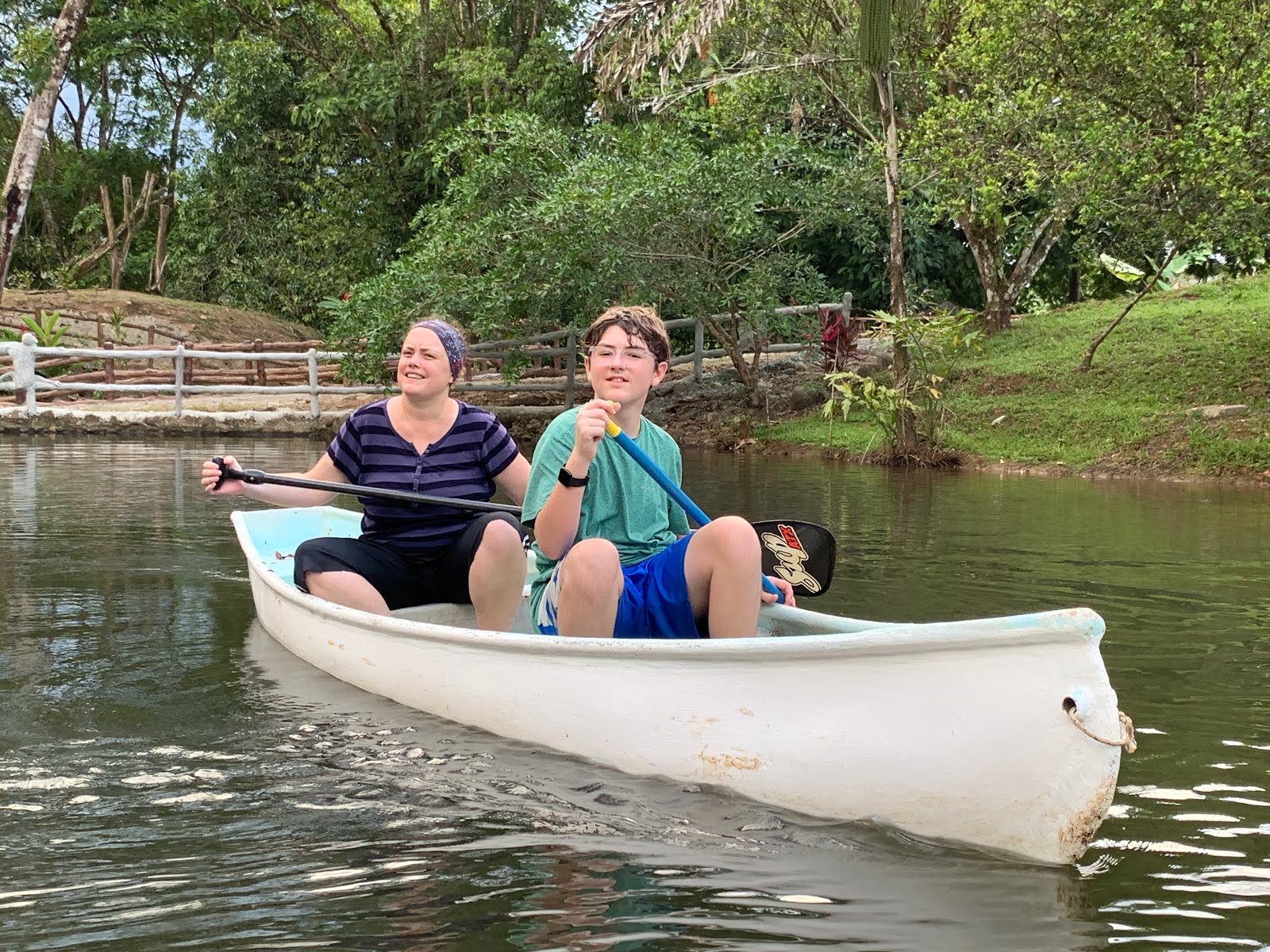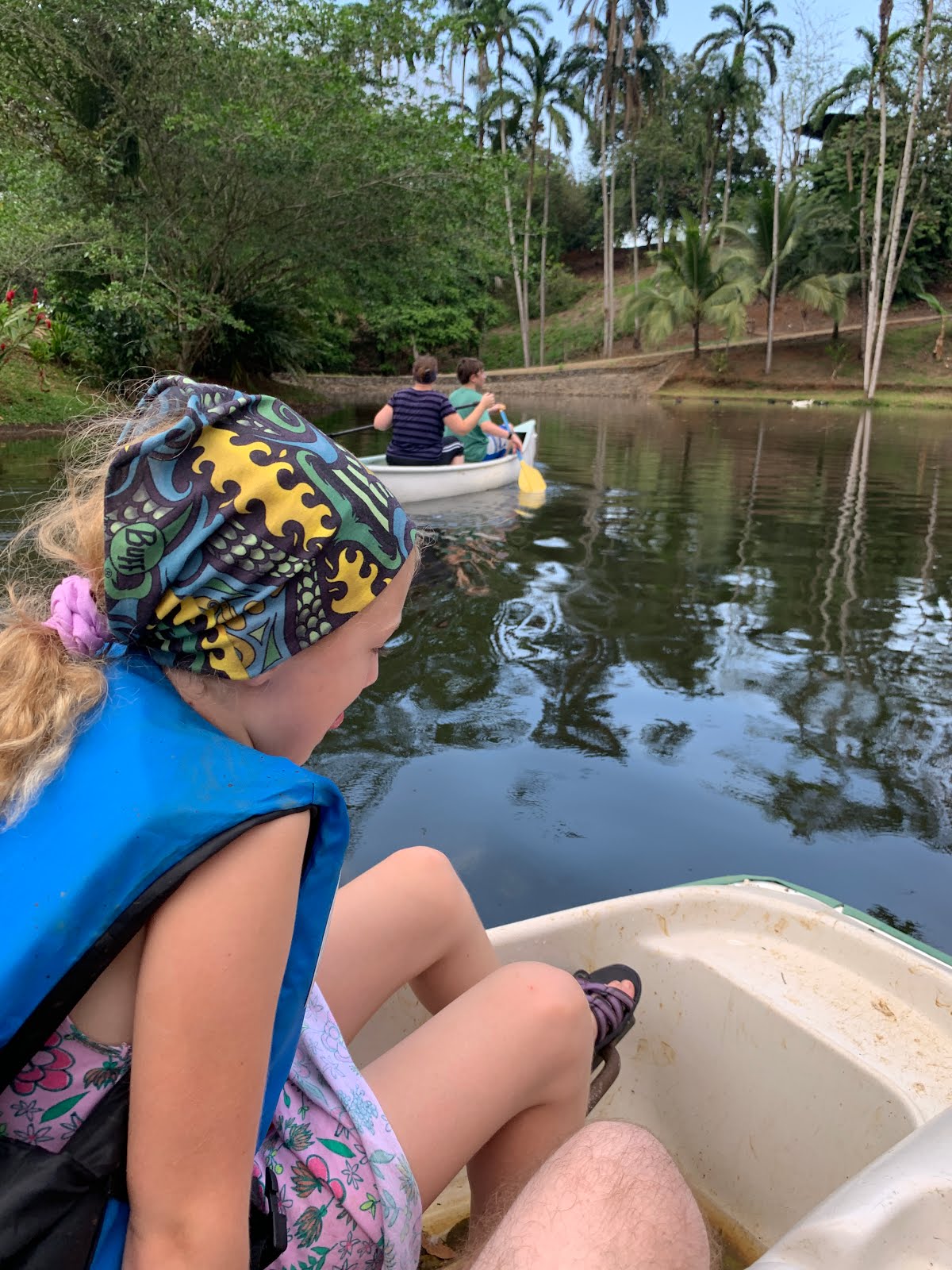 They had a paddle boat and a canoe. So Carson and Angela took the canoe while Tucker, Savannah, and Keith road in the paddle boat. They weren't fancy, but did the job. You can see the restaurant above the pond.