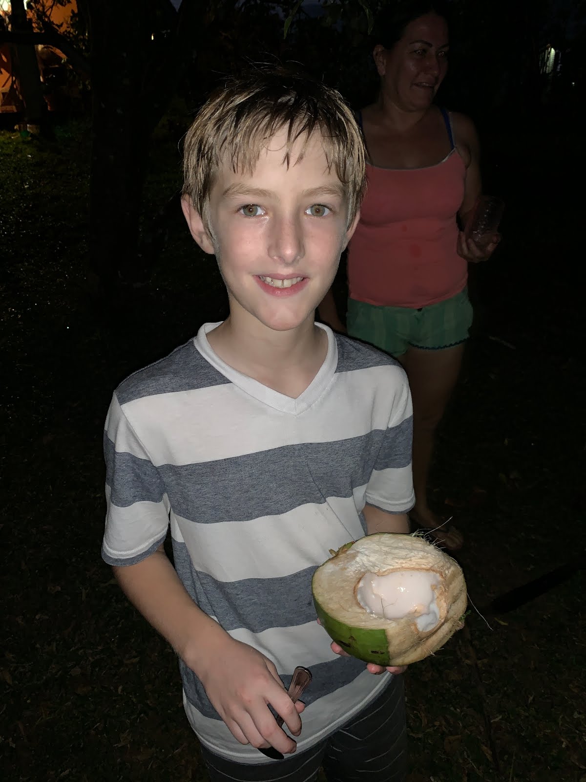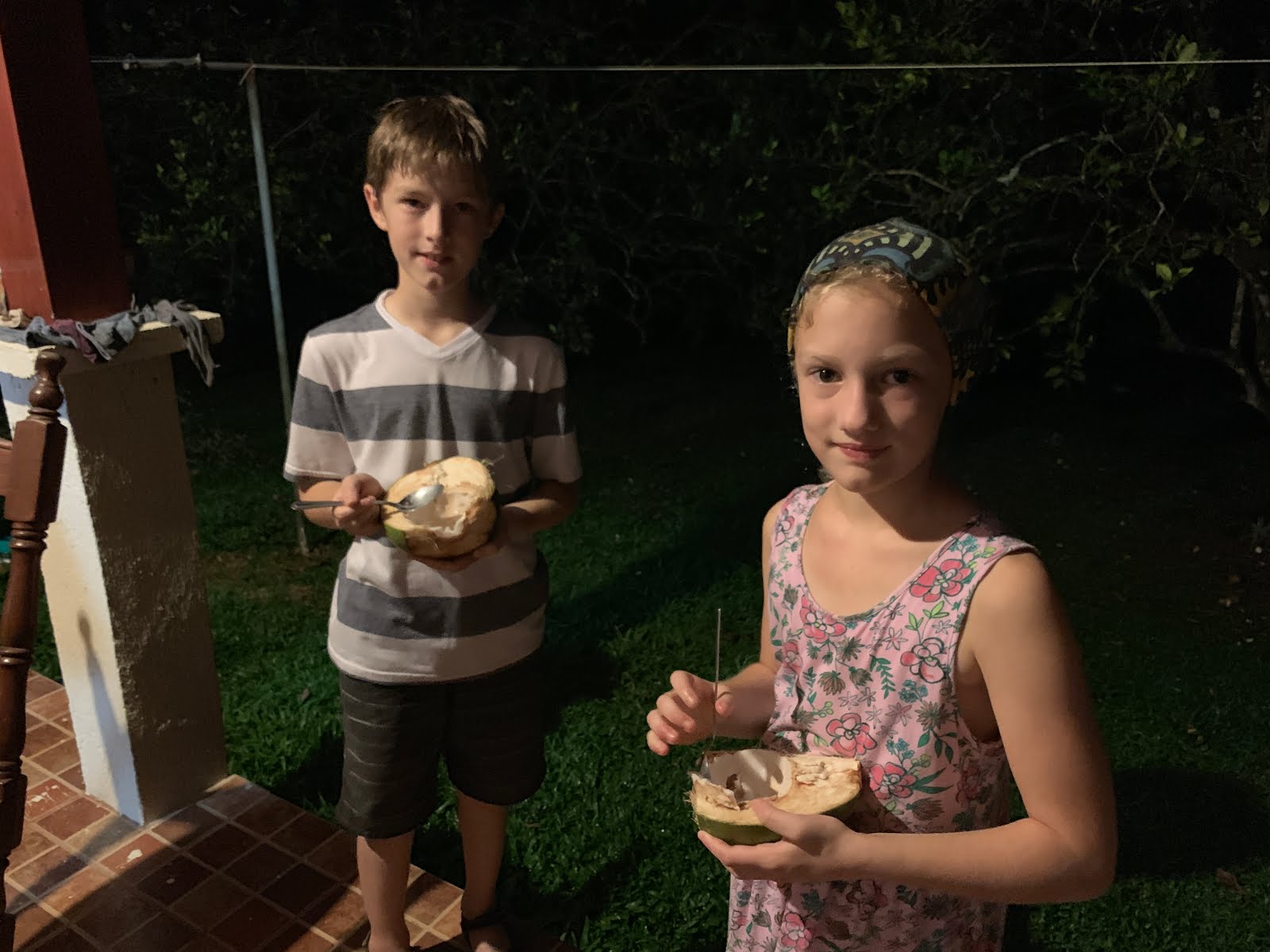Afterwards, we stopped by our neighbors house. He knew the kids wanted to cut a pipa (similar to a coconut, but with more water and less coconut in it) from a tree and eat it. So he cut one off of his tree and let Tucker and Savannah have it. His wife poured the coconut water into a pitcher, then poured it into cups for us. We had a good time talking with his wife and daughter while they ate.