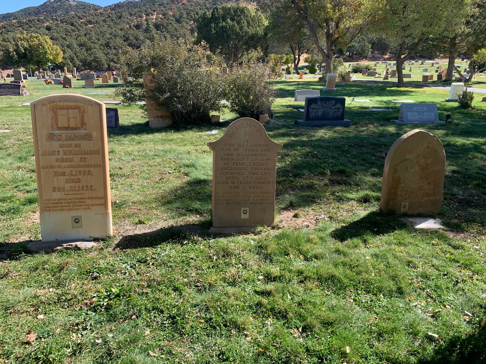 These tombstones (from left to right) are Ann Aldred, John Williamson, her father-in-law, and James Williamson, her husband. Ann and James are my 3rd Great Grandparents.