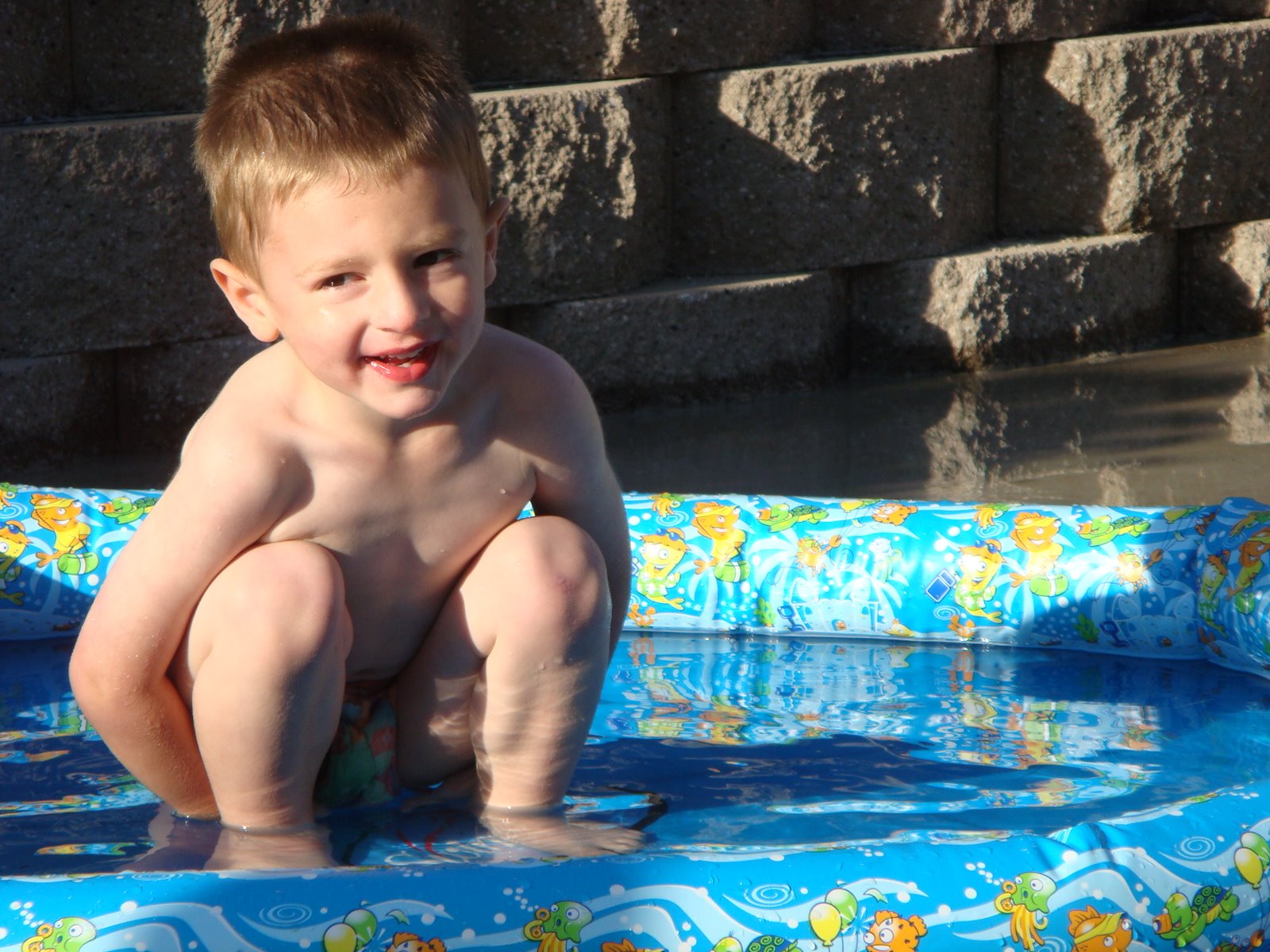 We forgot Carson's swimming suit, but that wasn't enough to keep him out of the water. He borrowed his cousin's pink swimming diaper.
