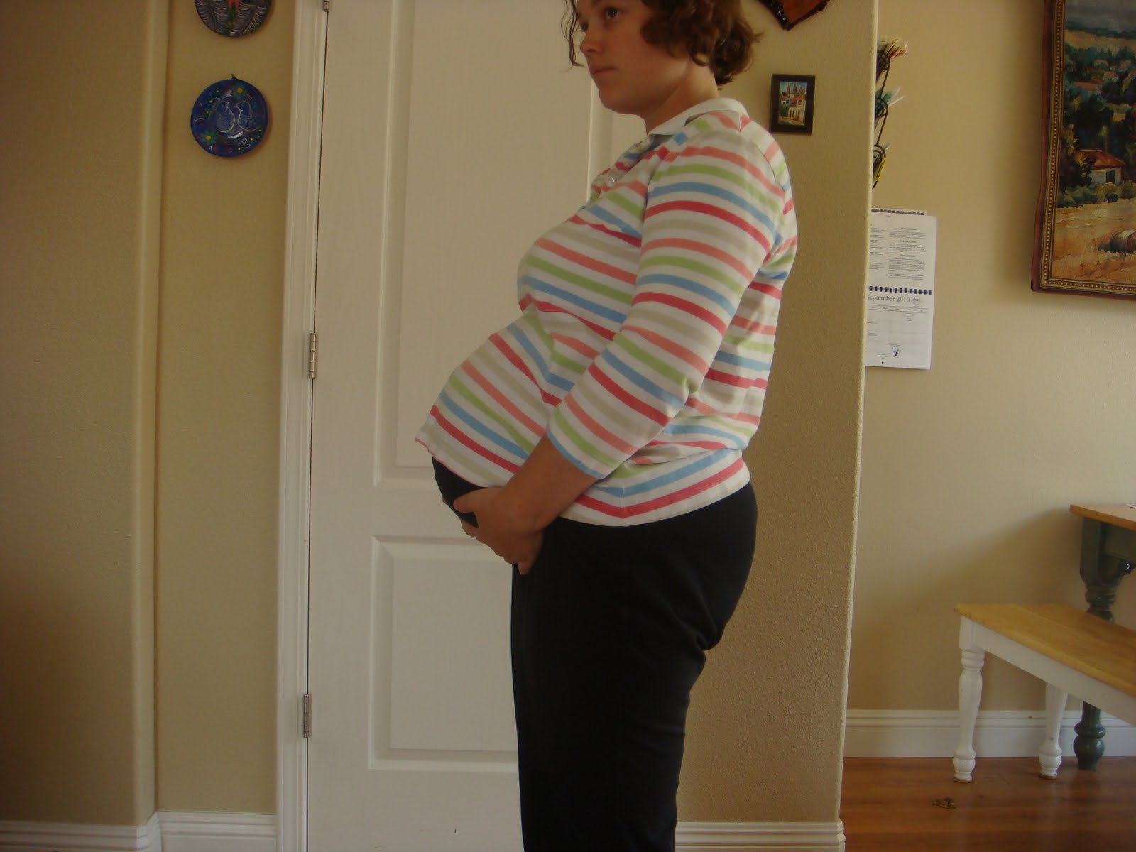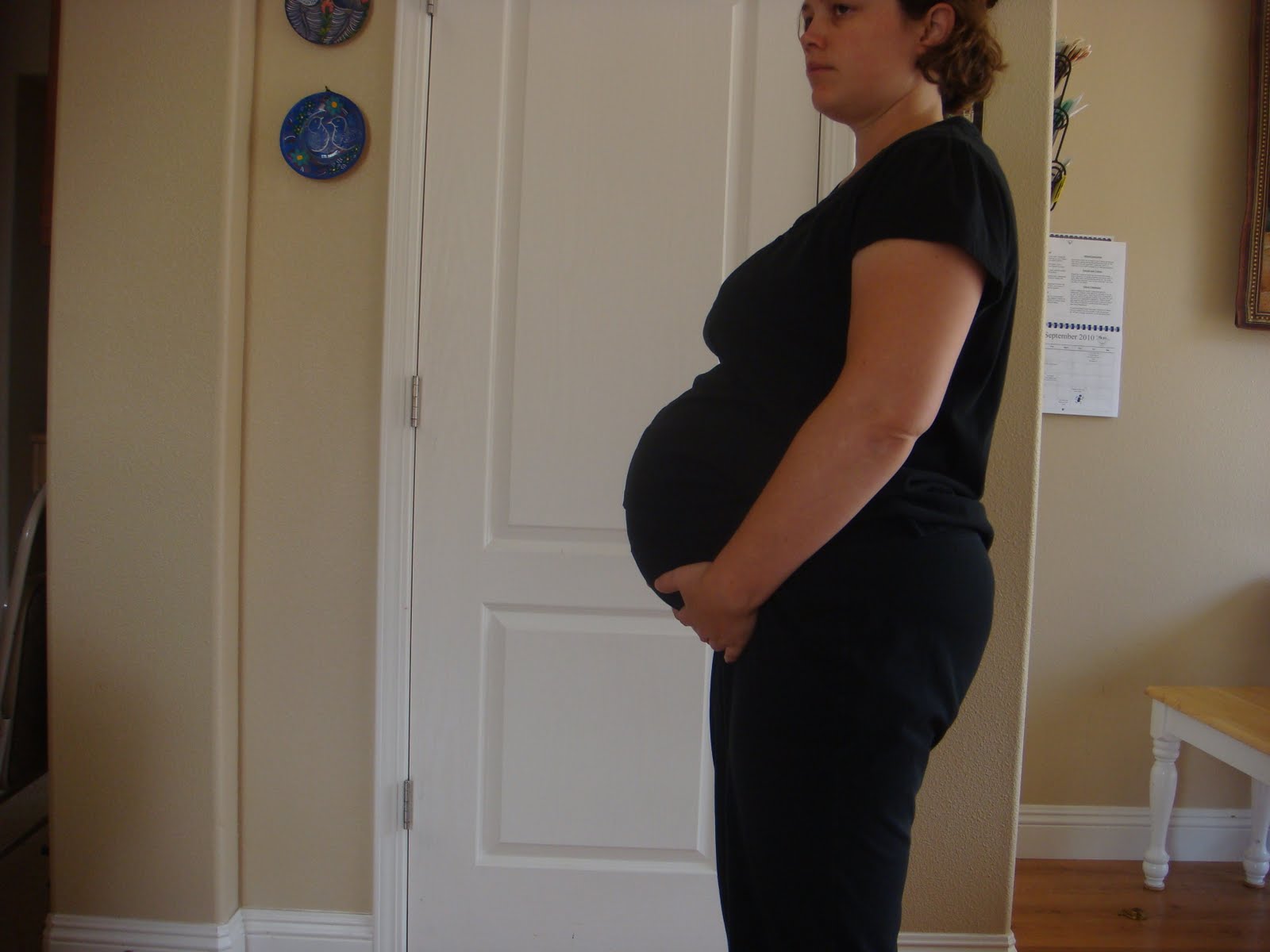 Ok, I posted three pictures of me cause clothes made me look different and I was slouching in one picture, but whatever. (I say 'whatever' constantly now, just in the last few days. Why?) You get to see three pictures of my bigness at 37 weeks. Things are getting really heavy and the baby still moves quite a bit, and it hurts! I grimace and suck in my breath all the time now when standing up or moving in any way. I've noticed the baby likes to 'sit' on my right side, I can see in the mirror that my belly is bulging more on the right side than on the left. The baby sits way low, and always has. I have no smashing of the lungs, except when I lay down and my head isn't elevated. So it's just smashing of the bladder and probably intestines!