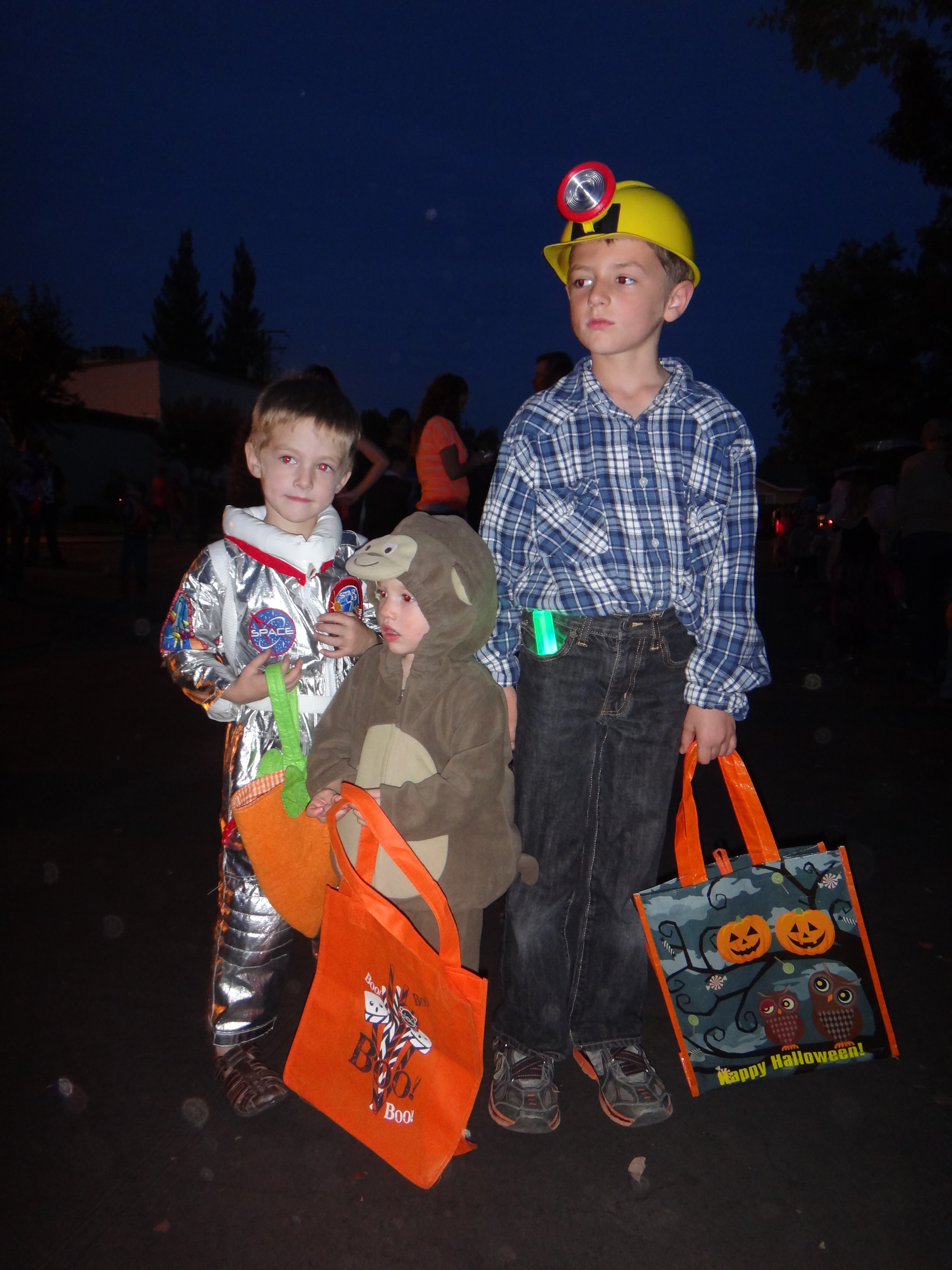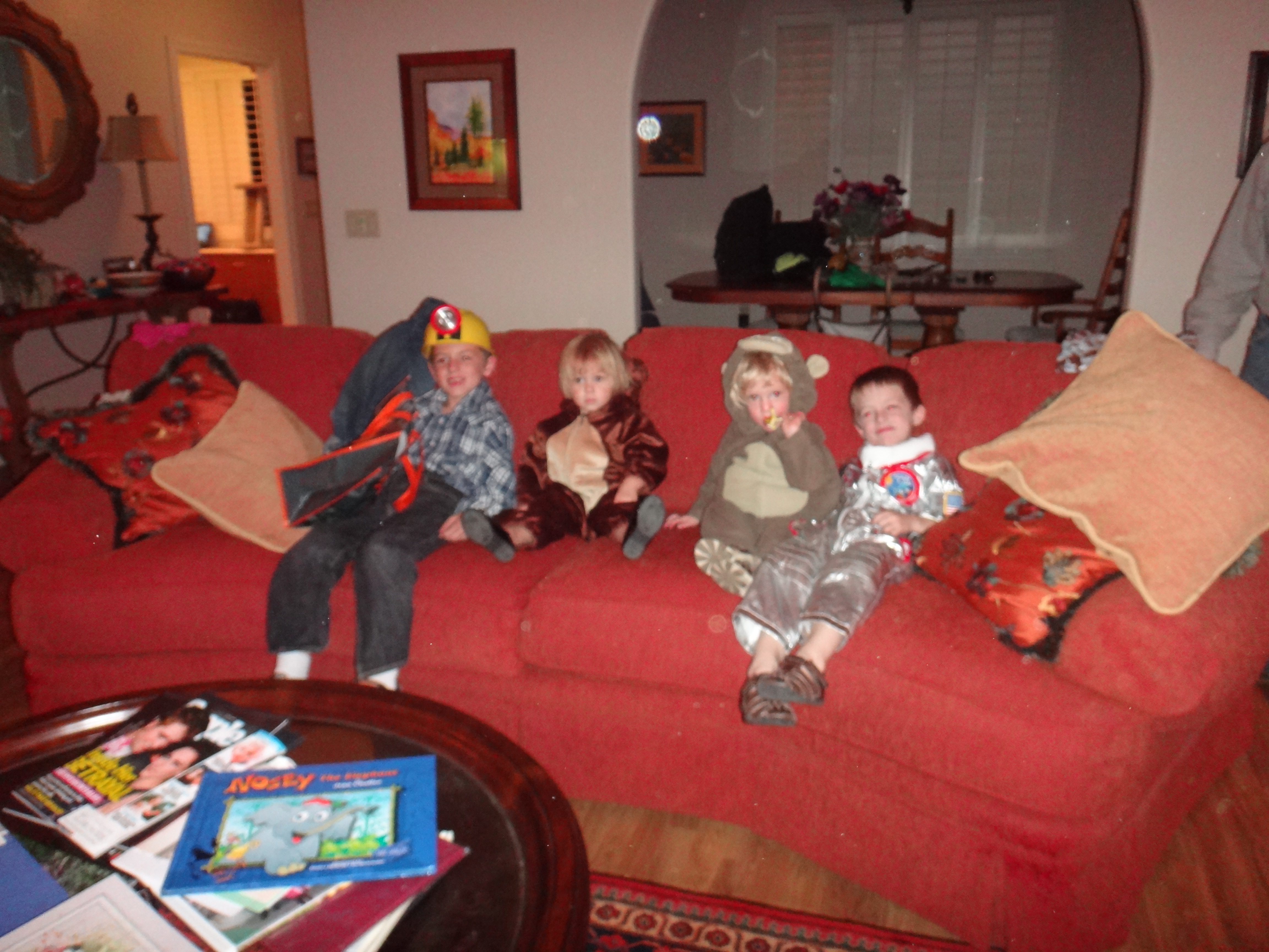 I'm not the best picture-taker, so this is what you get from our trick-or-treat night! Carson was a miner/prospector, Tucker was an astronaut, and Savannah was a monkey. We went out with Haven, who was a horse. You can see in the couch picture that they are all wiped out!