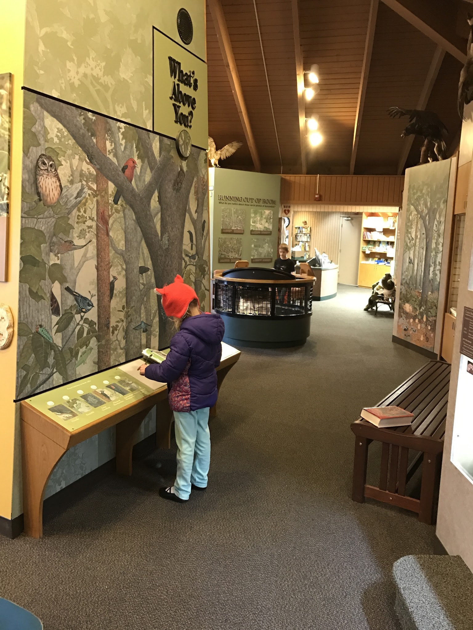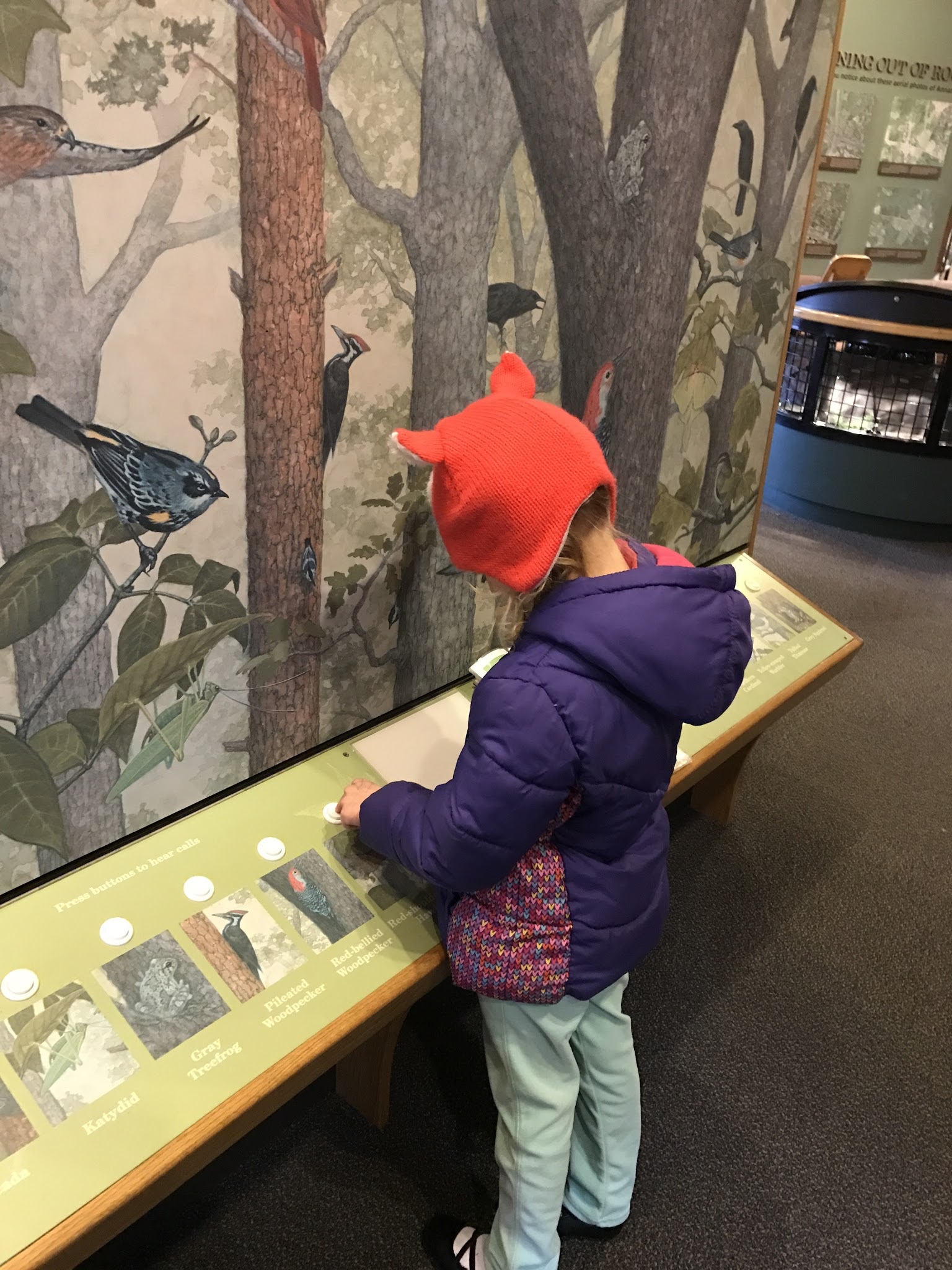 Savannah's at the 'what's that sound' button station, where she can push a button and hear the sounds/calls of different birds and insects and animals