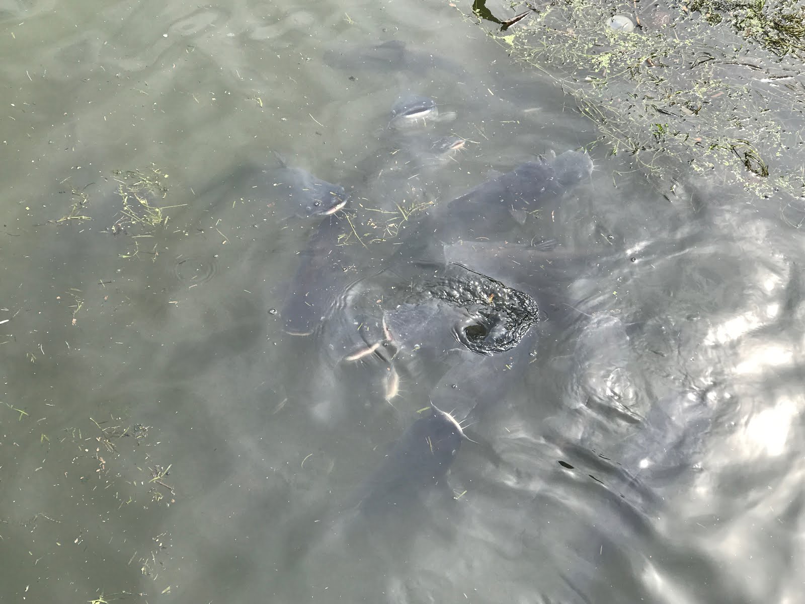 If you look closely, you can see a lot of large catfish in the water.