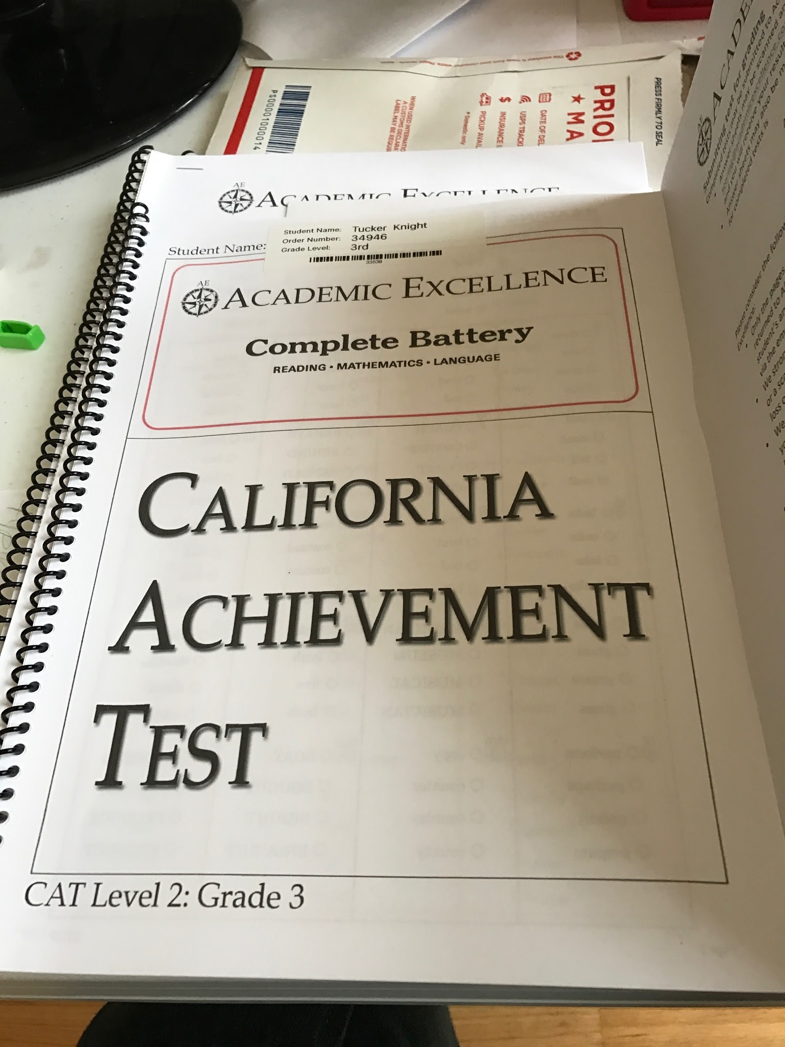 Every state has different laws regarding homeschooling. Virginia requires homeschooled students to take a standardized test at the end of the school year to prove progress. We ordered ours online and they came in the mail. The boys will complete their tests next week and I'll mail the answer sheets back to the testing company and they send us a complete score. Then I send the scores to the Home Instruction Office here. Savannah has a different test called the Terranova, since the CAT isn't offered for 1st grade.