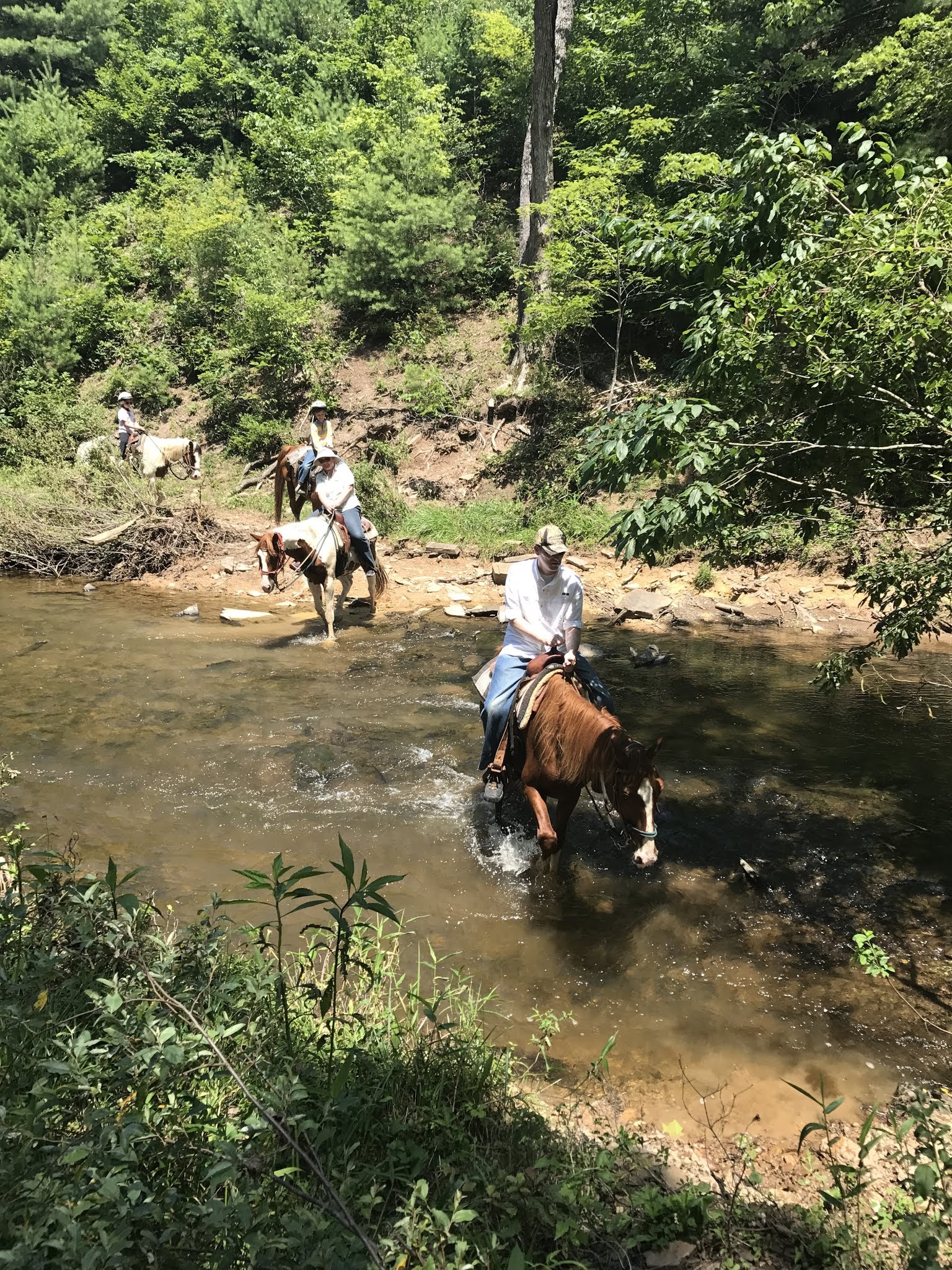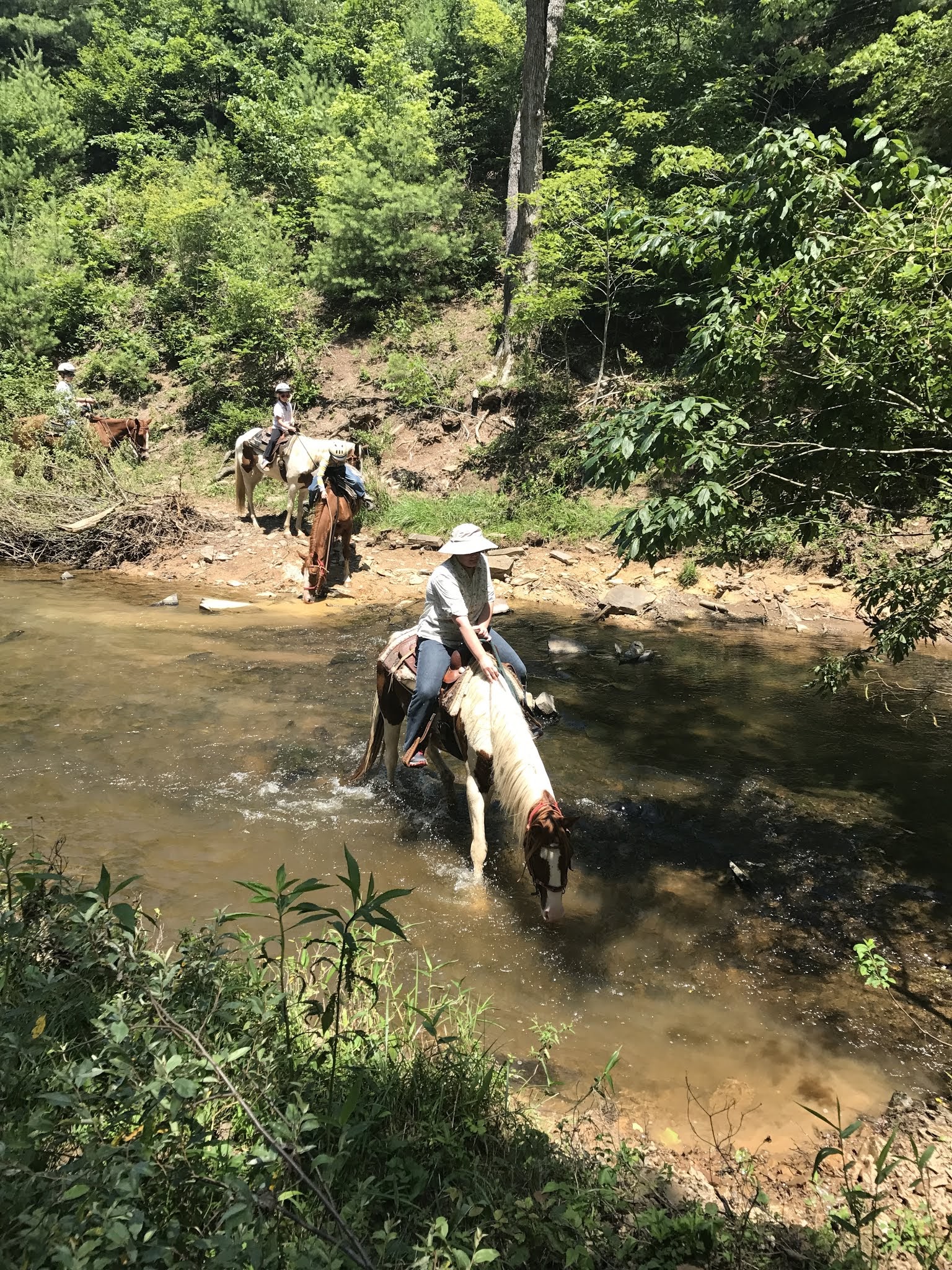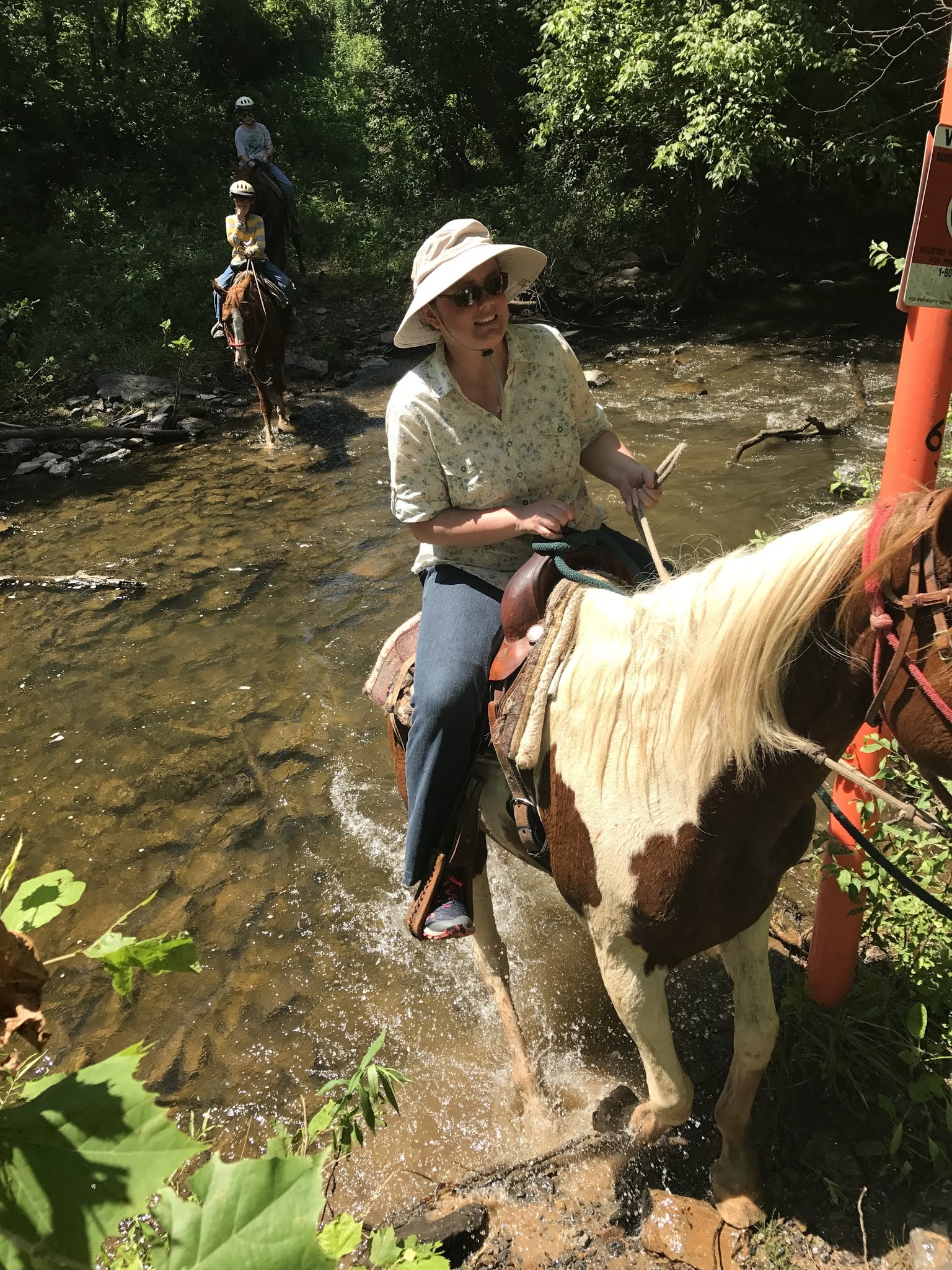This was a fun part - going over the stream. The horses wanted to stop and drink, but Bill told us not to let them! He mentioned something about horses getting colic. We also had to try to keep our horses from taking bites of foliage along the trail.