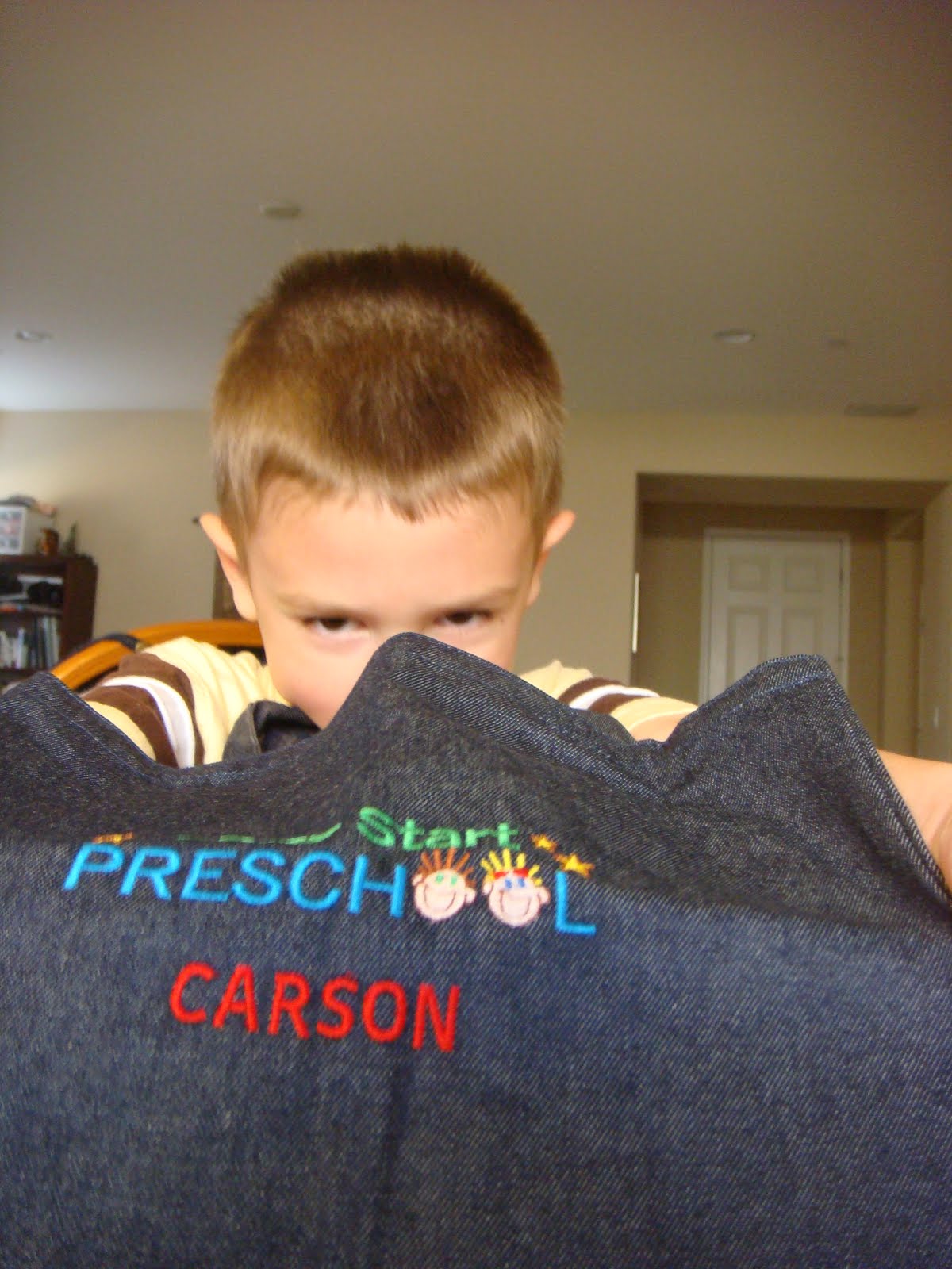 Carson started PreK today. That's him standing in front of Miss Heather's house, where she holds preschool. She made him his own schoolbag. It says, "Early Start Preschool', and even says his name! So he'll take it with him everyday and fill it up with the day's work.