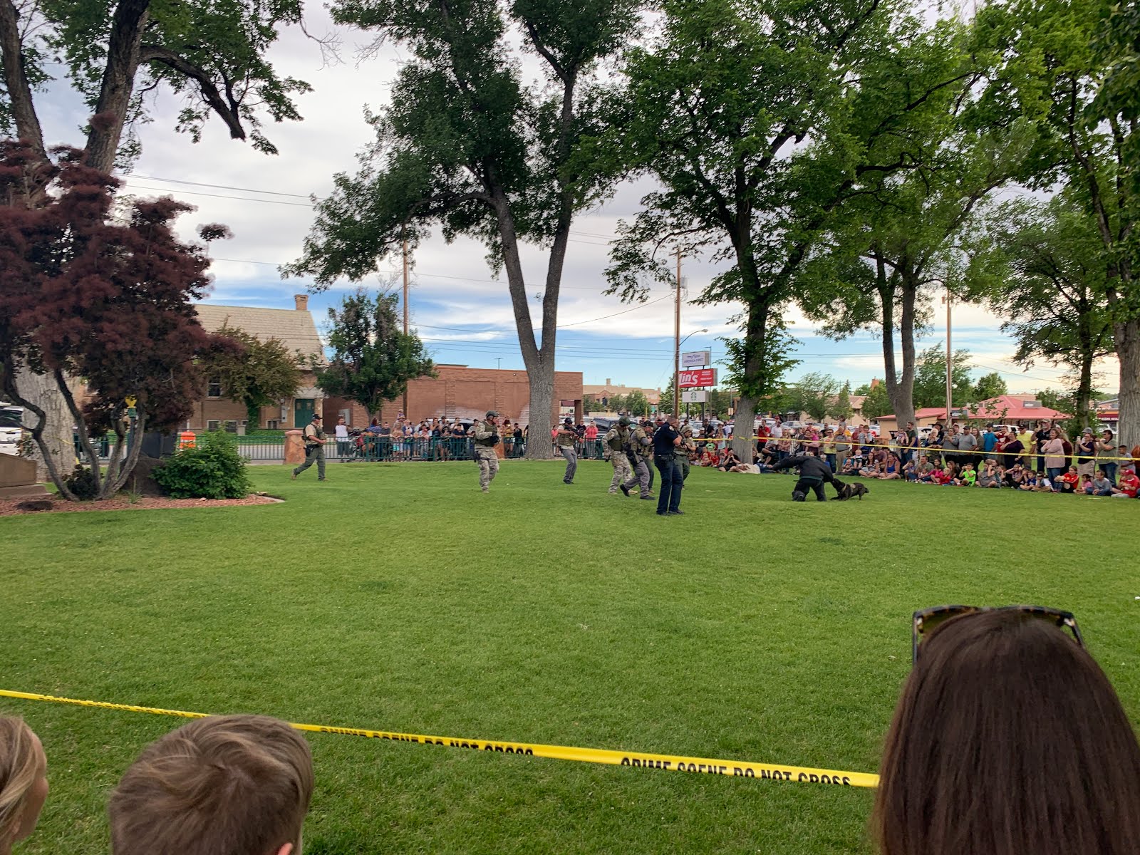 The SWAT team used explosives to blow the lock on a door and had the K9 storm the area to attack a well protected aggressor. It was amazing how fast the dog moved -- it wasn't even phased by the loud explosion!