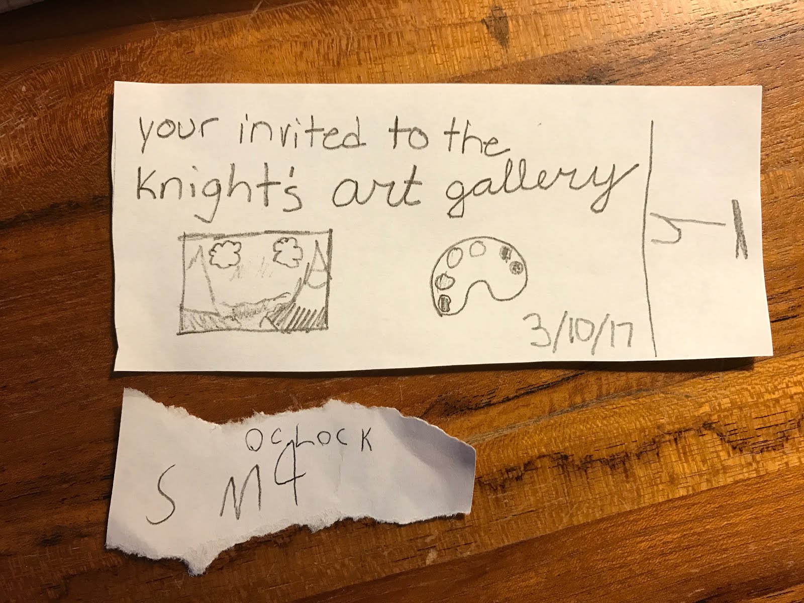 As I returned from work, I was greeted at the door with tickets to the Knight Family Art Gallery. The kids prepare an exhibit of the artwork they had been working on for the last few weeks.