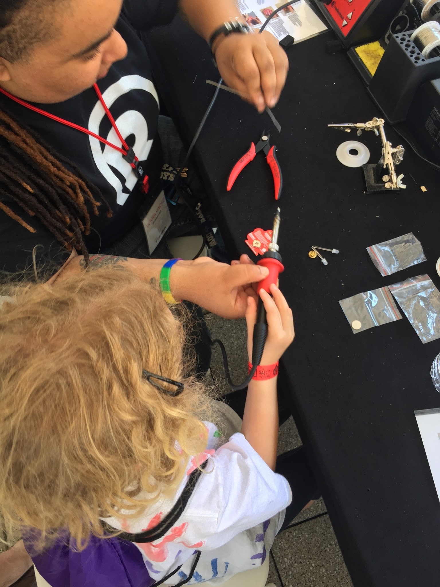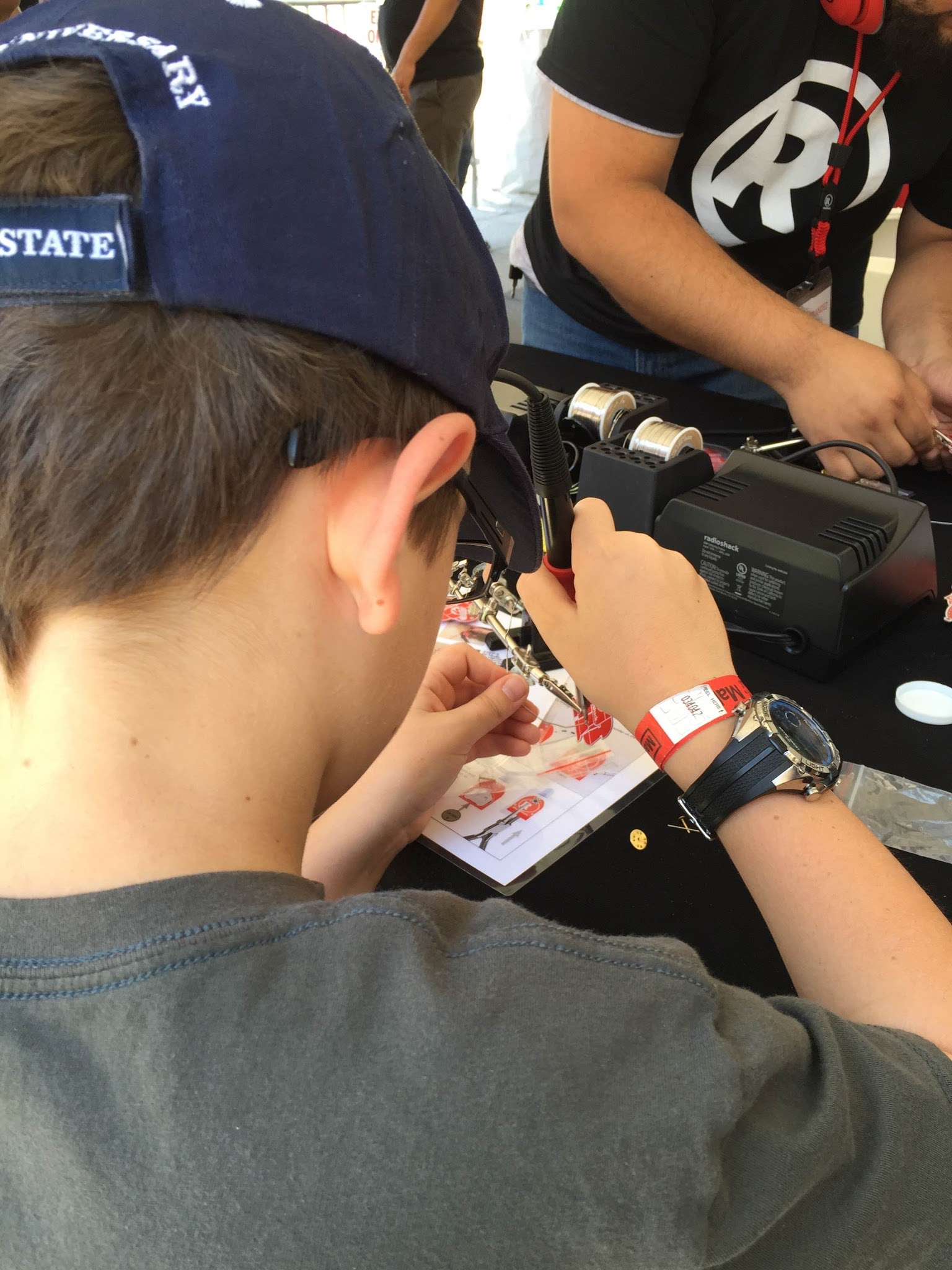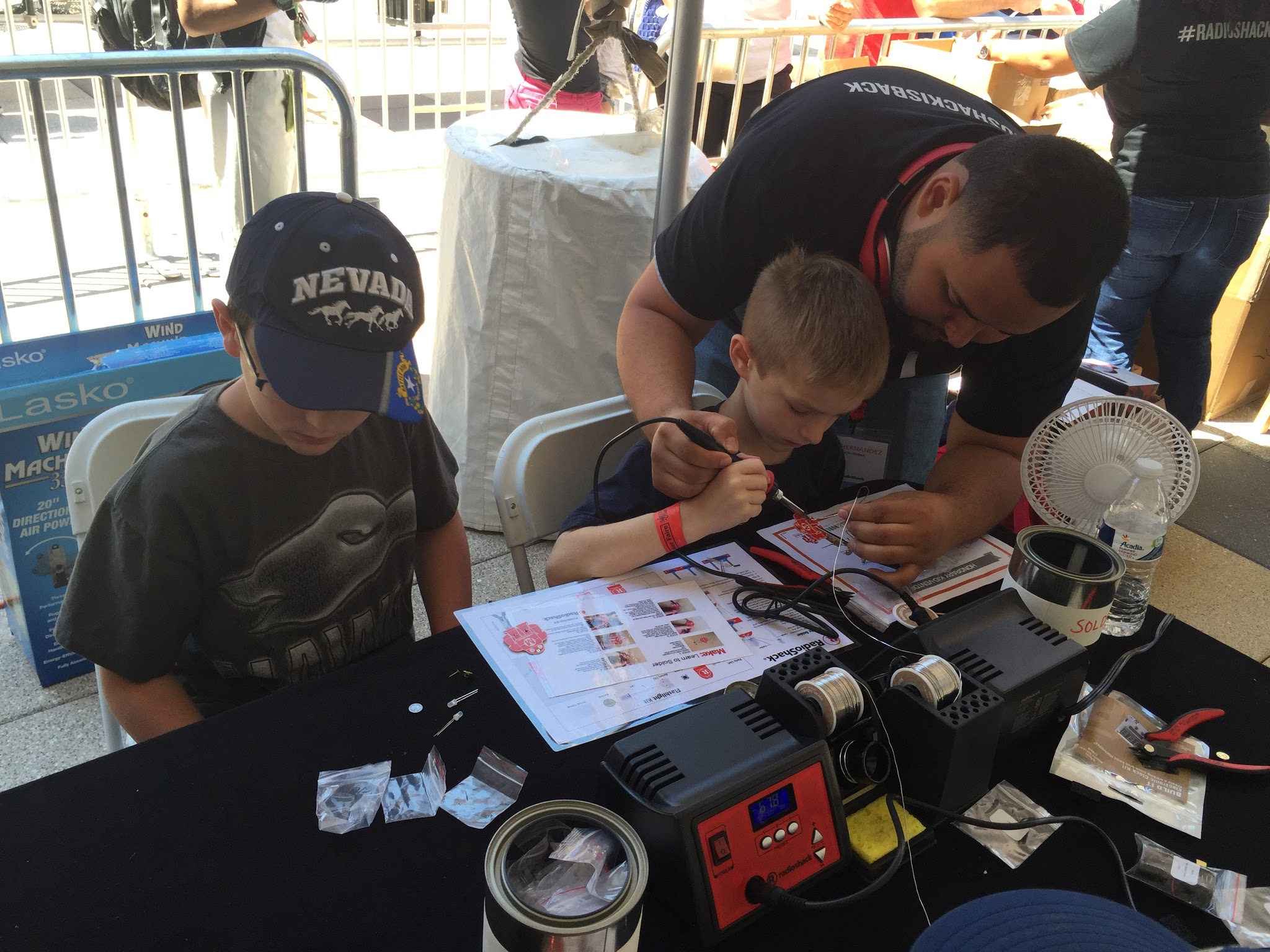 lots of booths sponsored by robotics and tech companies. This one is a RadioShack tent where the kids learned about soldering. They each got a kit and an employee helped them to put them together.