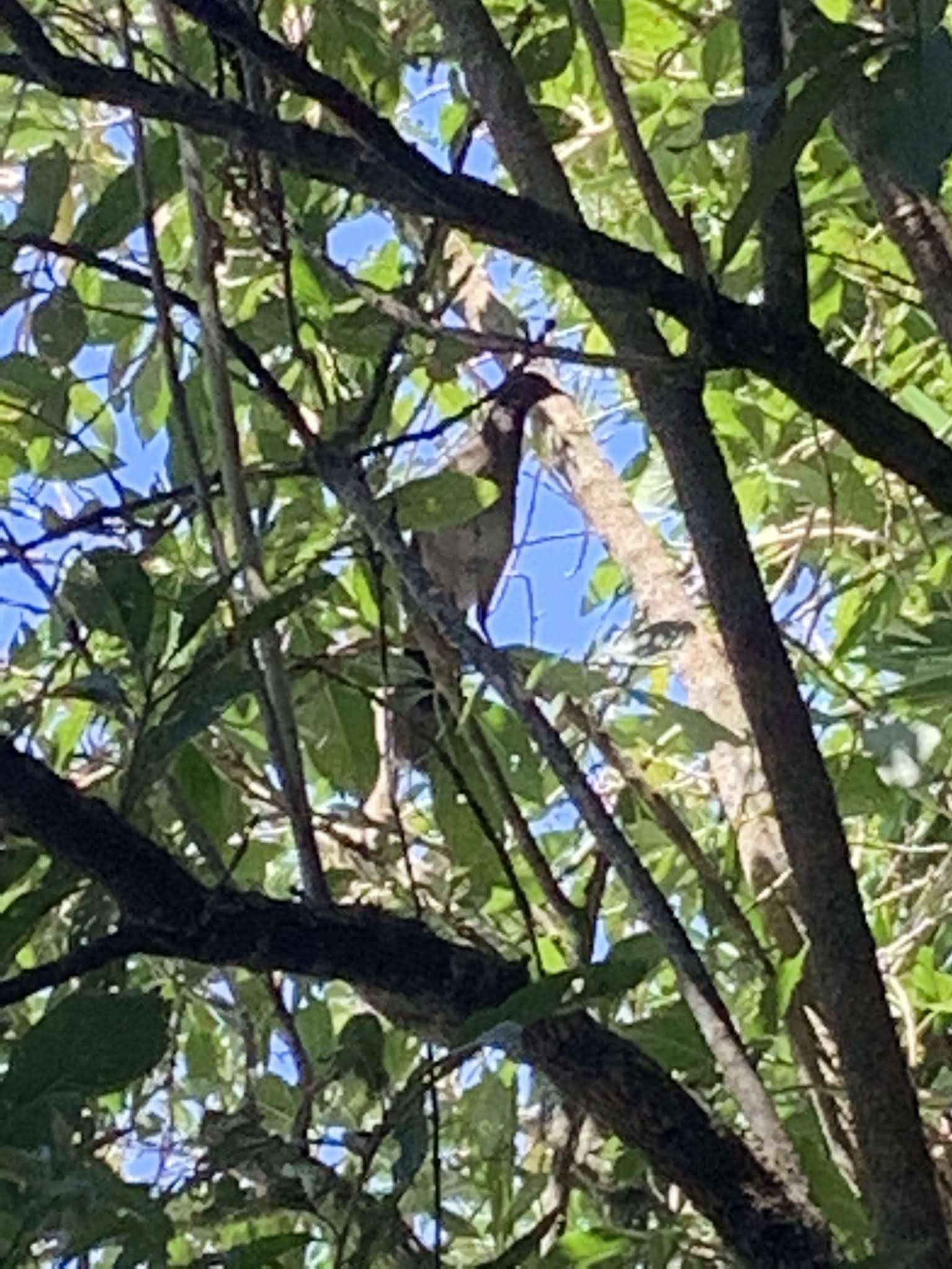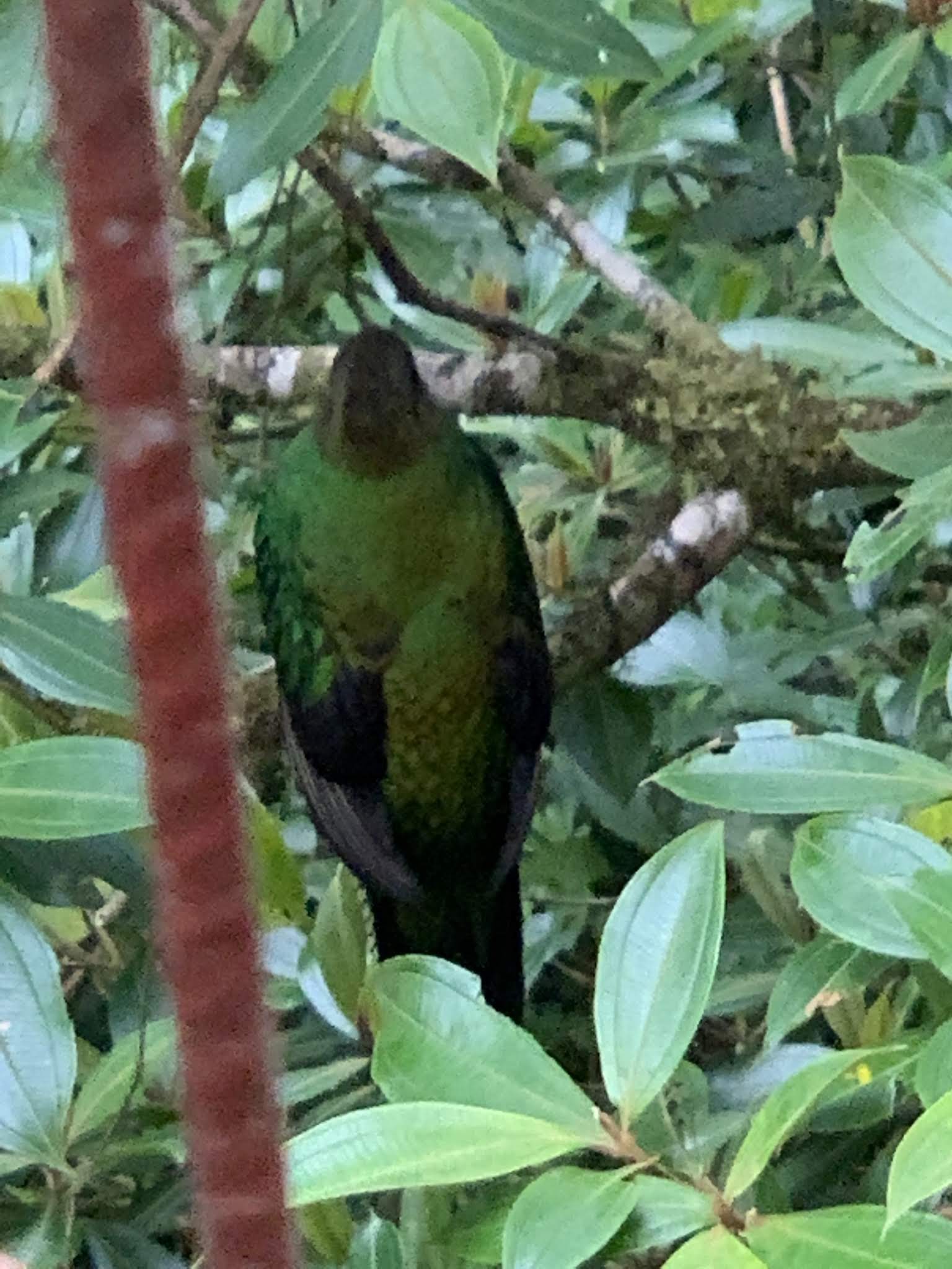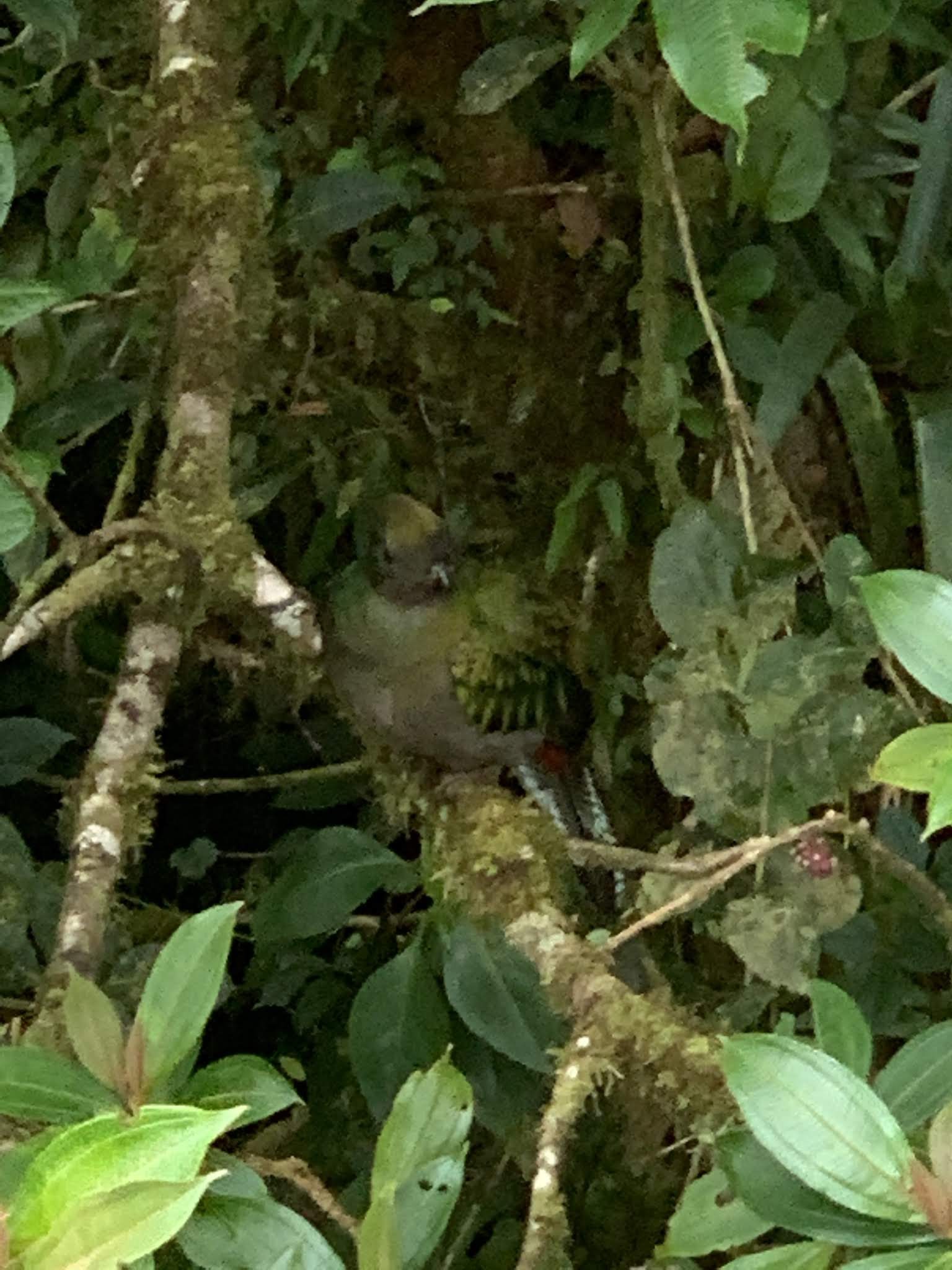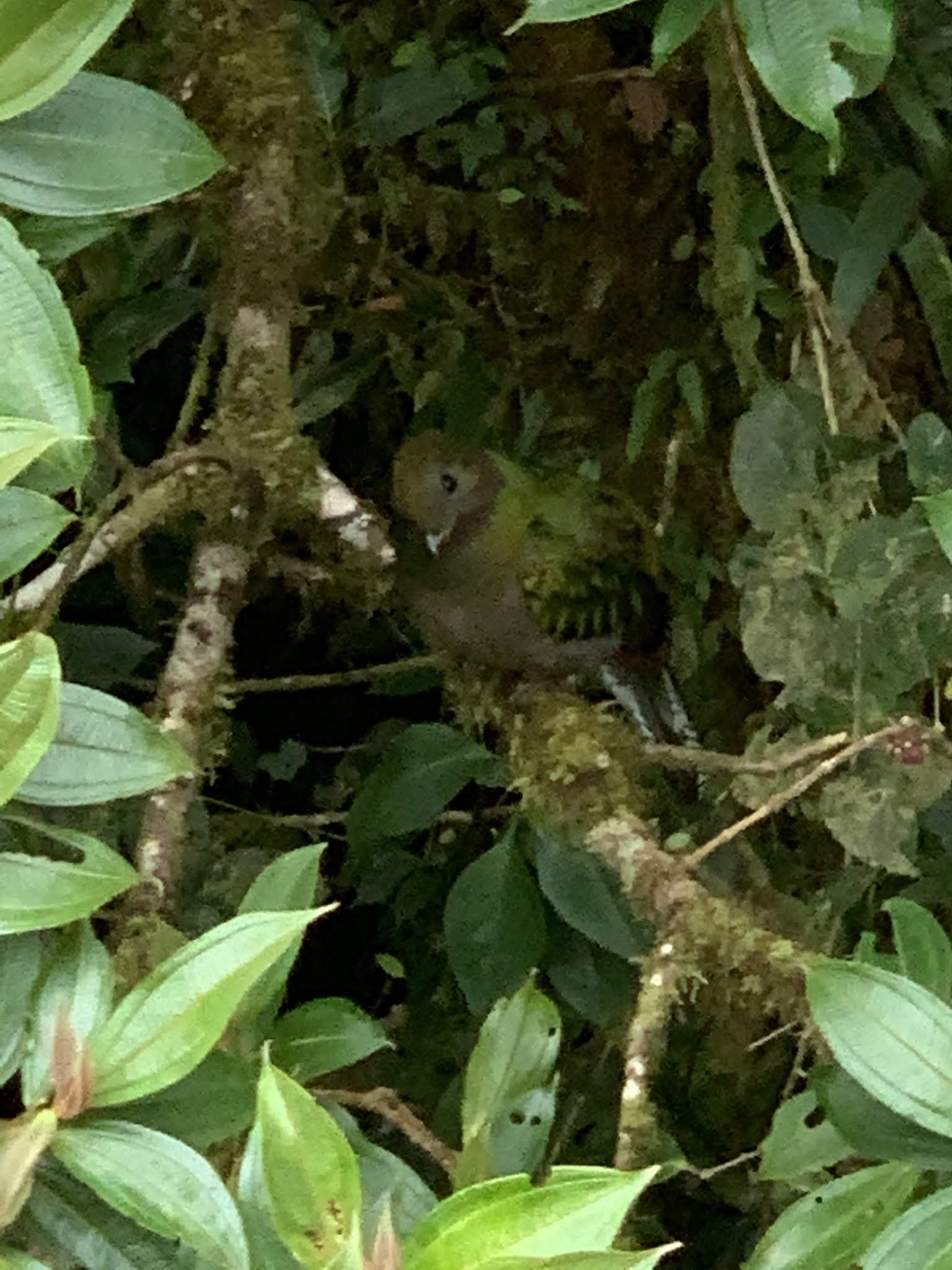 This is the female quetzal; she just sat alone on a branch on a different tree, calling to the male (the sound was very sad sounding, like she was whimpering).