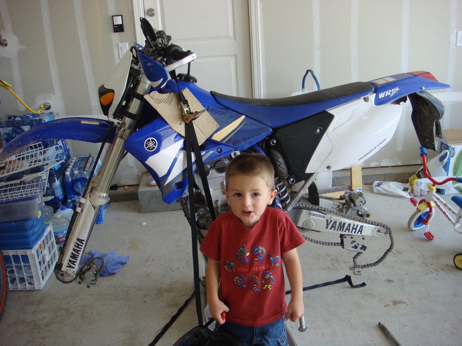 Carson helped me take the wheels off of the Yamaha WR450f and bring them to the shop to get new tires mounted. He's pretty handy with tools. He works on his motorcycle (bicycle) while I work on mine. His repairs typically involve taking a screwdriver to each screw on his bike and trying to turn it.