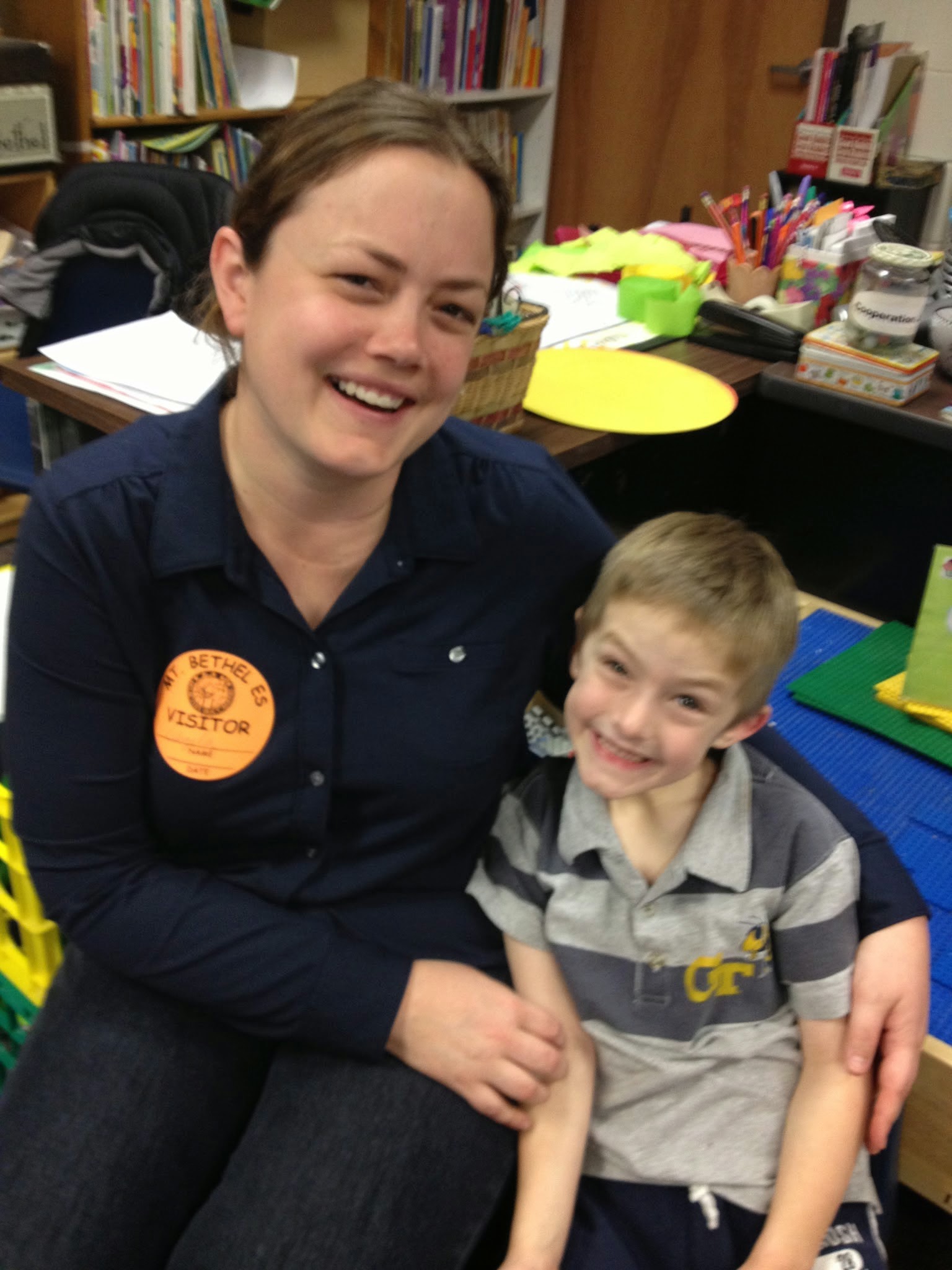 Tucker's class invited all the moms to come in and have some mini-muffins and apple juice this morning. They also put on a musical program - they sang nursery rhymes with a cool rock beat! Tucker was so happy to have his mom in class with him, he showed me around the classroom.