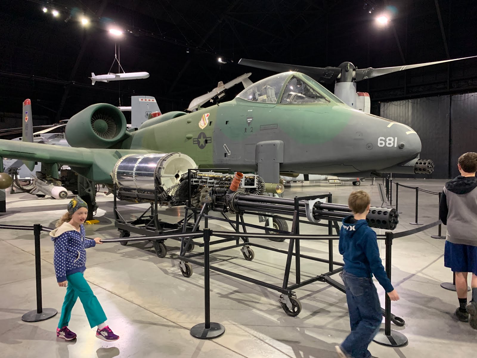 A-10 Warthog with a display of its large gun next to it.