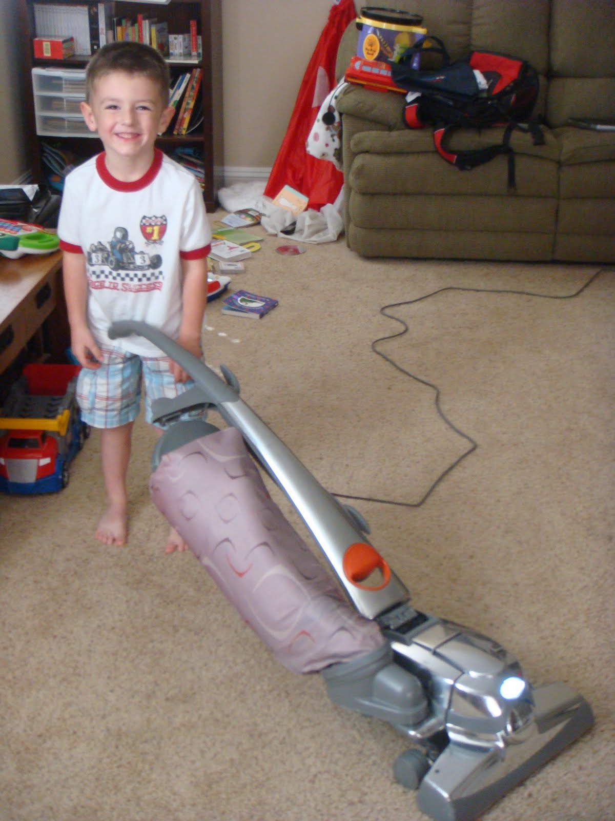 Carson loves to vacuum; or maybe he just loves the Kirby vacuum that we just bought. He is happy to clean the floor and vacuum, just for a chance to use it. At bath time last night, he wheeled the vacuum into the bathroom so he could look at it while he was in the bath. Then he asked if he could bring it to his room for bedtime. Once he woke up, he wheeled the vacuum to the living room and continued to lug it behind him everywhere he went.