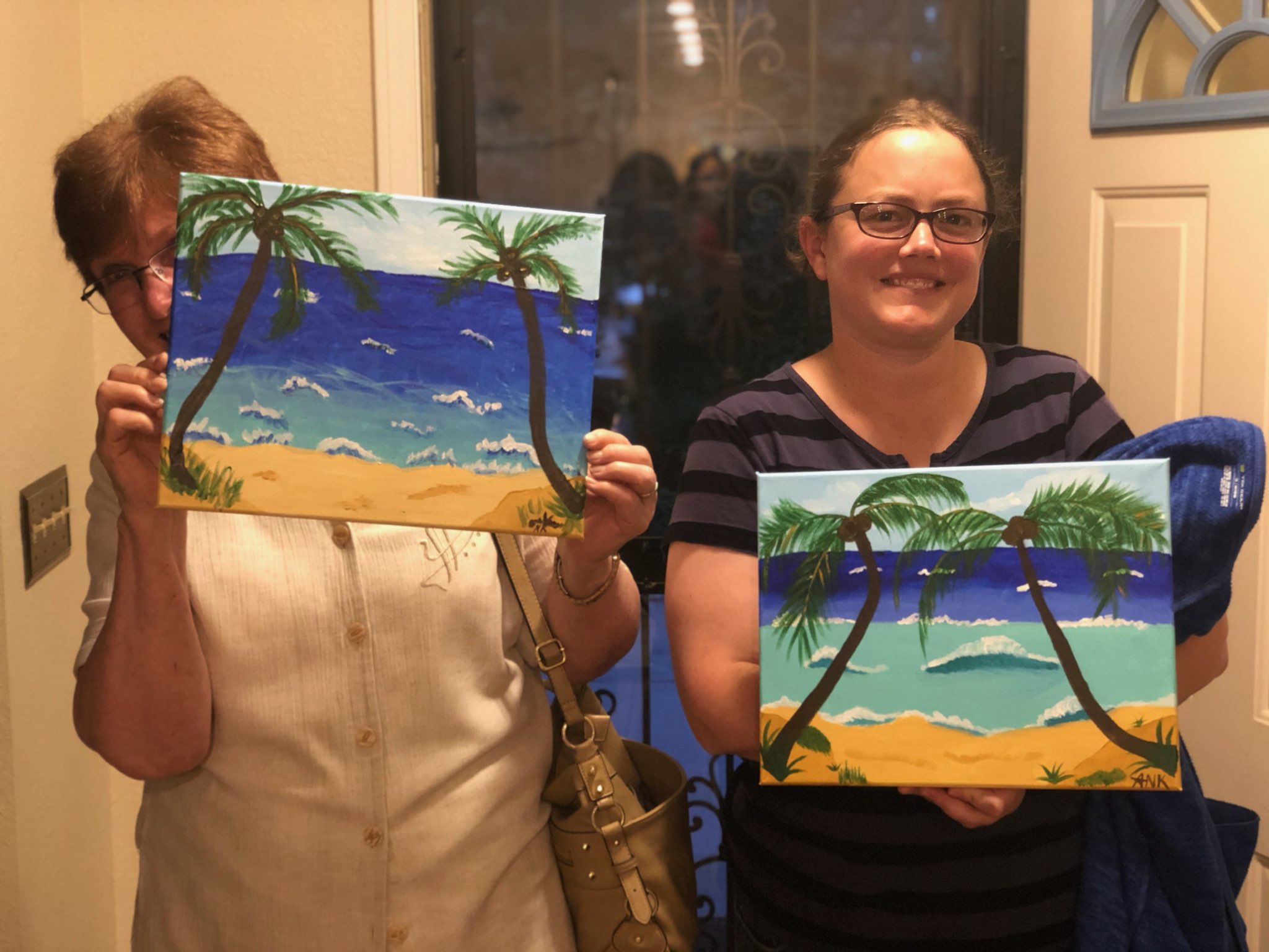 .....then we added waves (difficult) and a sandy beach and then the palm trees. It was not as hard as I thought it might be, it was doable and fun to learn how to create the painting.