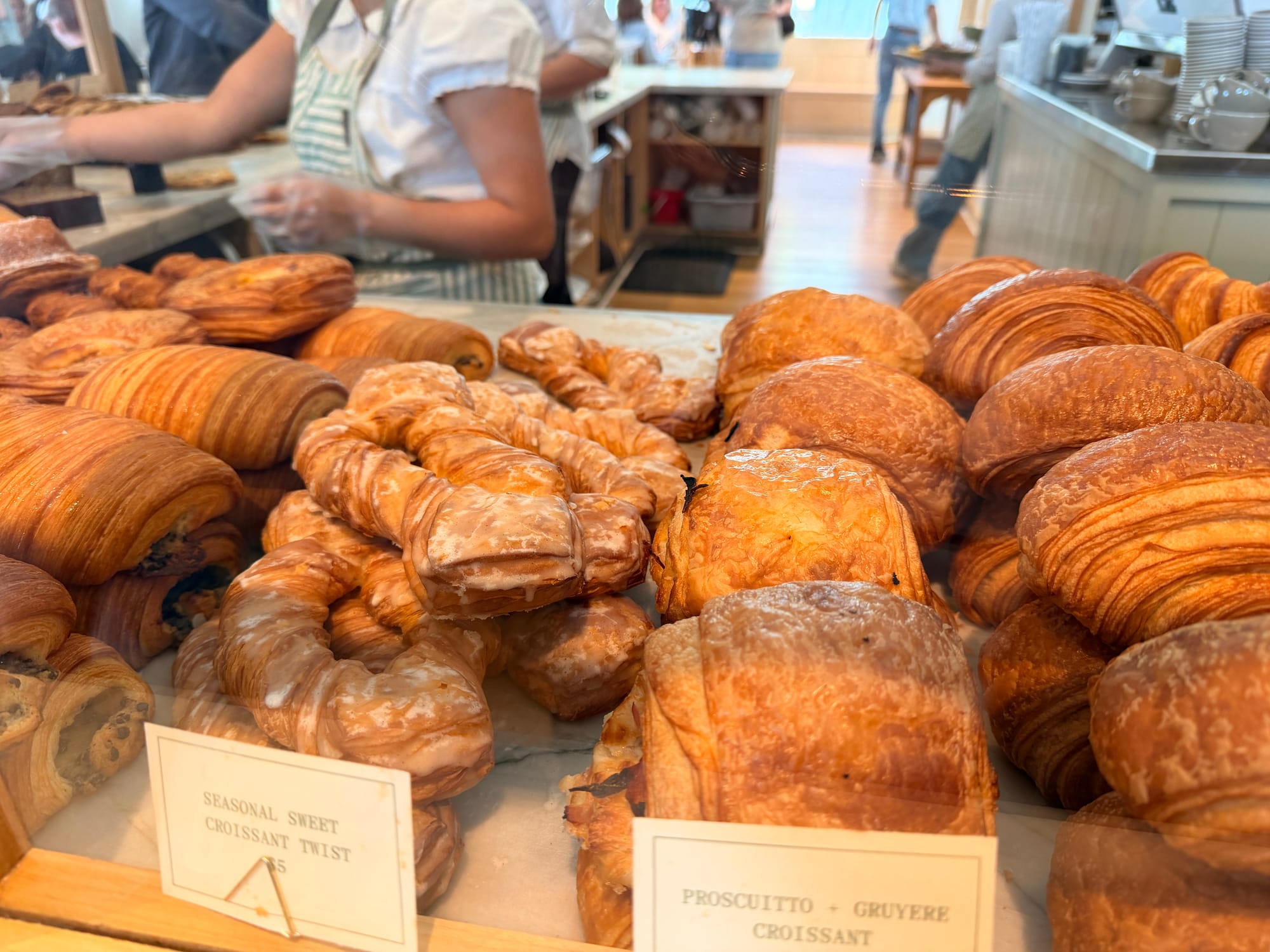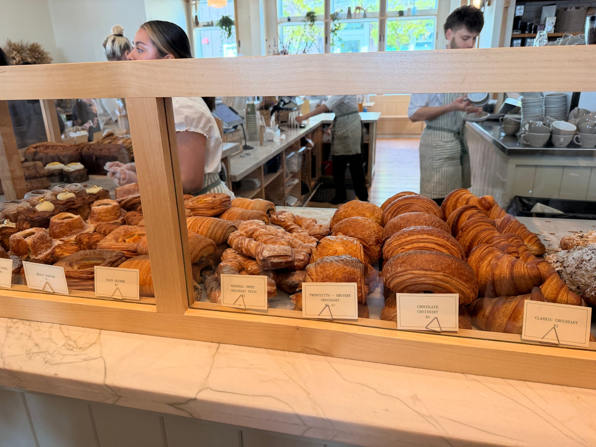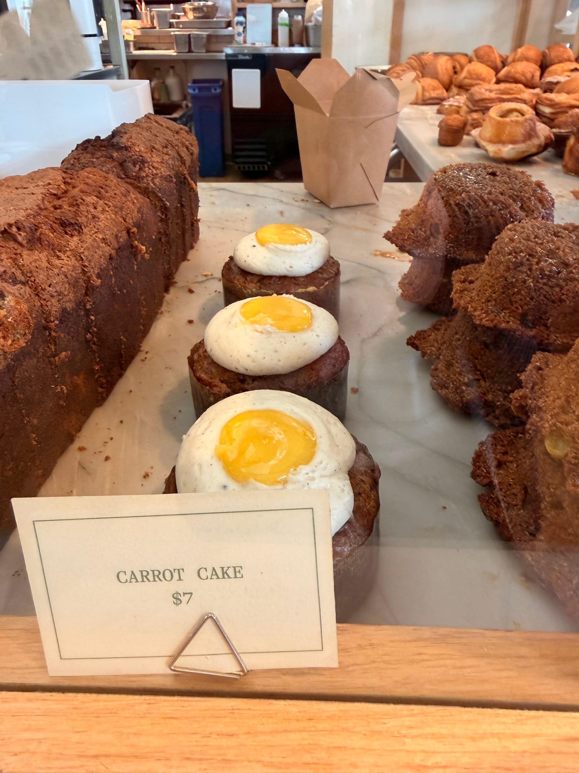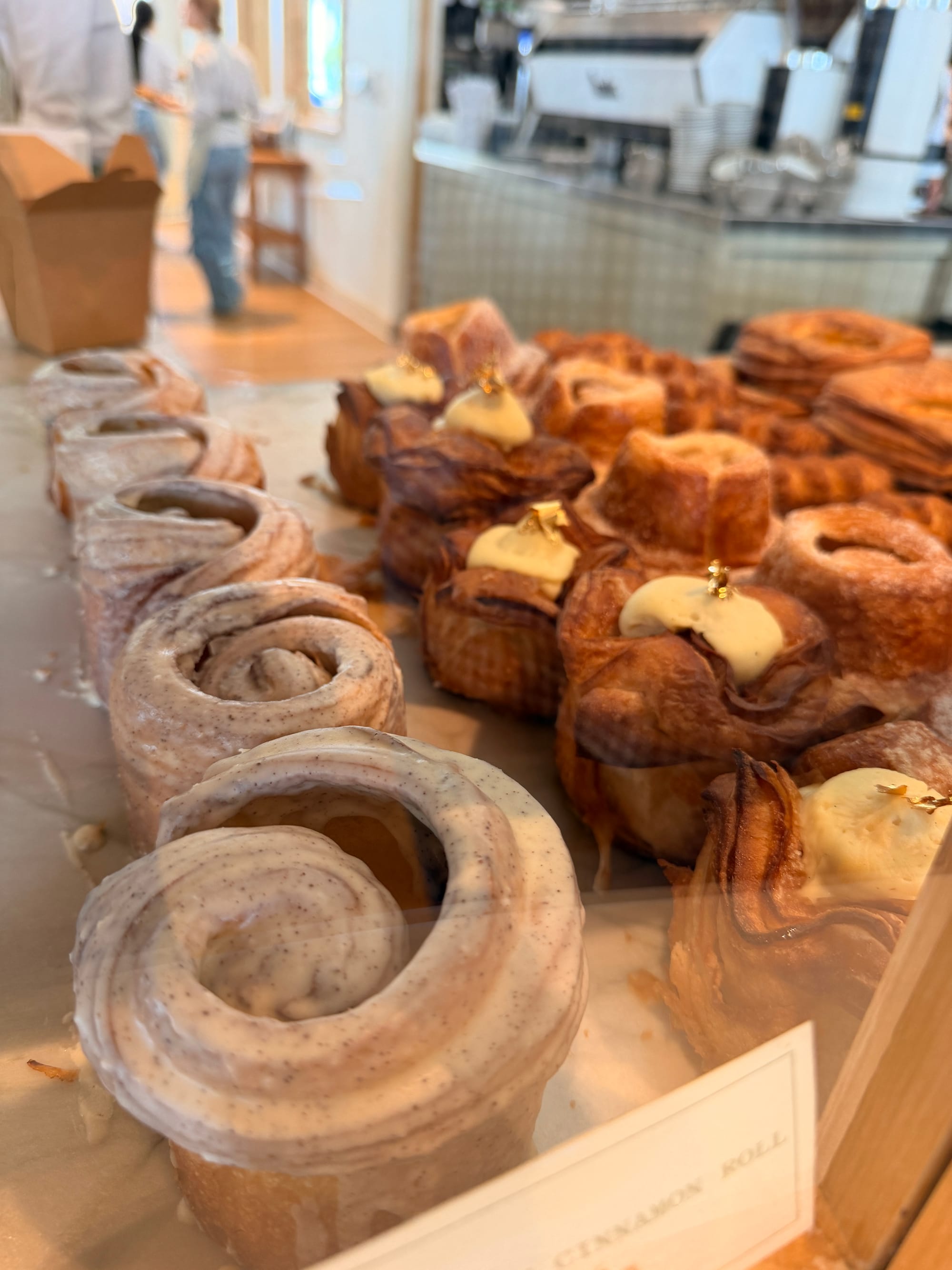 all of their pastries are made from croissant dough - very crispy buttery and flavorful. There's a croissant cinnamon roll, a creme brulee kouign amann, and danishes and other croissants. The creme brulee thing is the one with the gold foil on top. They also serve breakfast and lunch.