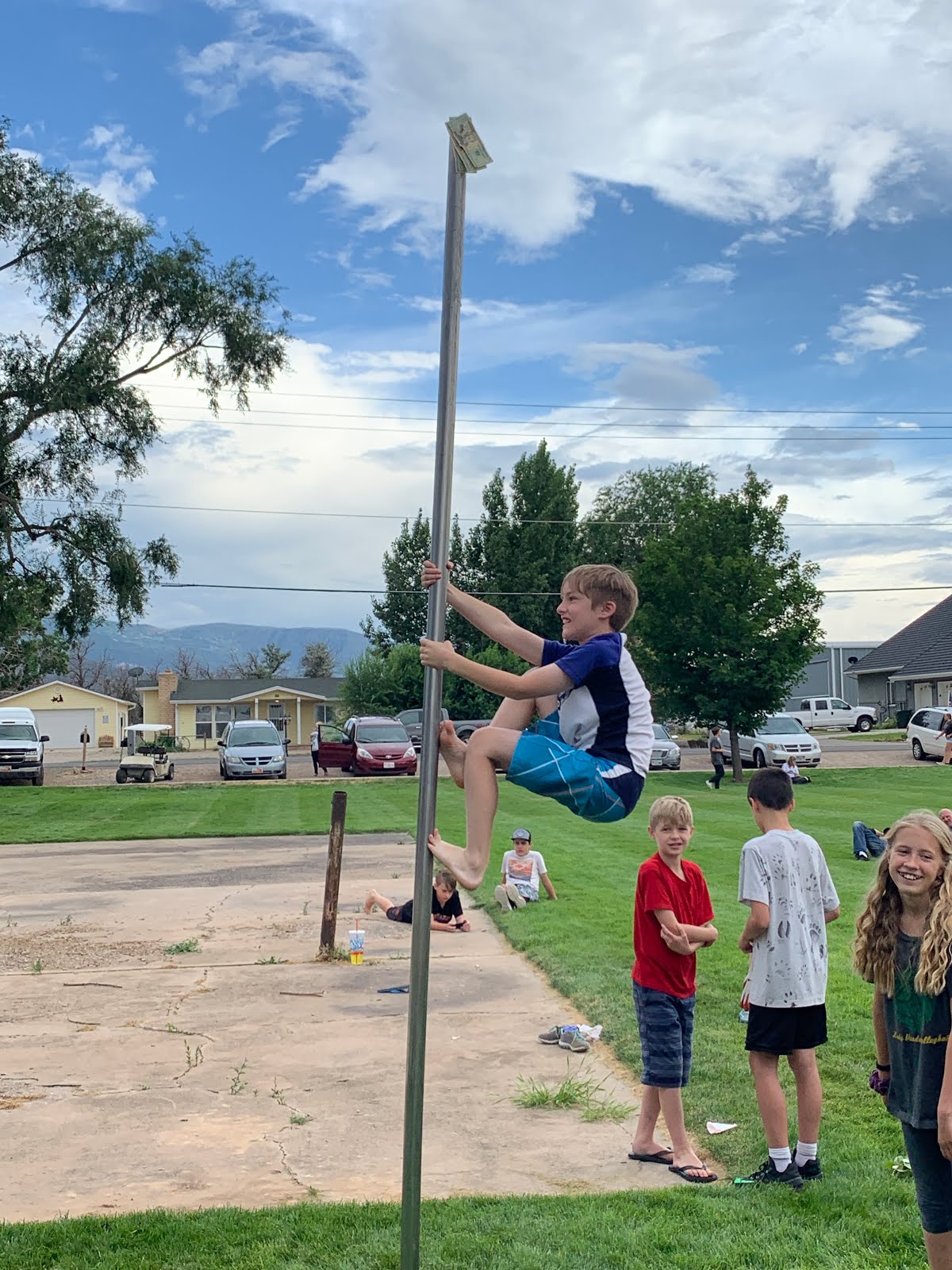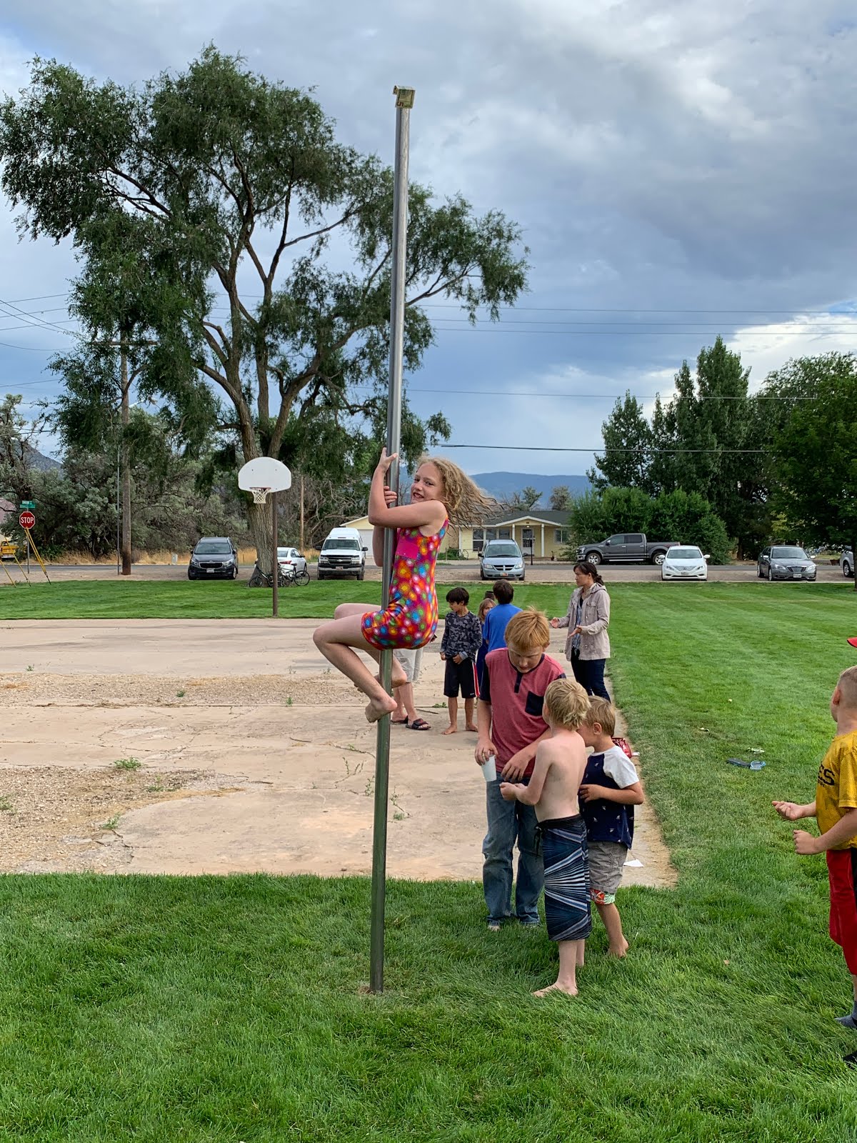 They cemented in this pole for the 'greased pole climb'. There was $60 at the top for whoever could get it. Despite several attempts, Tucker and Savannah couldn't do it. It was SO slippery.