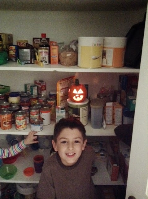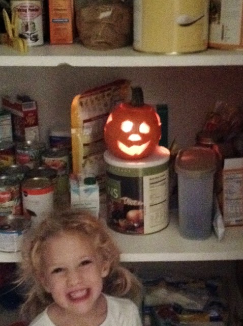 Notice how it all looks like the same pumpkin? It is; each picture is of each artist's carving (on each side of the same pumpkin). We're in the pantry cause it's dark in there.