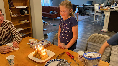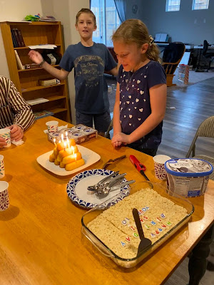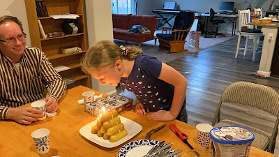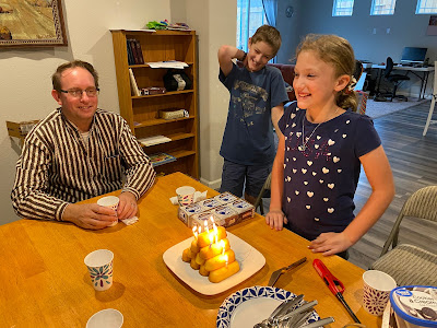 Grandma and Grandpa Knight and Aunt Teresa and Uncle Rogan came over to help celebrate with dinner, and a wide variety of treats: rice krispie treats, twinkie cake and Klondike bars.