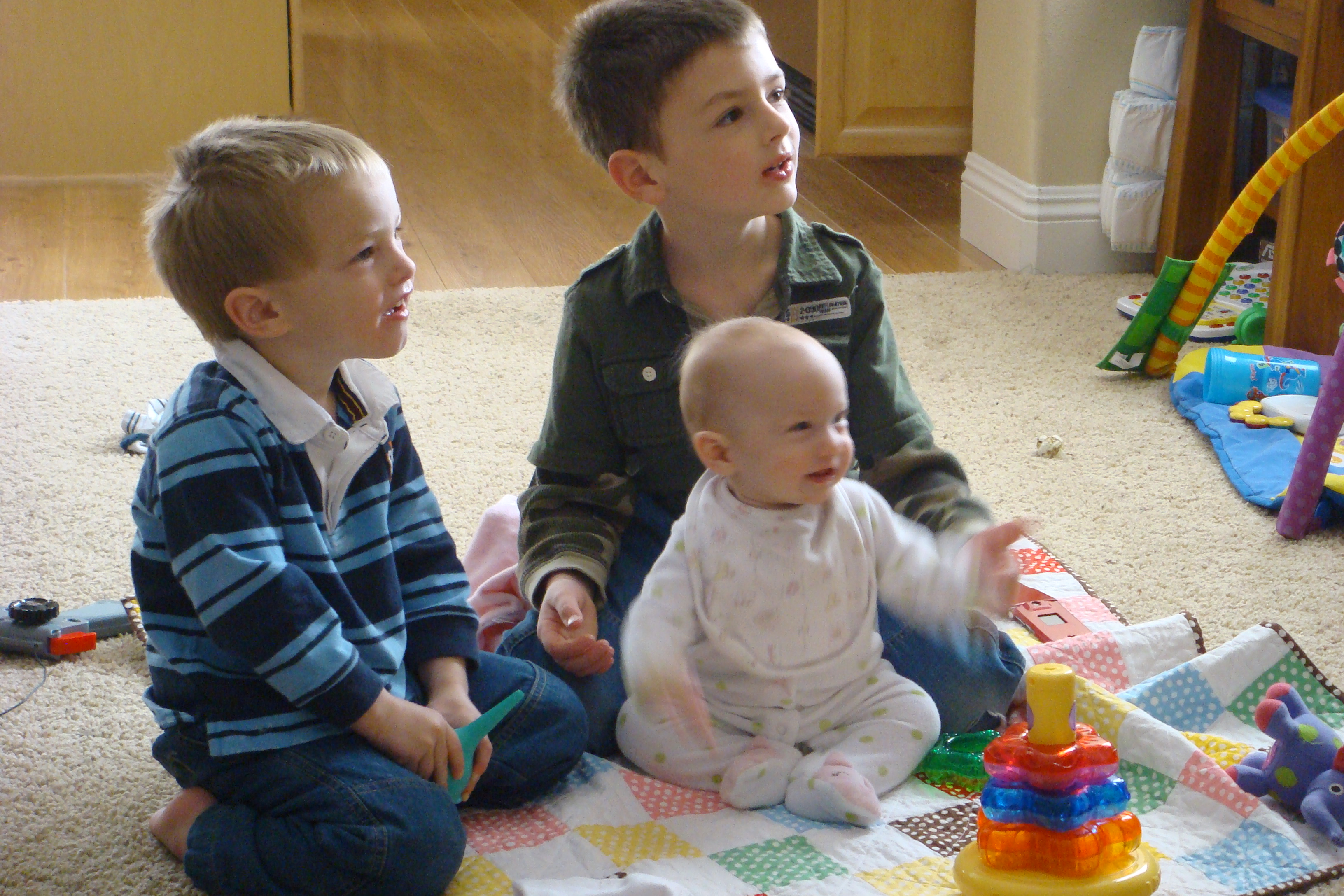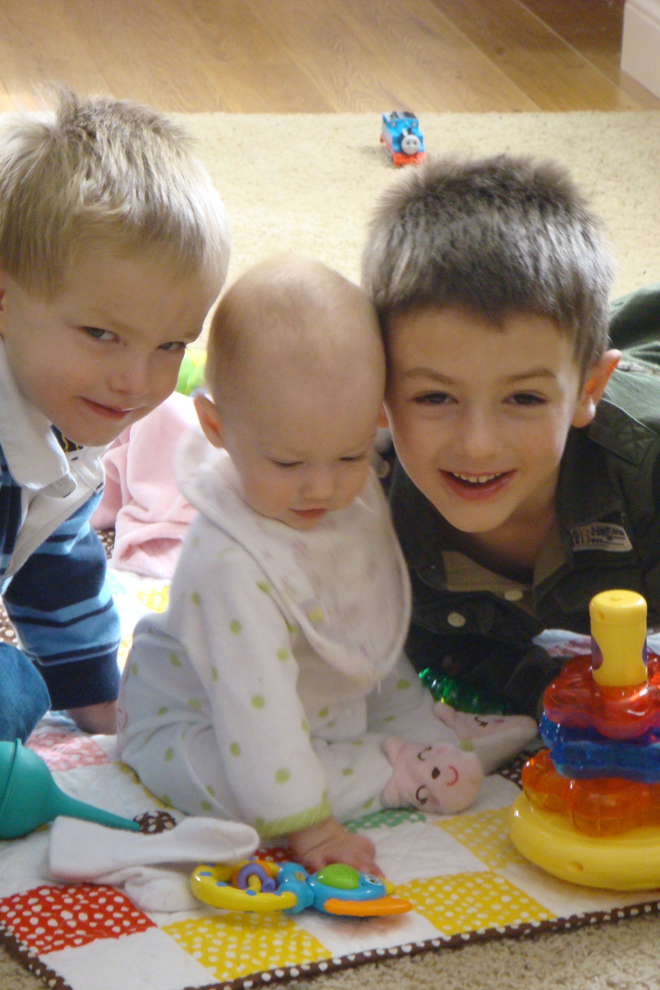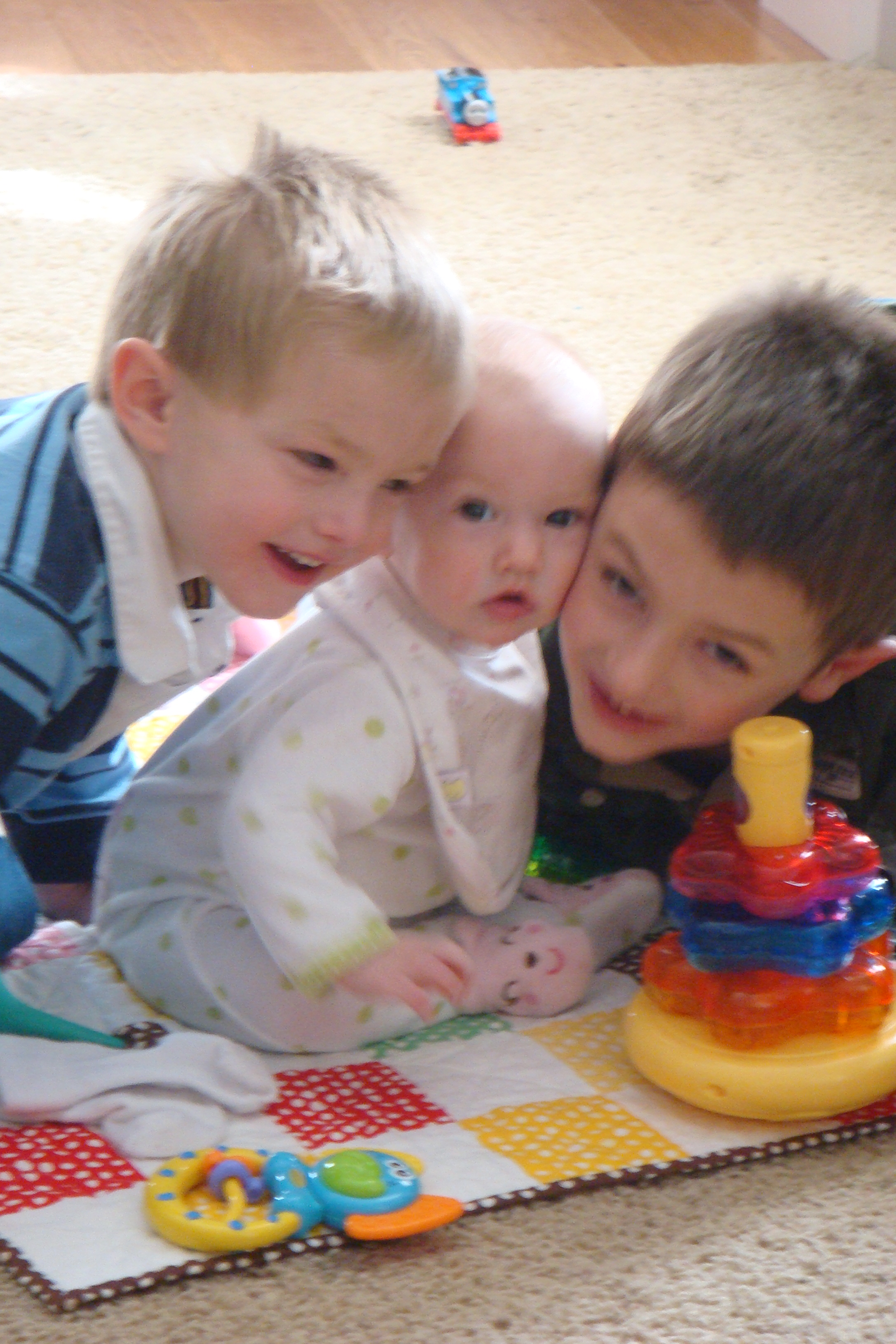 Okay, these are SO incredibly CUTE CUTE CUTE!!! I just love the ones of the three of them and she does look so tiny especially next to her big brothers! How much does she weigh now?