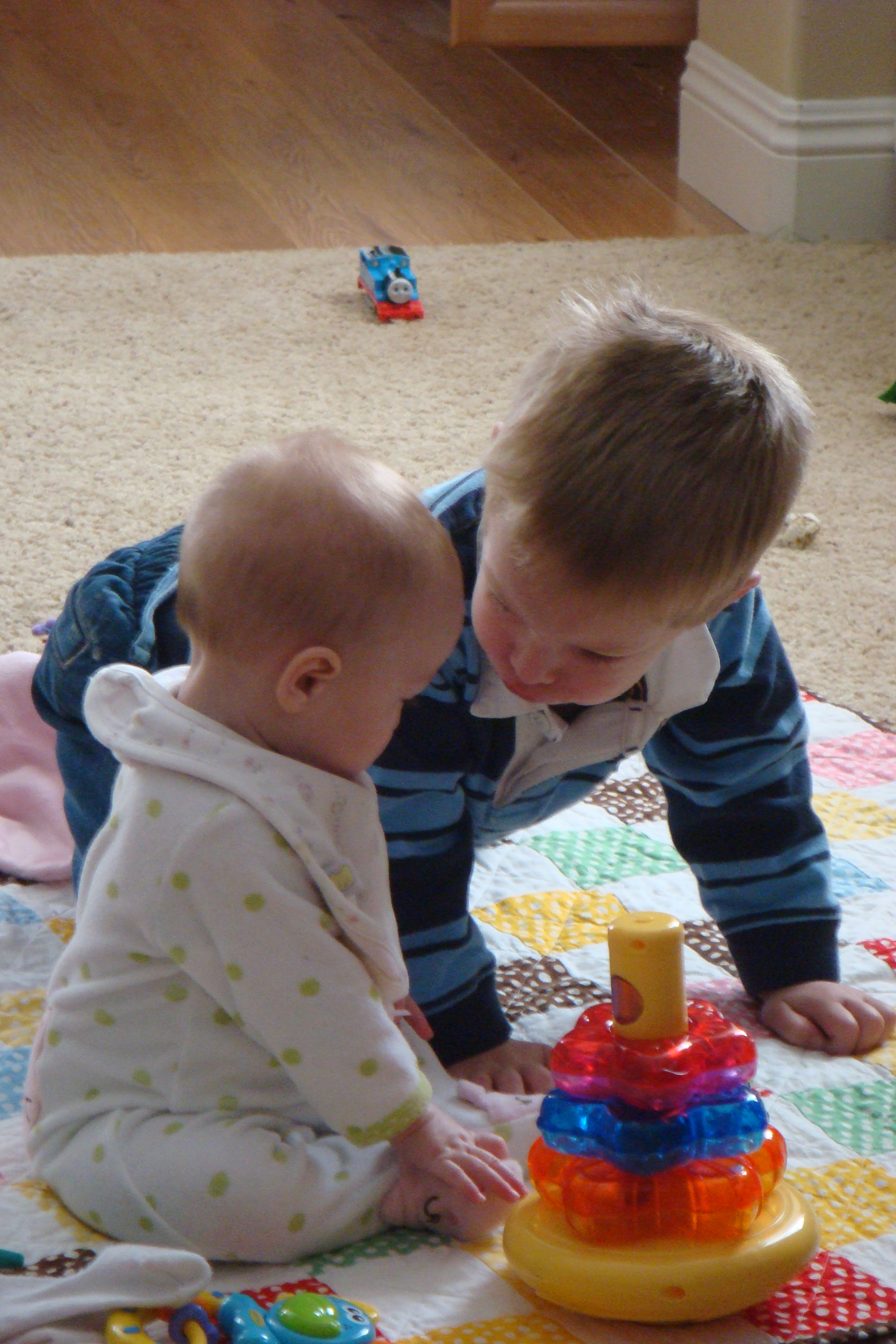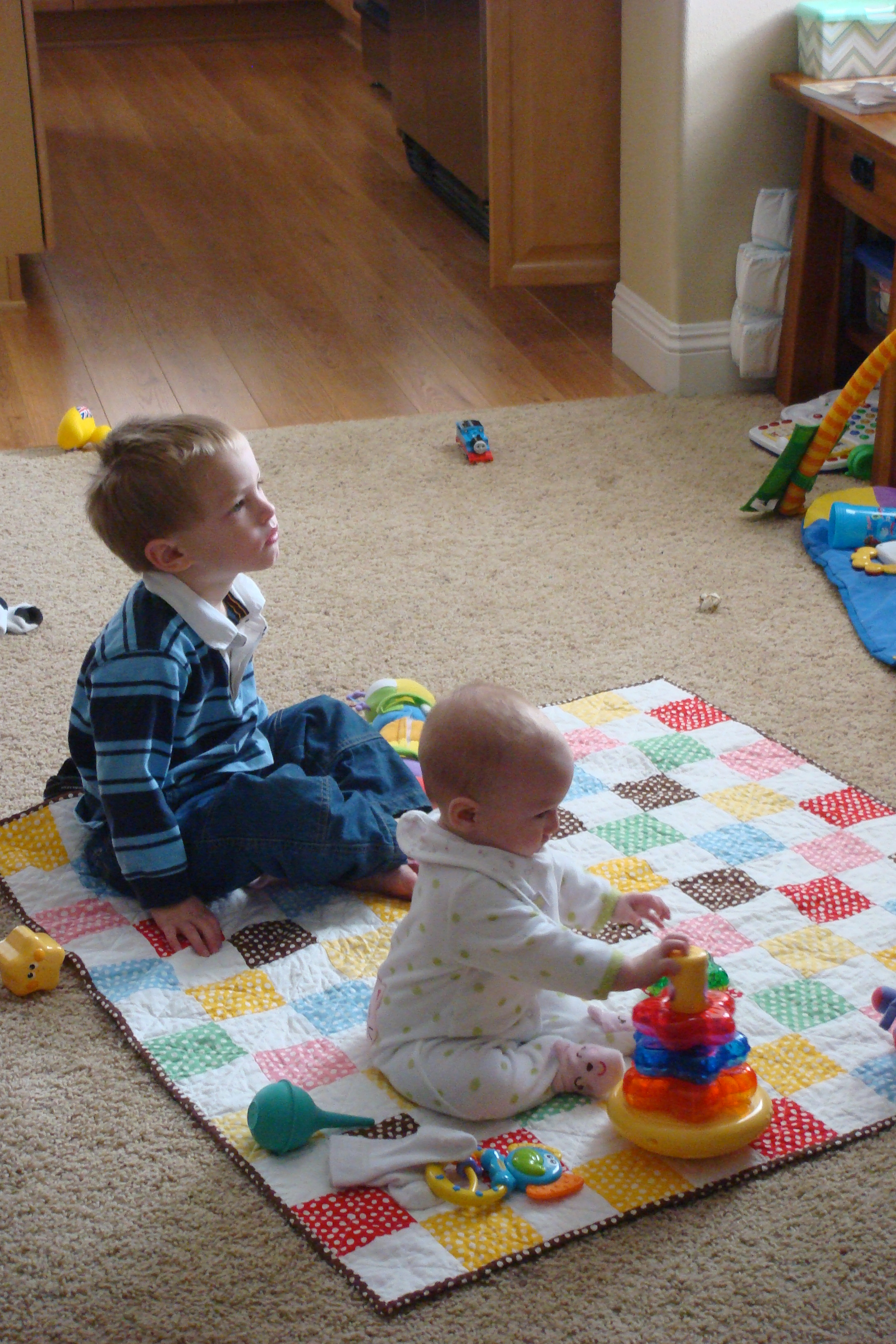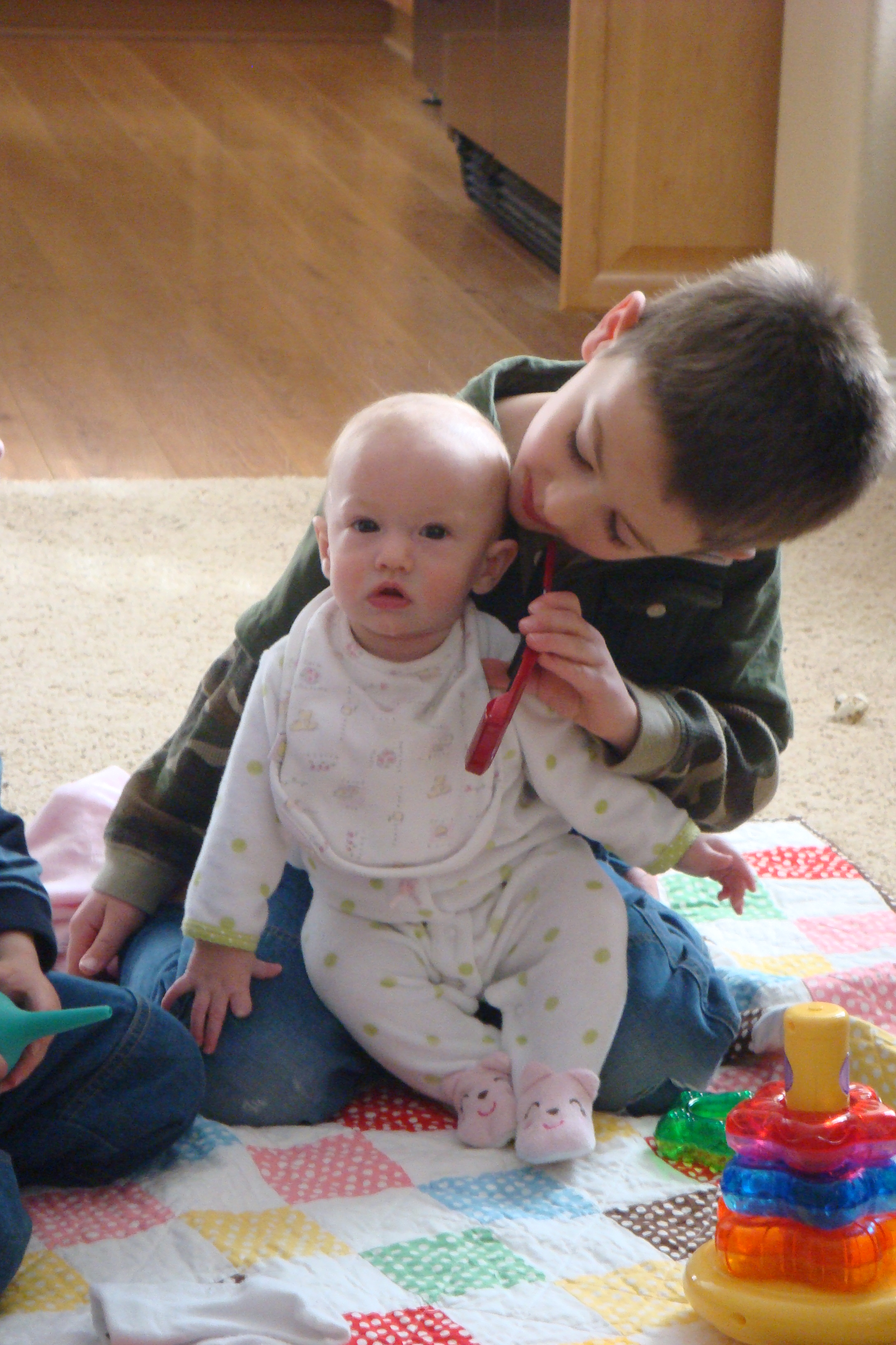 Okay, these are SO incredibly CUTE CUTE CUTE!!! I just love the ones of the three of them and she does look so tiny especially next to her big brothers! How much does she weigh now?