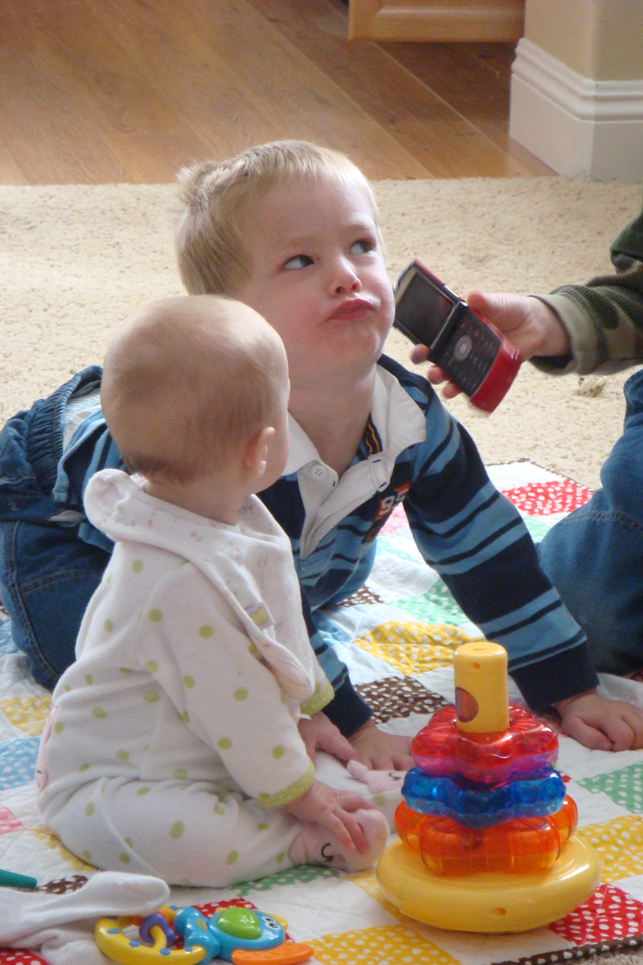 Getting smooshed by her brothers.