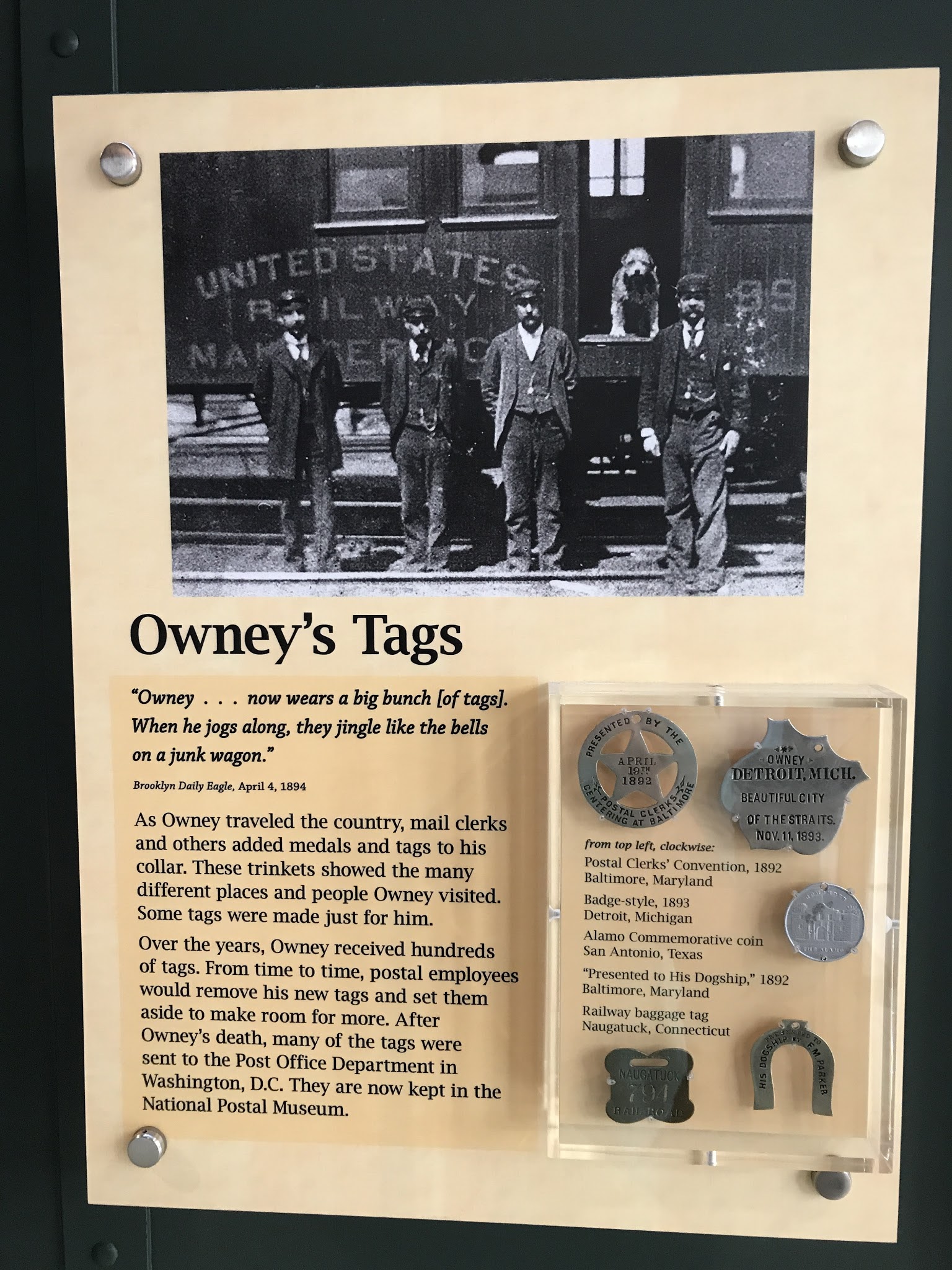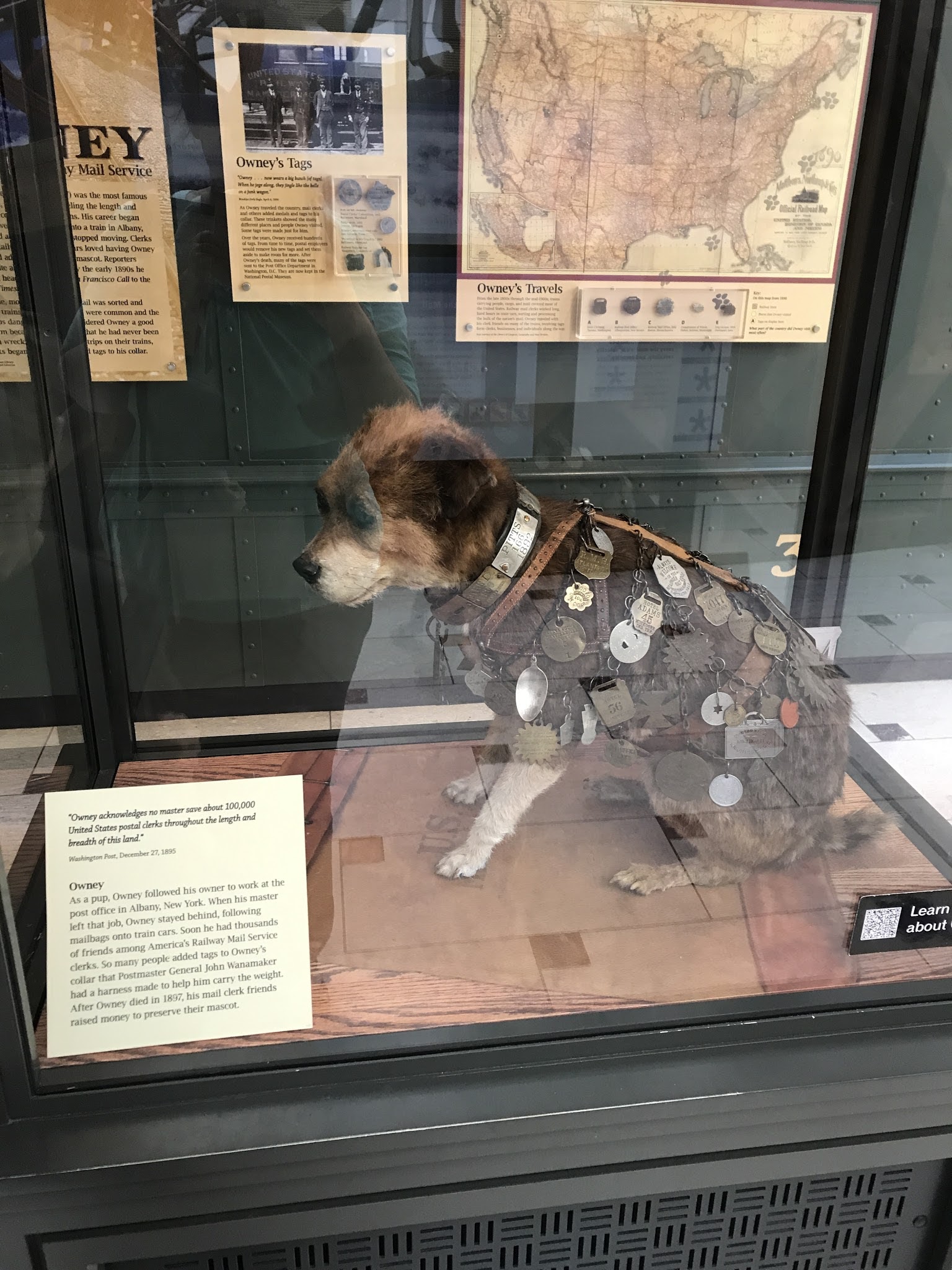 Owney was the USPS mascot in the early 1900s, and he would collect tags everywhere he went. They stuffed him after he died.