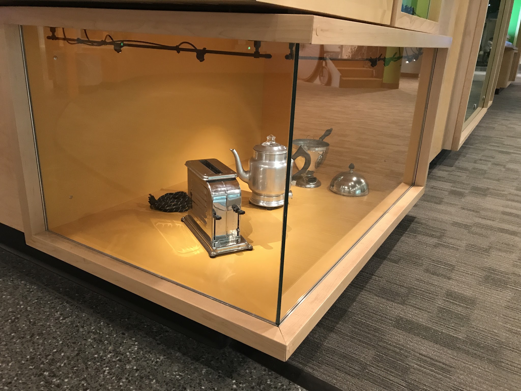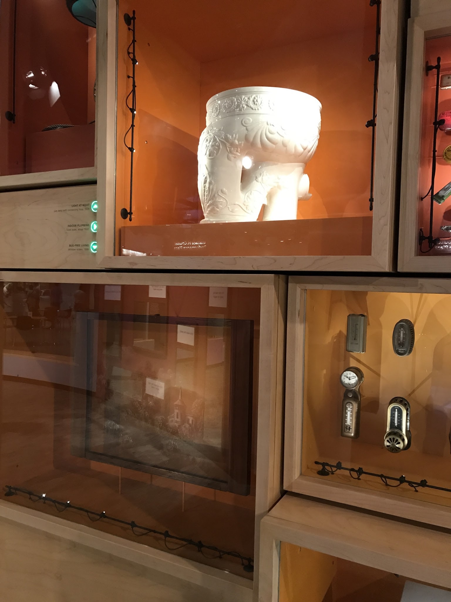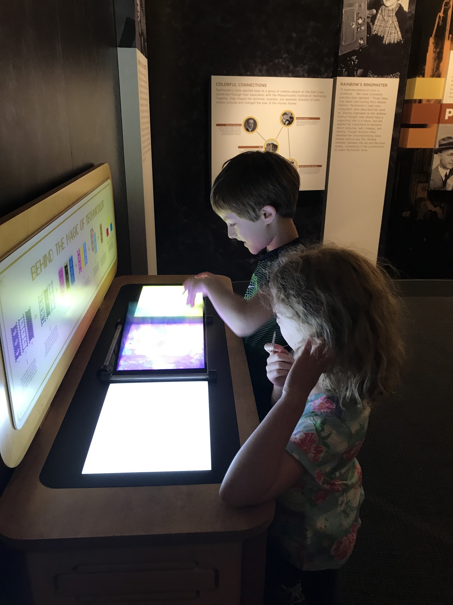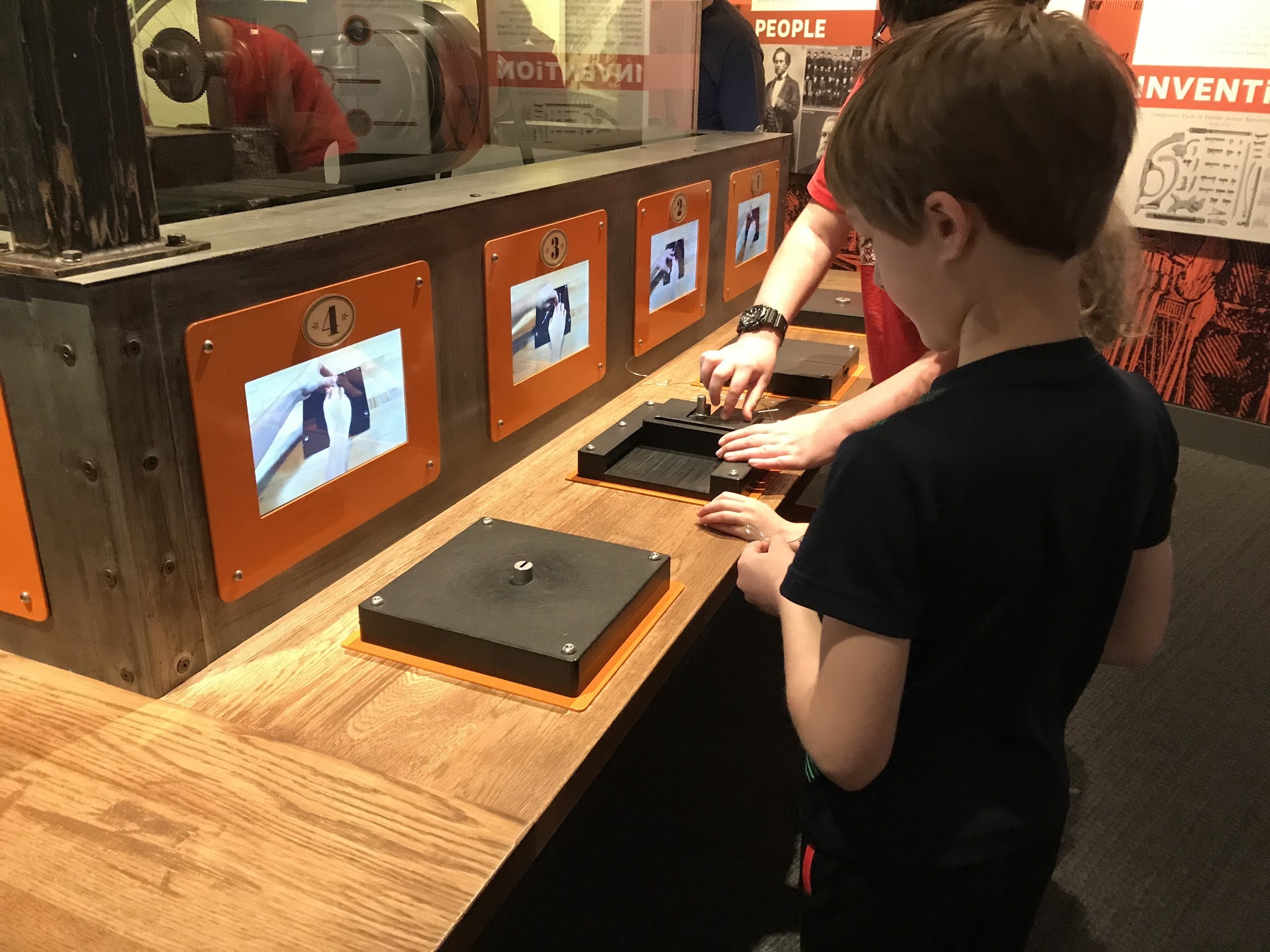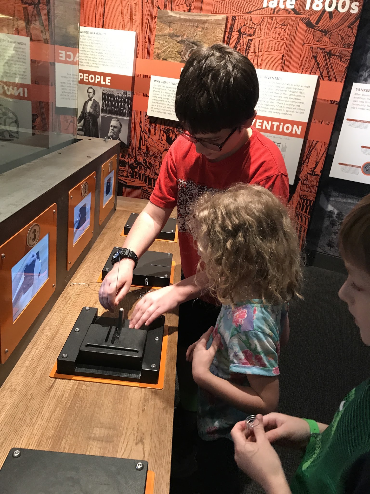 The museum is under a lot of construction, so quite a few wings were closed. We went to the 'American Stories' section, with memorabilia from American culture. Lots of cool things in there to see, and the ruby slippers would have been in there, but they were taken out just about a week ago for special cleaning and preservation. They did replace them with Indiana Jones' hat and whip, so that was cool. We went downstairs where they have a 'Innovation and Inventions' room, with different sections by area. This one was labled 'Hartford' as in Connecticut. The kids are making wire picture holders.