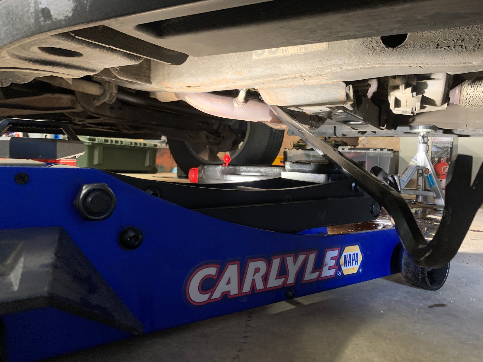 Removing the transmission oil pan proved challenging. The exhaust pipe runs beneath it, preventing removal of the pan. Frustratingly, you only need a couple of millimeters of extra clearance. So we found a 3' crowbar at Harbor Freight, then pried the exhaust down slightly using the floor jack to hold it. The exhaust went right back into position afterwards -- no harm done.