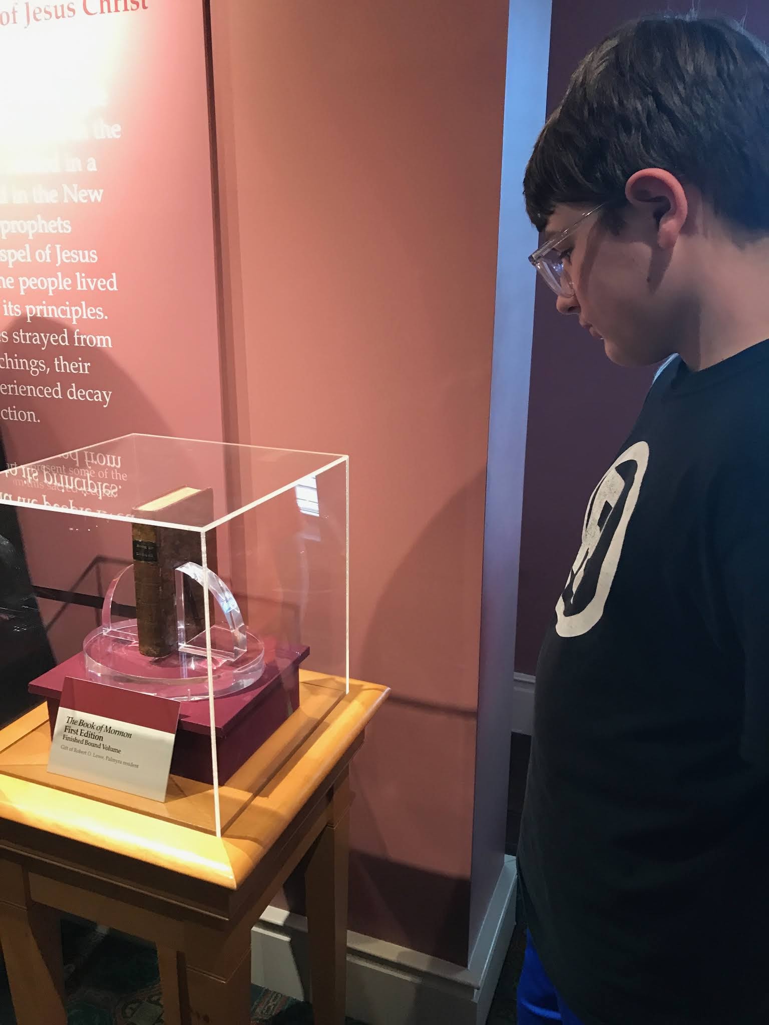 When he was 14 years old, Joseph Smith prayed in the Sacred Grove (the woods behind his home) to ask which church to join, as he had been attending different churches and wondering which one was right. That prayer was answered with a vision of the Father and the Son, who told him to "join none of them. They teach for doctrines the commandments of men, having a form of godliness, but they deny the power thereof." Later, Joseph was led to where the plates were buried in Cumorah Hill. He was allowed to dig them up and take them home 4 years later, when he started translating them. The finished translation was brought to the Grandin Press, printed and in two years, the first 5,000 copies were finished.