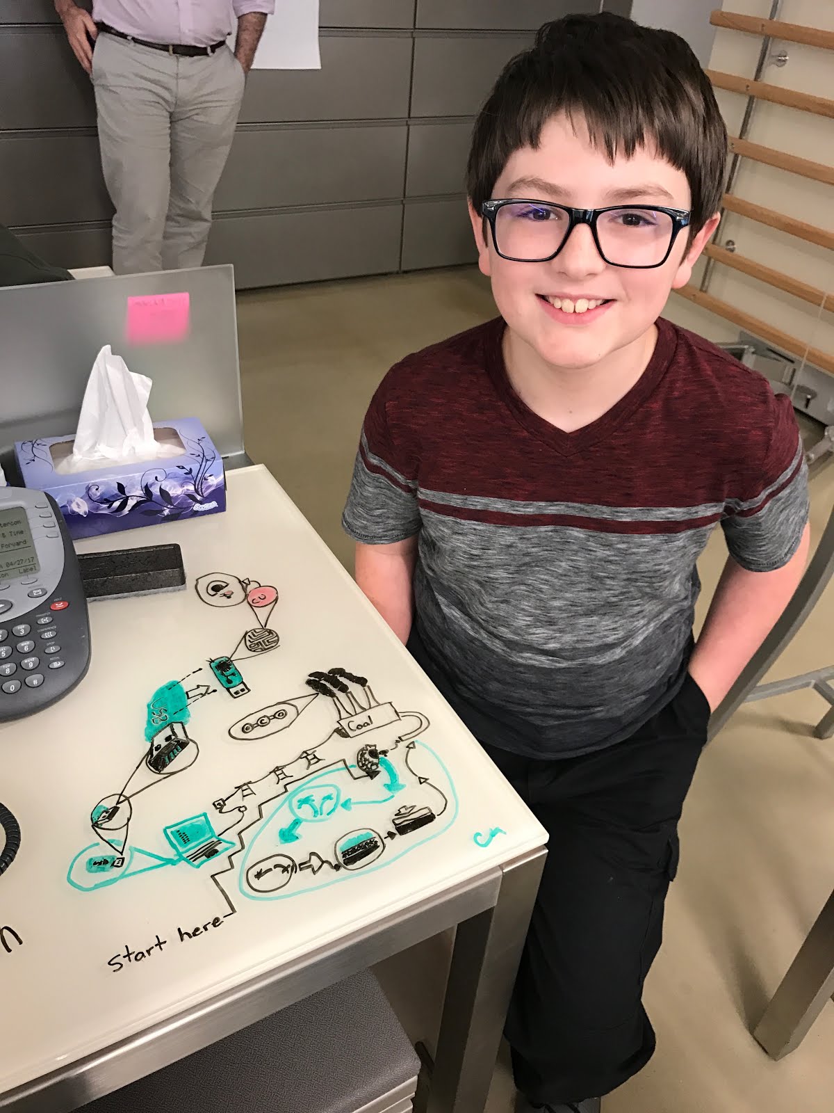 Carson's artwork on my glass desktop. It describes how electricity flows from the ground, to the power plant, to the electronics on my computer.