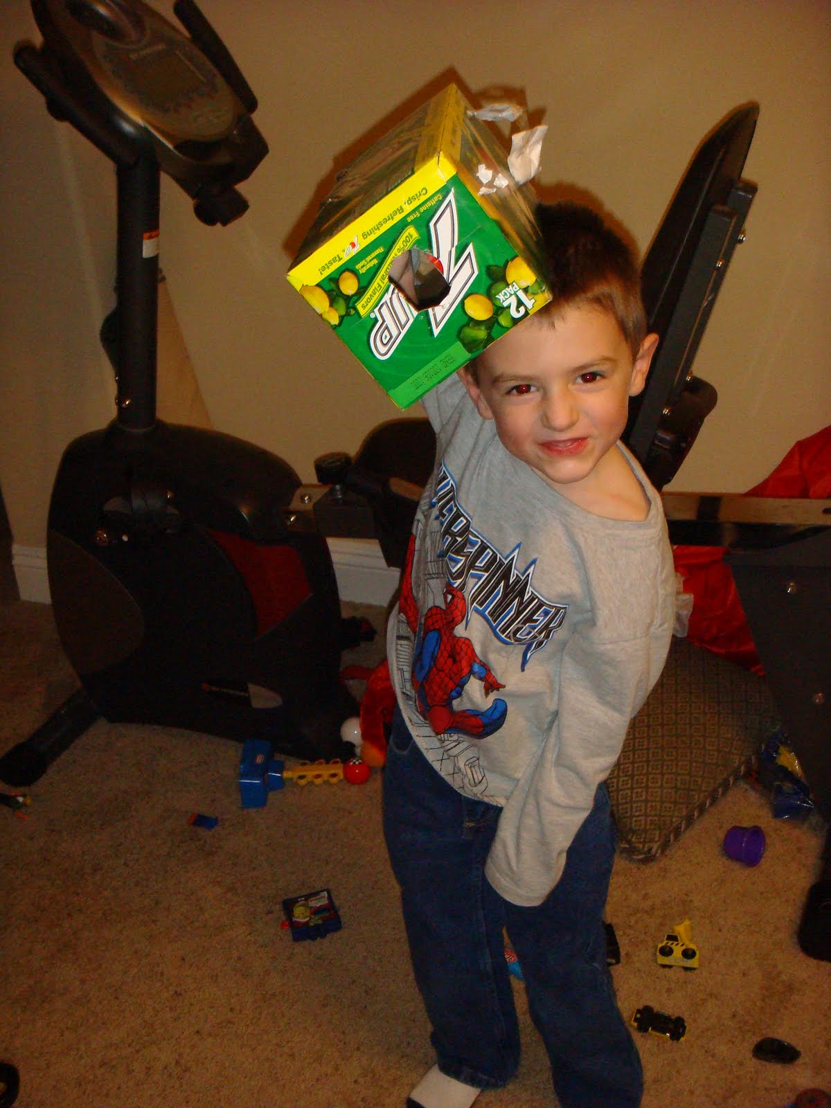 Carson made his own gun out of an old 7up box. He even made a sight for aiming! He did it all on his own (I would never have thought to make a gun.....).