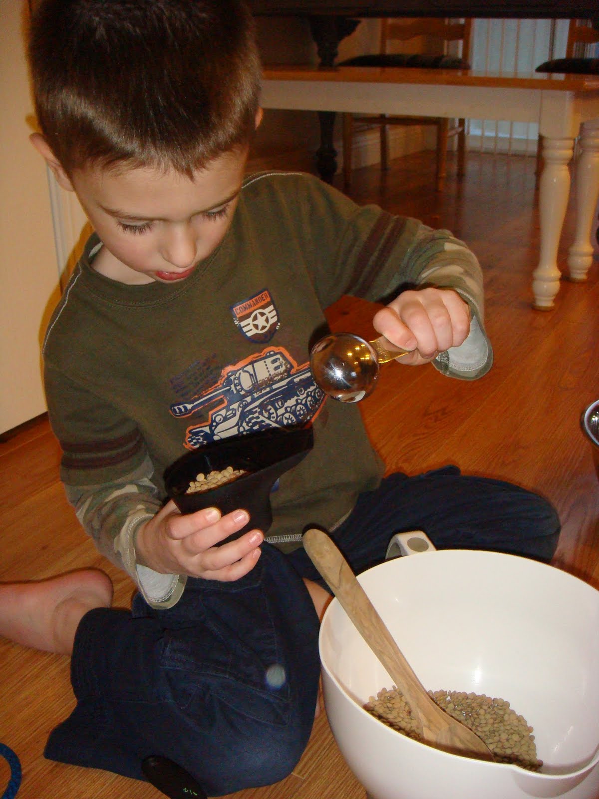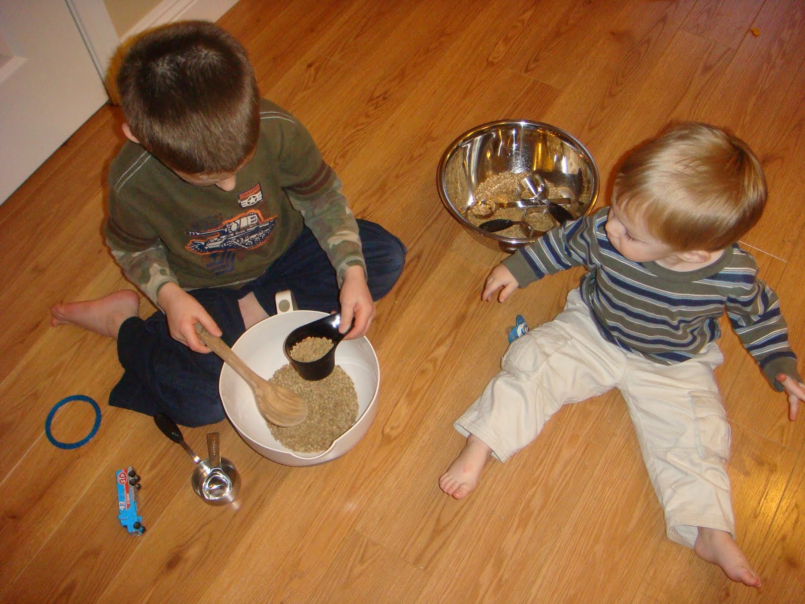 So I put some old lentils in a bowl and let the boys play with measuring spoons and such while I made dinner one night. Carson really enjoyed it, and Tucker did for a few minutes and then started eating them.