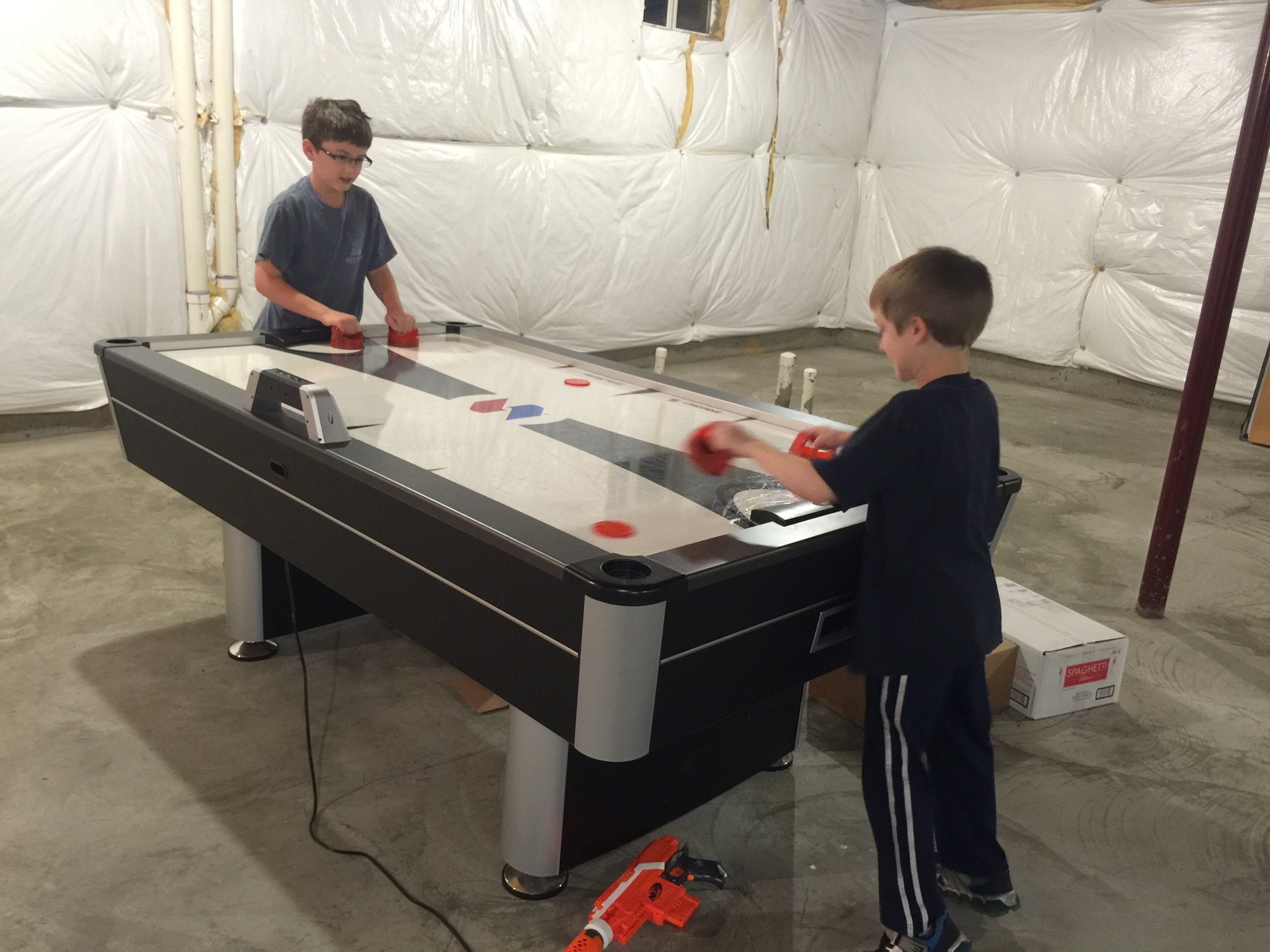 Our neighbors in Marietta were getting rid of this air hockey table, so they gave it to us. Now it stands in the large, unfinished basement - yay! The kids love it, of course.