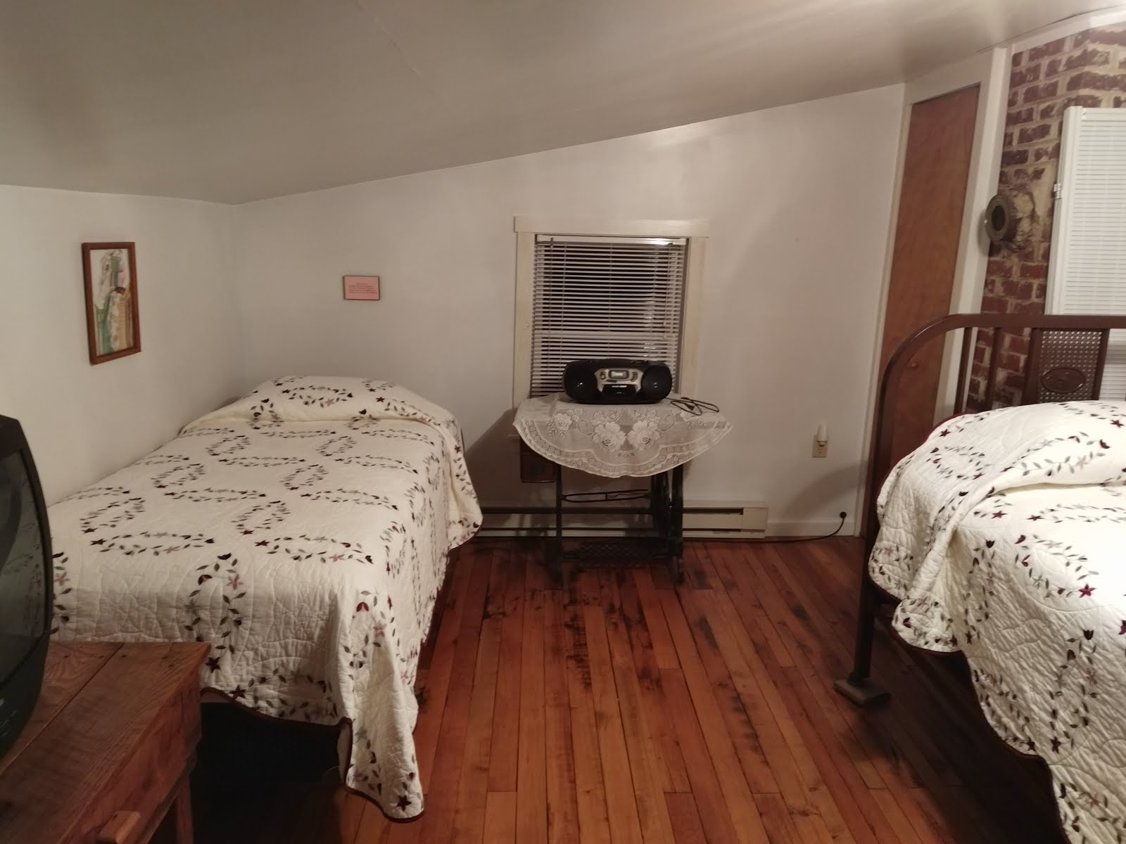 Upstairs, the rooms were very cozy, especially this one with the slanty roof. You can see an old vent pipe on the bricks in this room, every room has one covered up with a plate. Very old wood floors. This house was originally built to house work crew making hay in 1904. In the 1920s, the Wilson Family moved in and extra rooms were added.